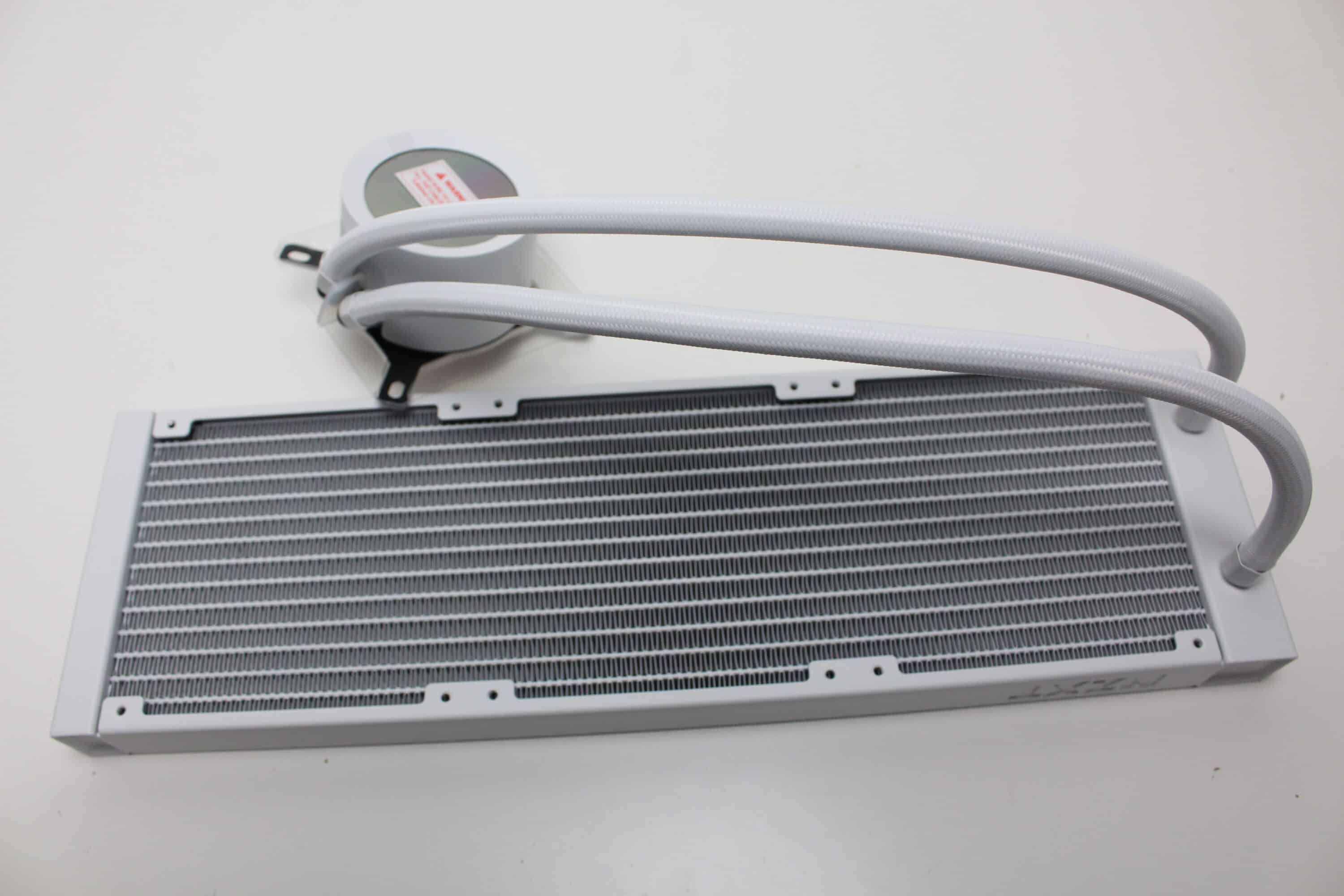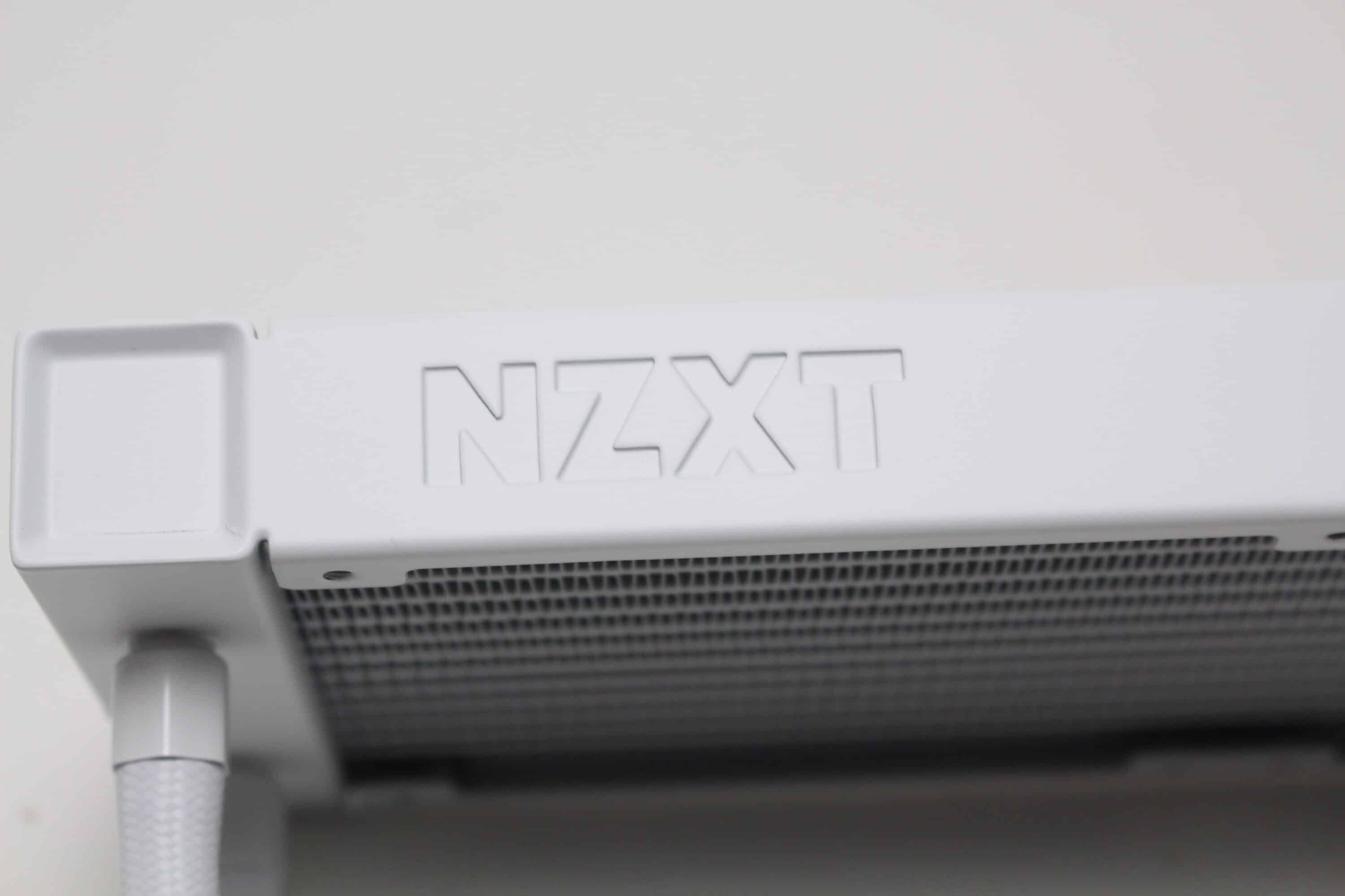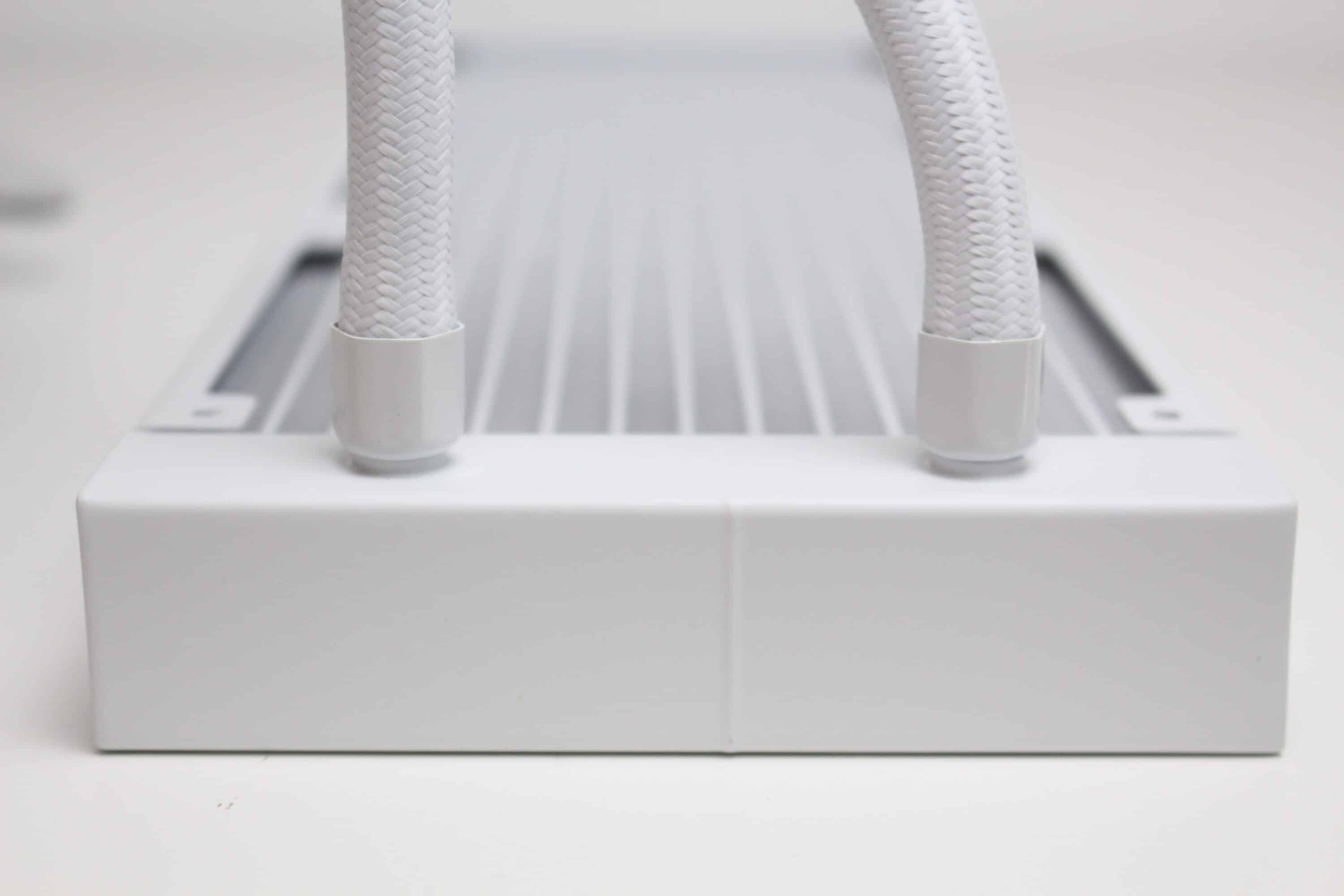 The 420 millimeter long hoses were pressed into metal sleeves on both the radiator and the pump. Unfortunately, this means that the compact water cooling system cannot be serviced or refilled. Instead, NZXT installs two swivel hose joints on the pump block and encases the hoses in a white nylon sleeve. This improves the kink protection and, of course, the appearance.