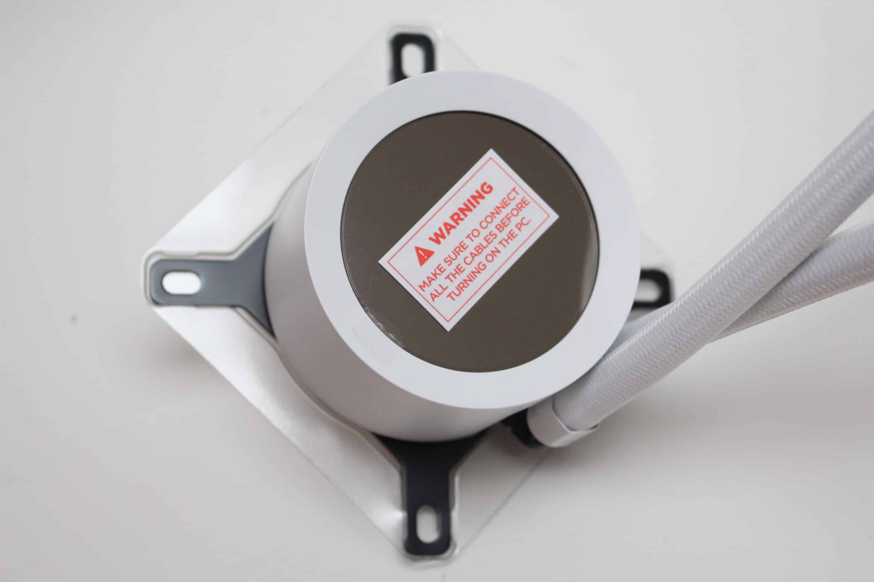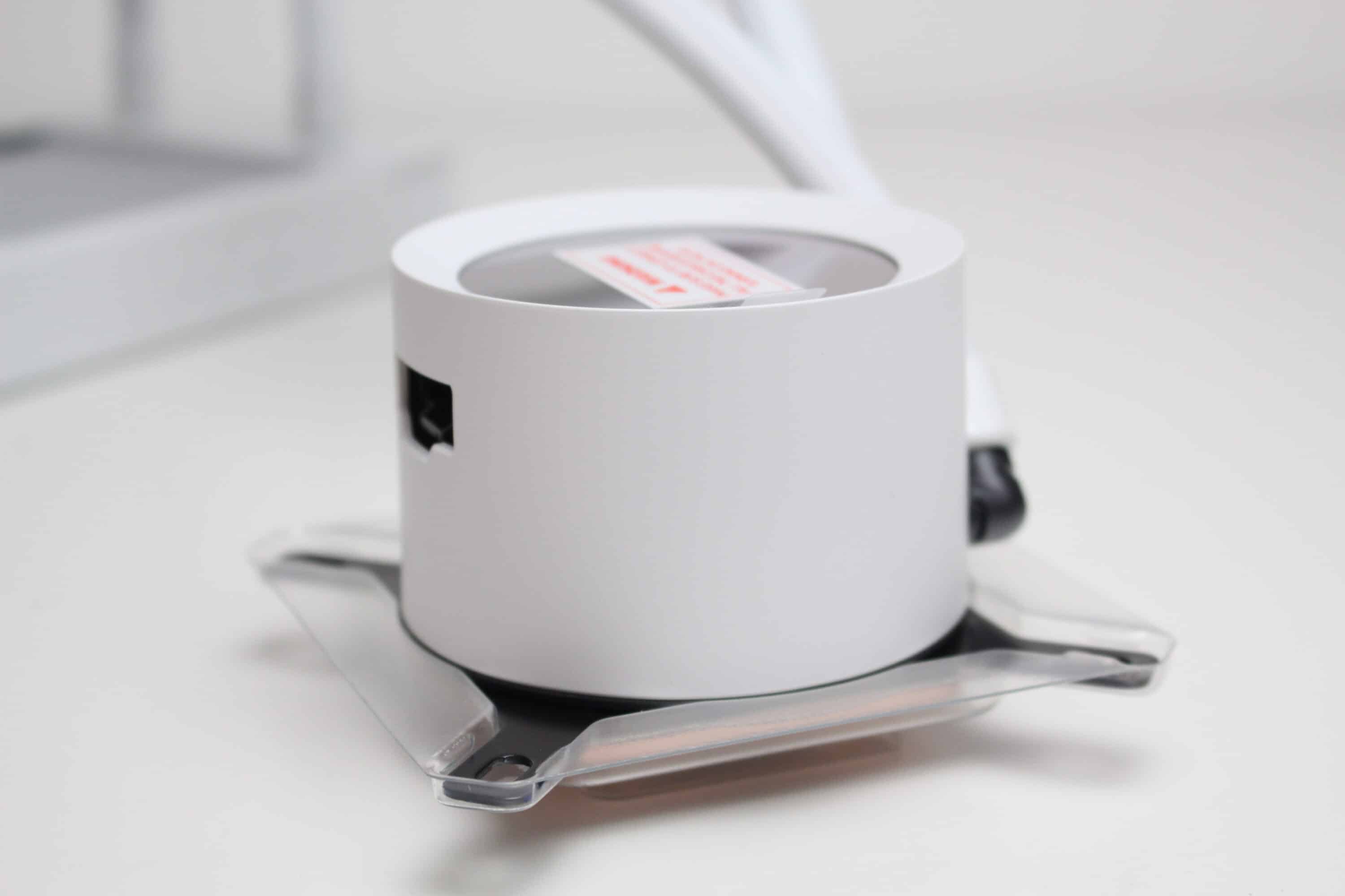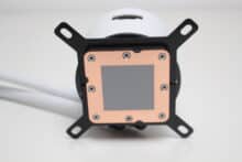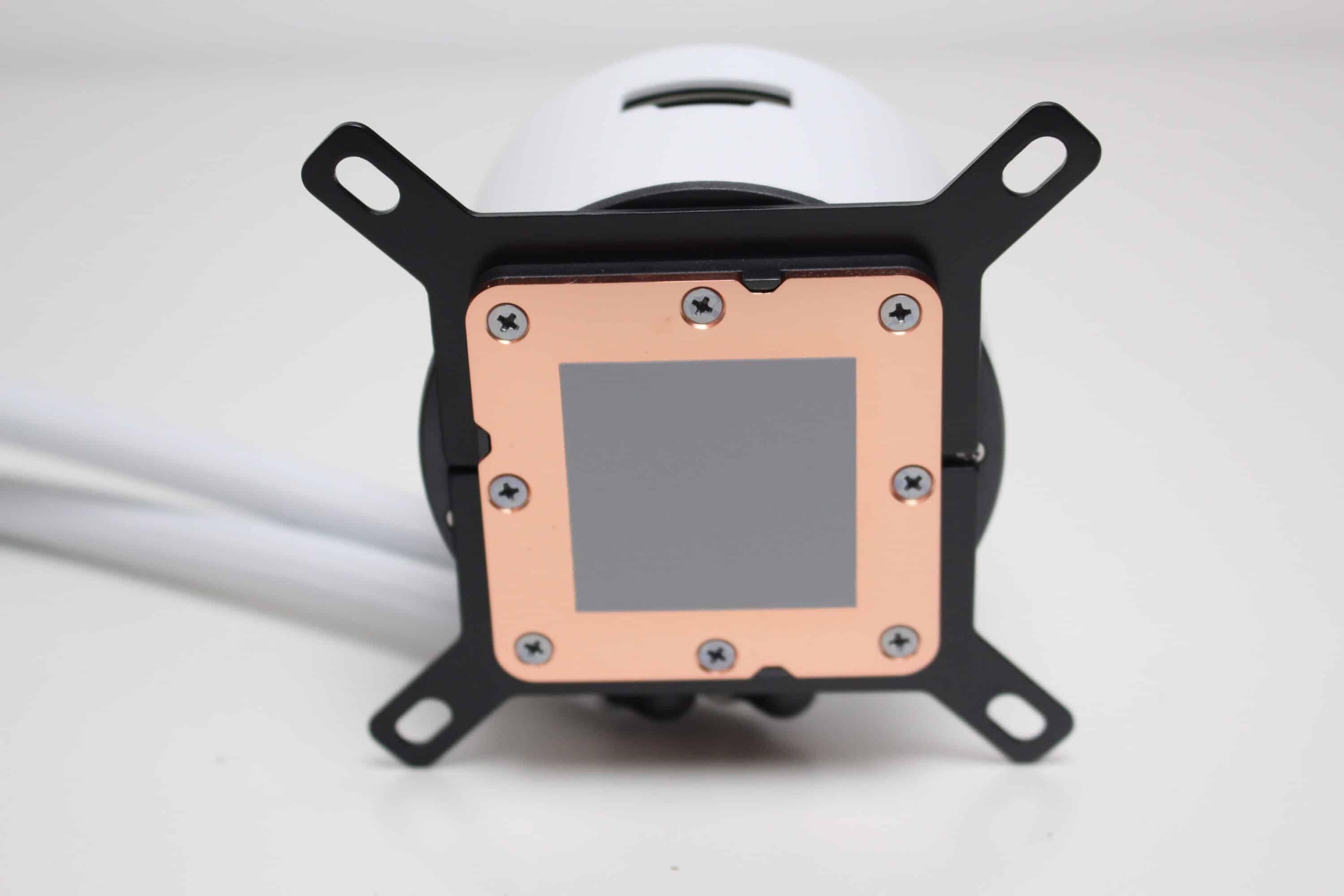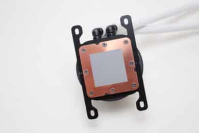 The pump block of the NZXT Kraken Plus 360 RGB hardly differs visually from those of the previous Kraken models. NZXT has designed the block, which is made of aluminum and plastic, to be round and also painted white. The manufacturer has installed a 1.54″ display underneath the reflective lid and a copper base plate with pre-applied thermal paste at the bottom ensures proper absorption of the CPU waste heat. NZXT specifies a speed range of 1200 to 2800 rpm for the pump.