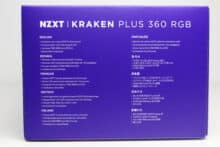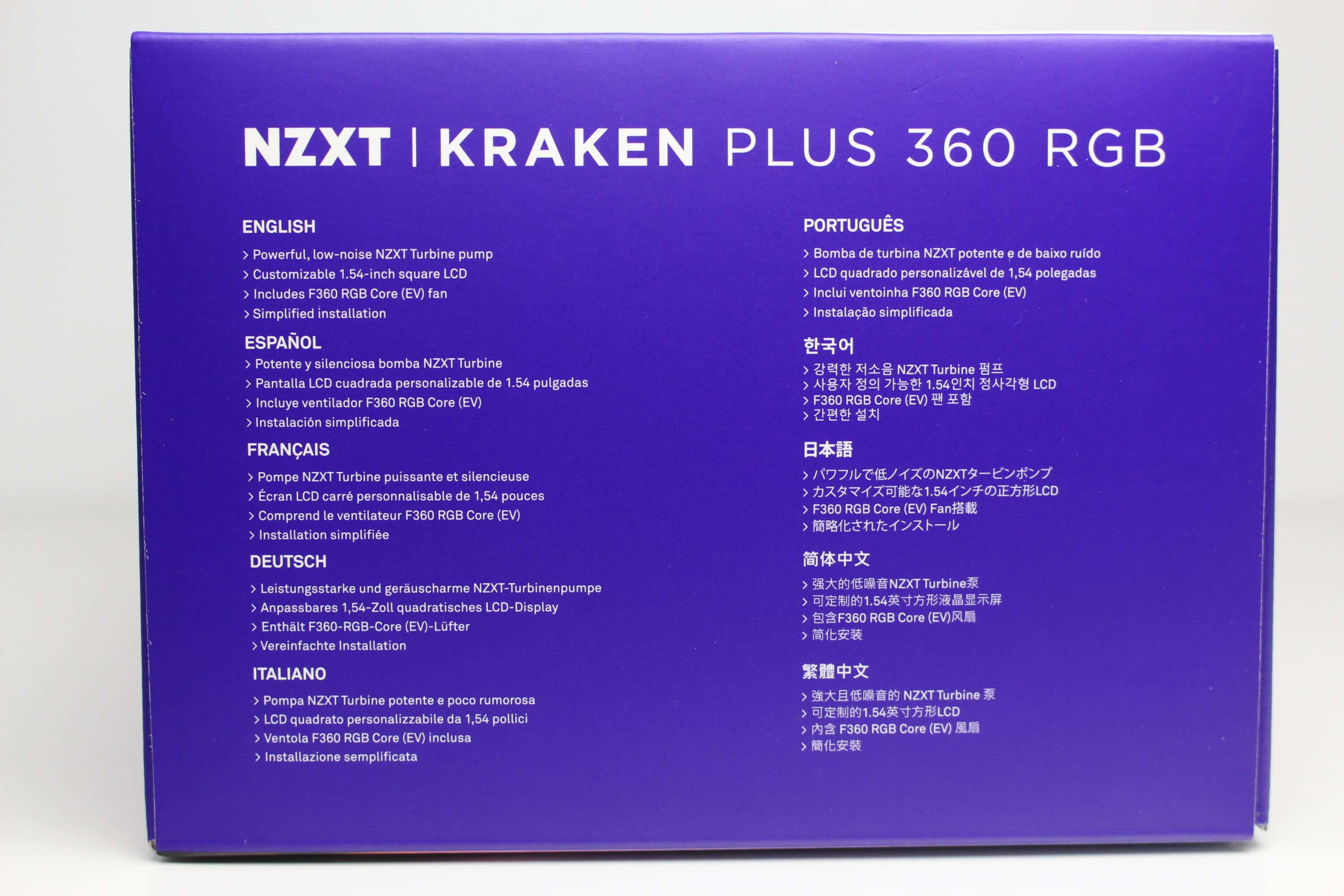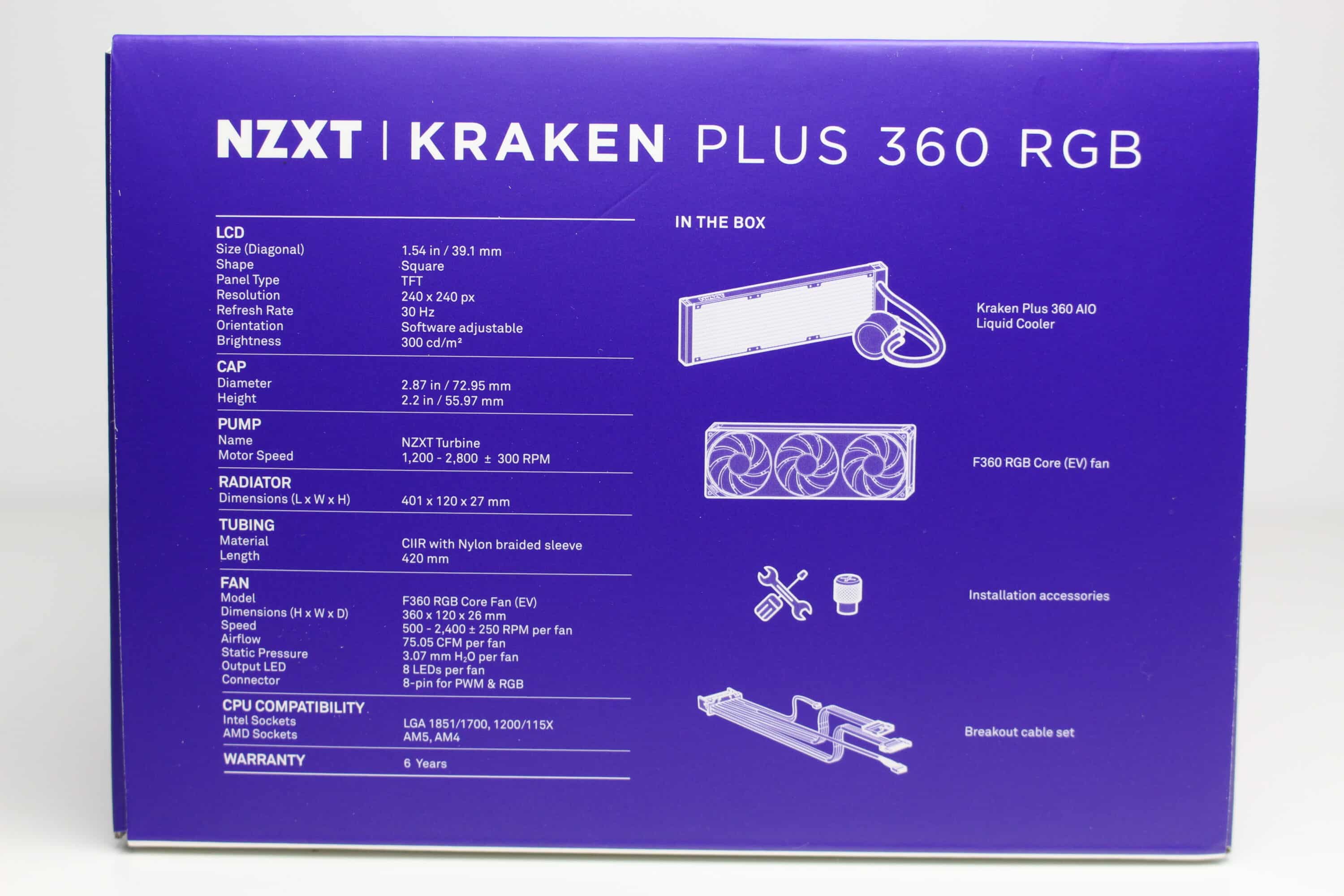 NZXT packs the Kraken Plus 360 RGB in strikingly designed and colorfully printed packaging. On the front, the manufacturer has placed a photo of the compact water cooling system and on the back you can see the product in its installed state as well as a list of important features. NZXT colors the sides of the box purple and prints a table with the technical data and technical drawings in white letters.