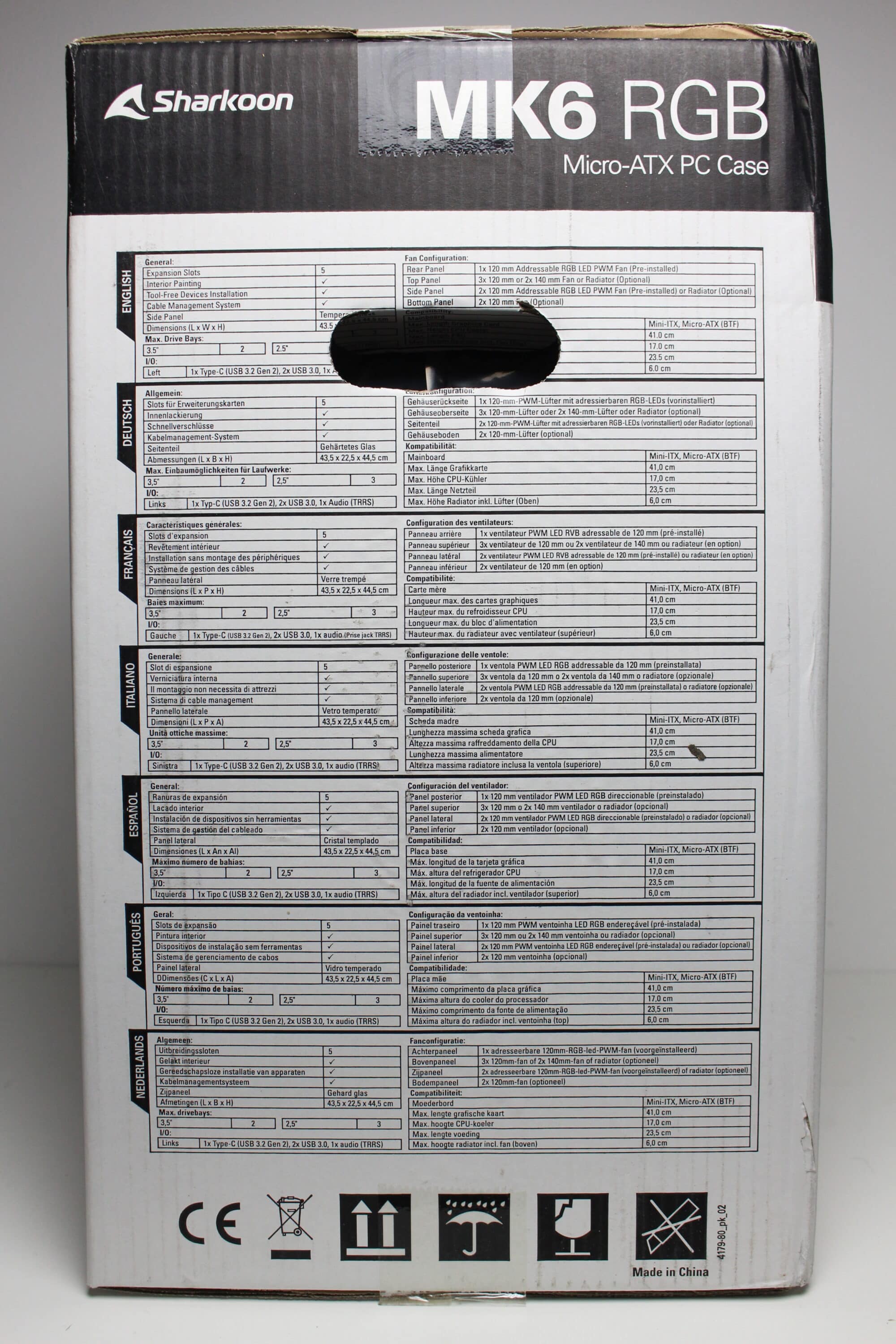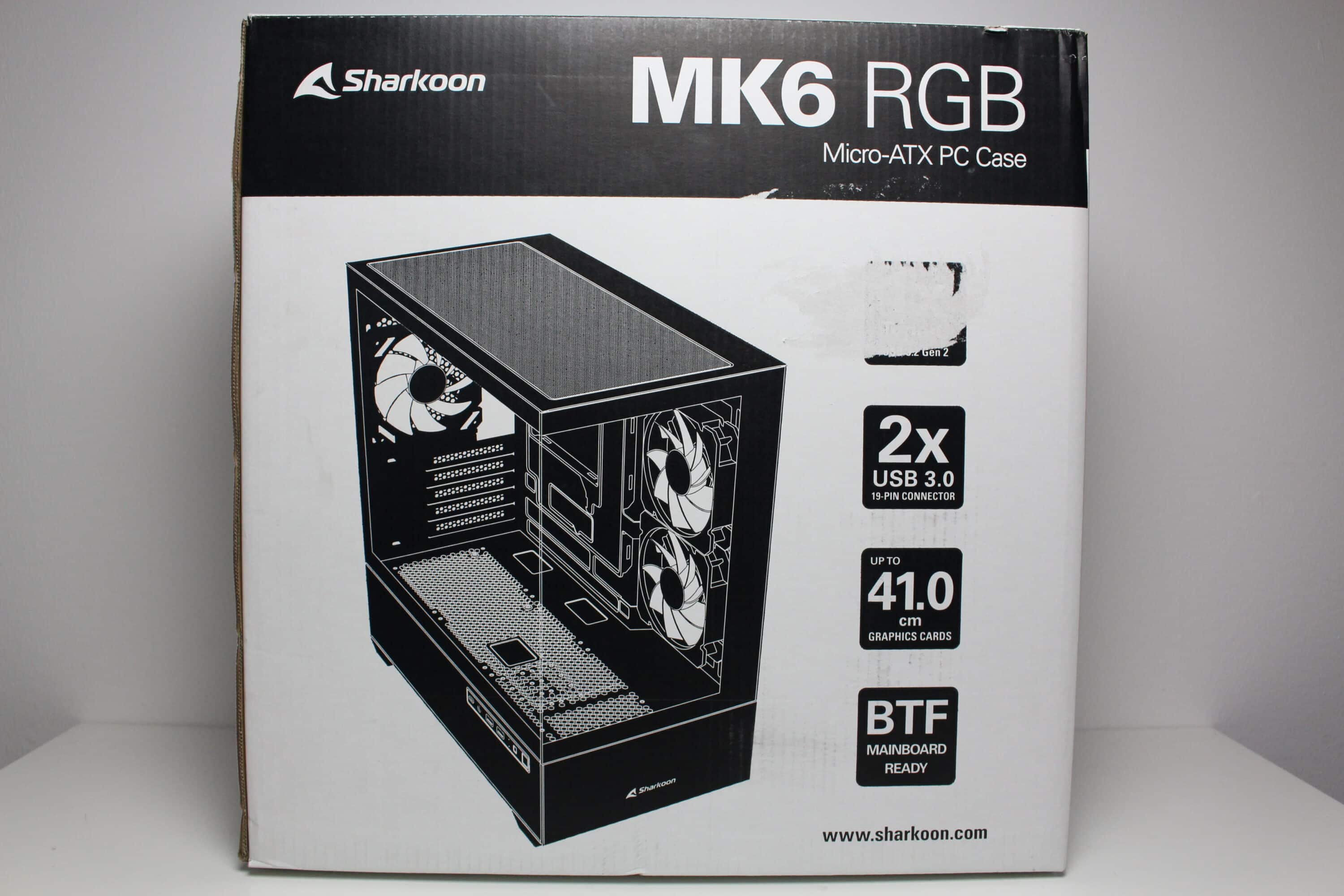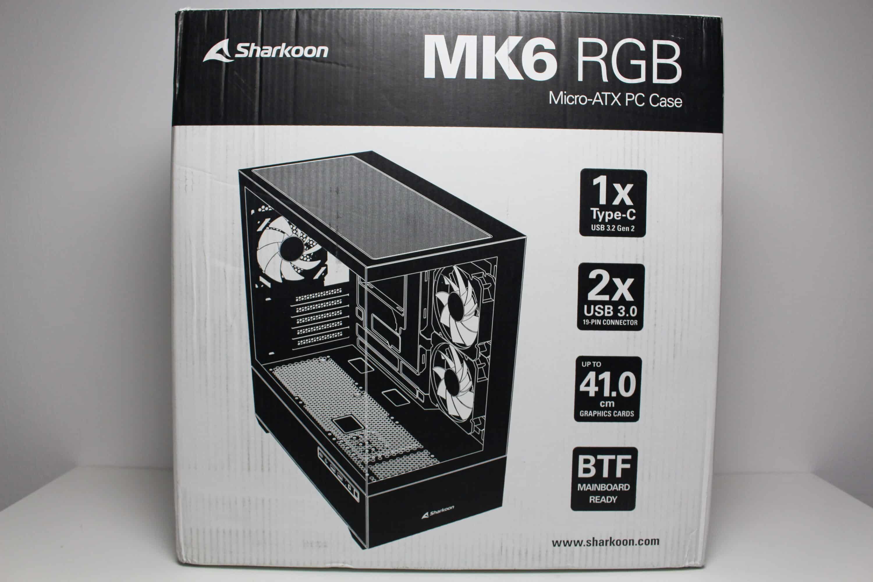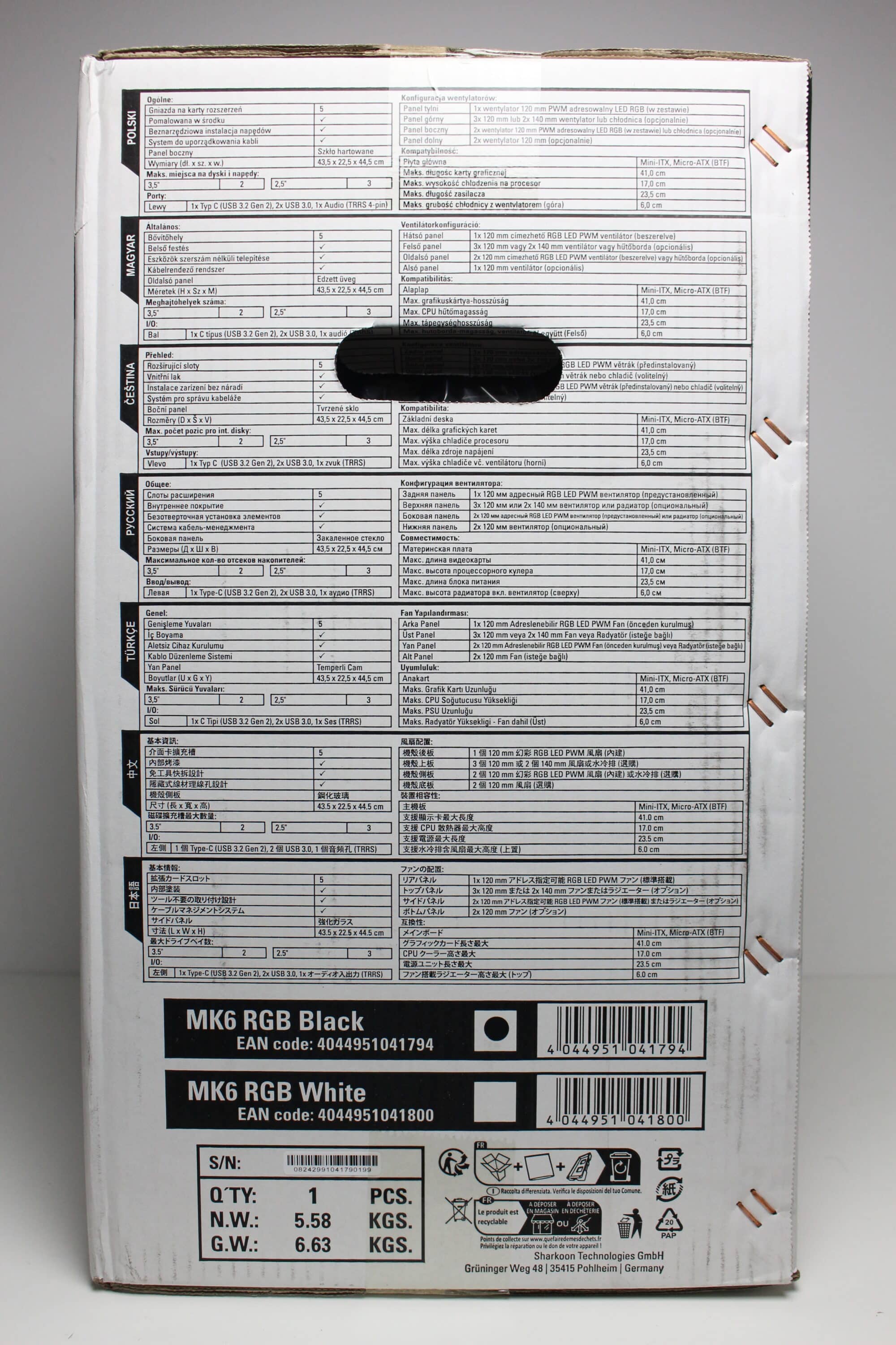 The design of the Sharkoon MK6 RGB box can be described as inconspicuous. The cardboard is printed in white and black on the outside and shows two images of the mini-tower as well as a list of the most important features of the MK6 RGB. Sharkoon has also placed several tables on the side with all the technical data in different languages.