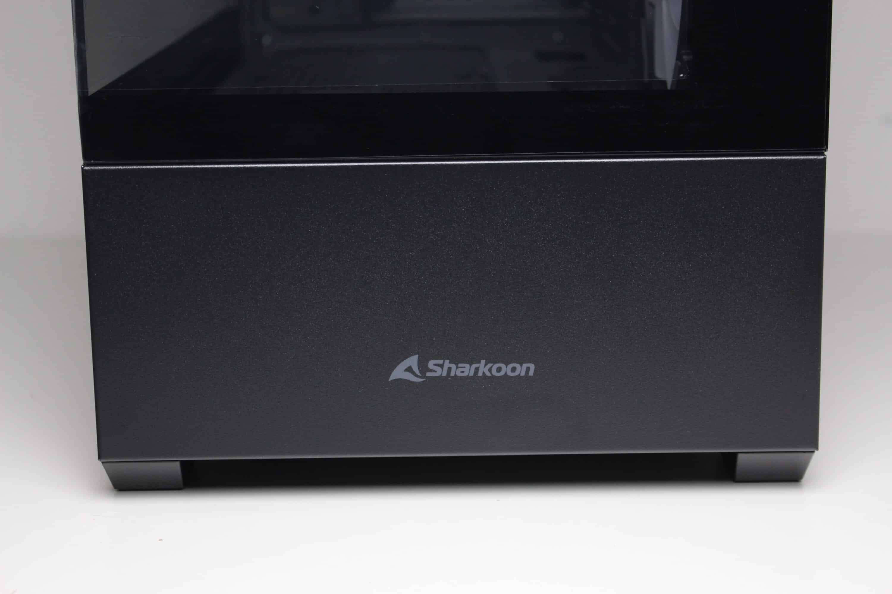 Visually, the Sharkoon falls into the category of “aquarium cases”. The manufacturer has installed a tempered glass viewing window on both the front and the side. The glass on the front of the black version is slightly tinted and can be removed if necessary. However, removal requires the removal of several screws. Below the viewing window, Sharkoon has placed a steel panel with the manufacturer’s logo. If required, this can also be easily removed using the inserted push pins.