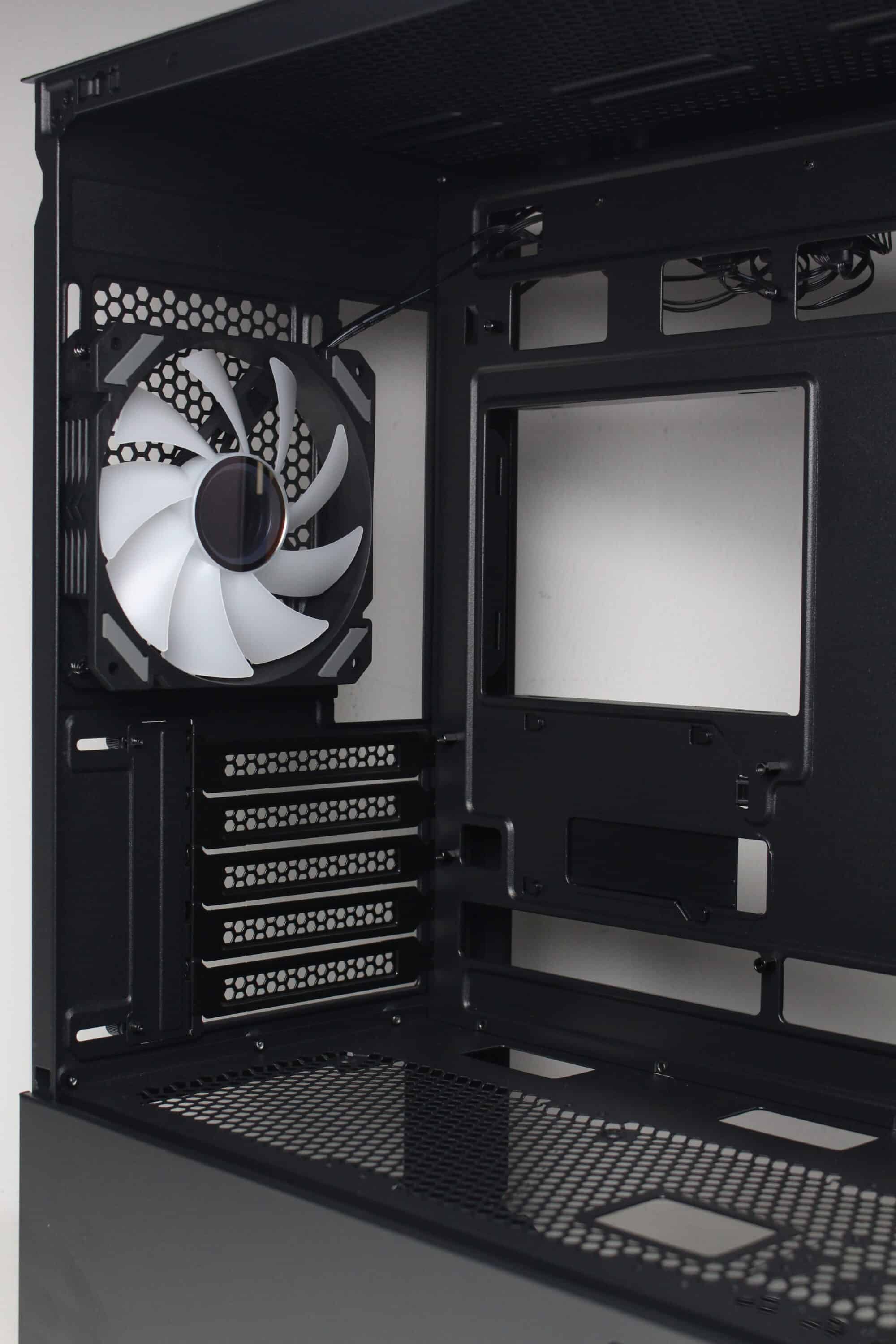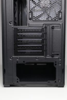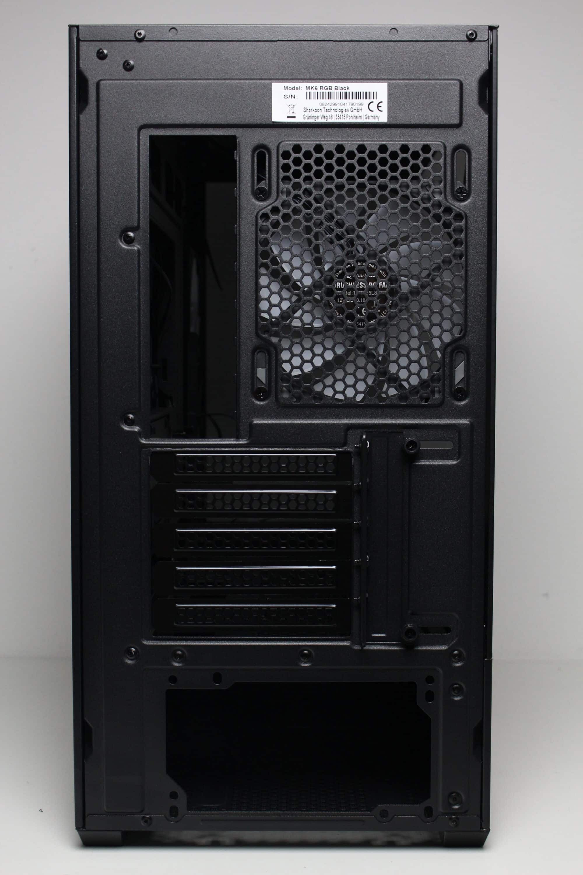 There are no surprises on the back of the Sharkoon MK6 RGB. In the lower area we find the mounting point for the power supply and above it five reusable and perforated PCI slot covers. In the upper area, Sharkoon mounts the first of three pre-installed 120 mm ARGB fans.