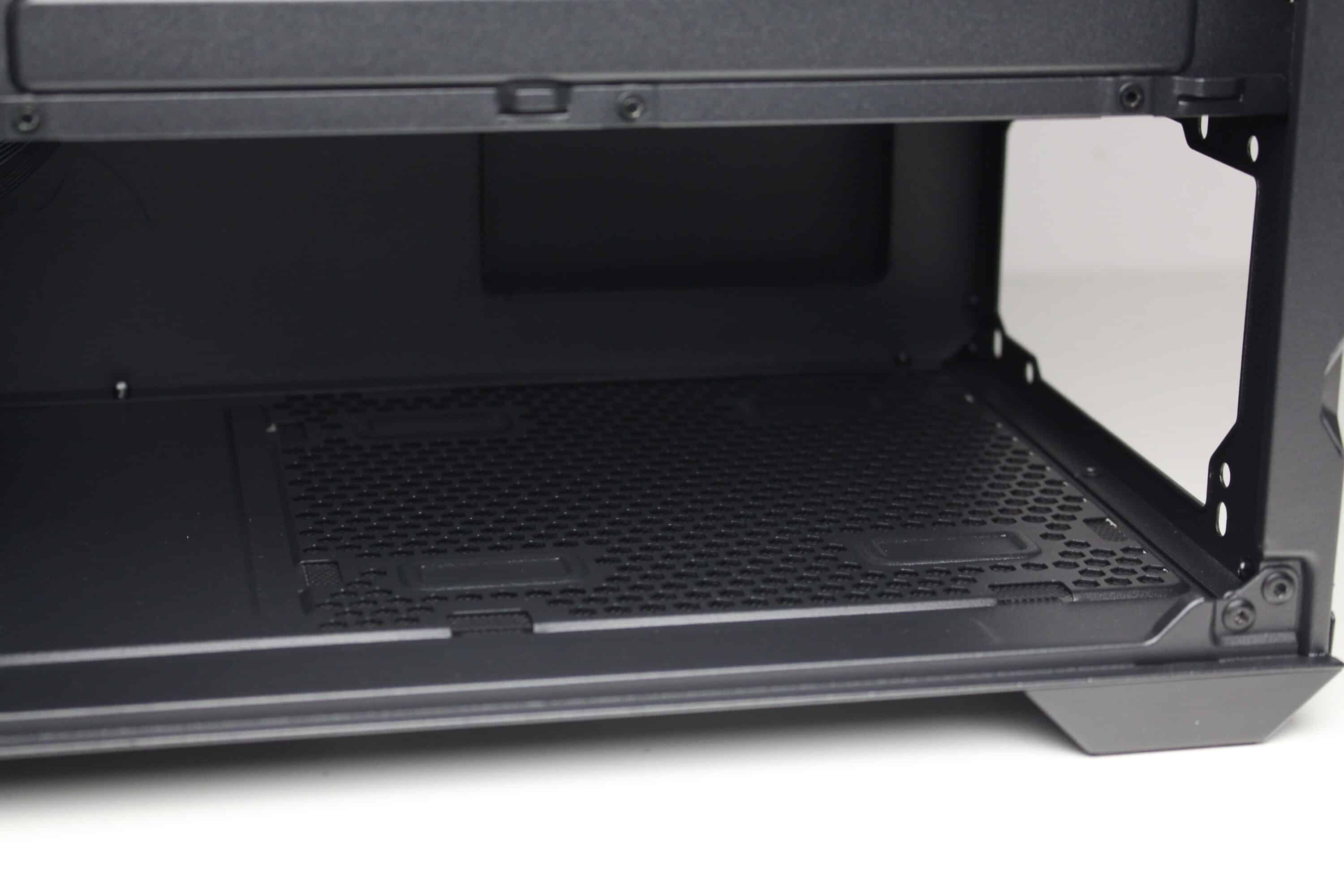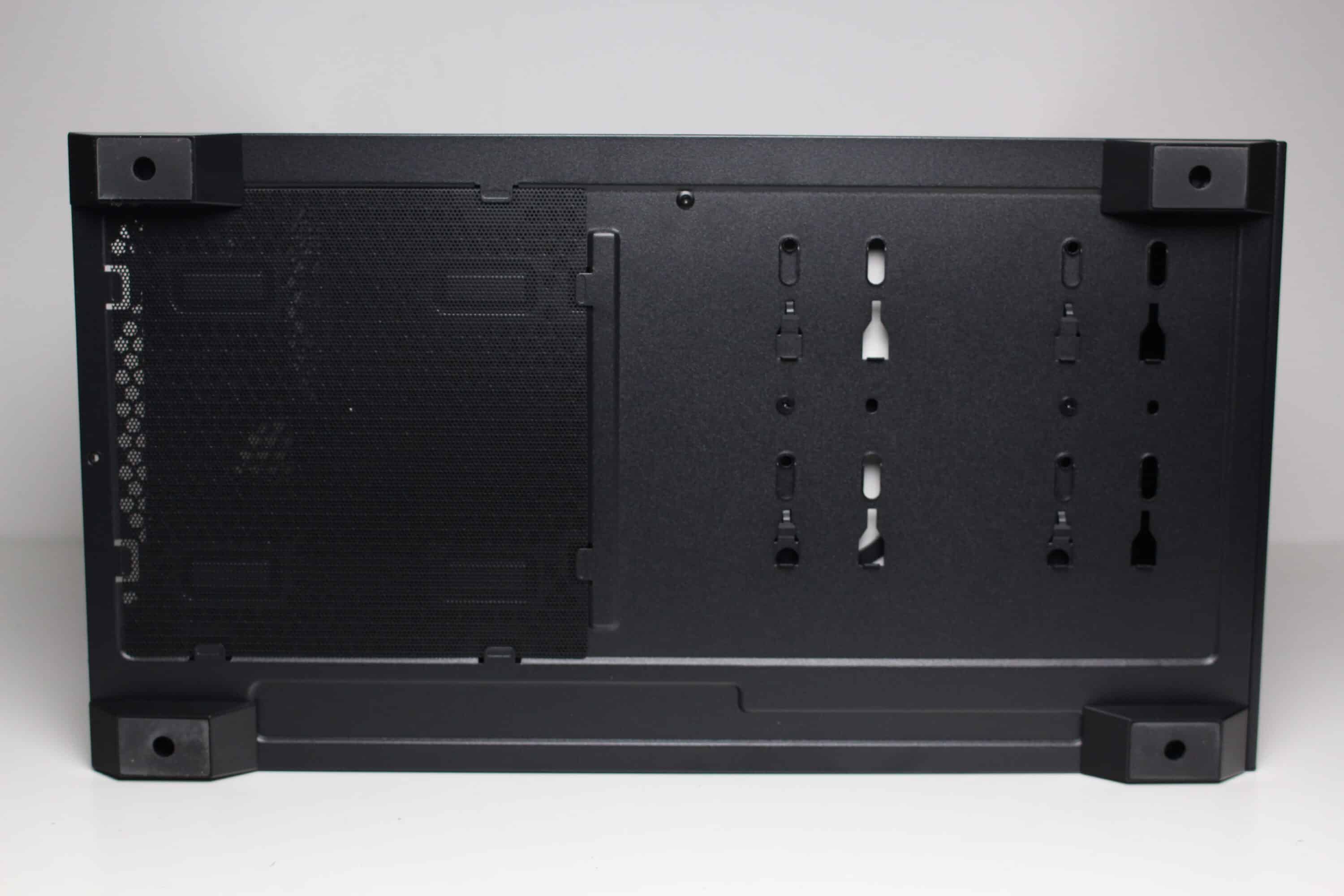 The underside of this mini tower also remains unspectacular. You can see a very large ventilation opening for the power supply unit and a mesh dust filter mat placed in front of it. The dust filter is attached using simple steel retaining lugs. In the front area, we find four mounting rails and two screws to secure the HDD cage.