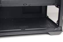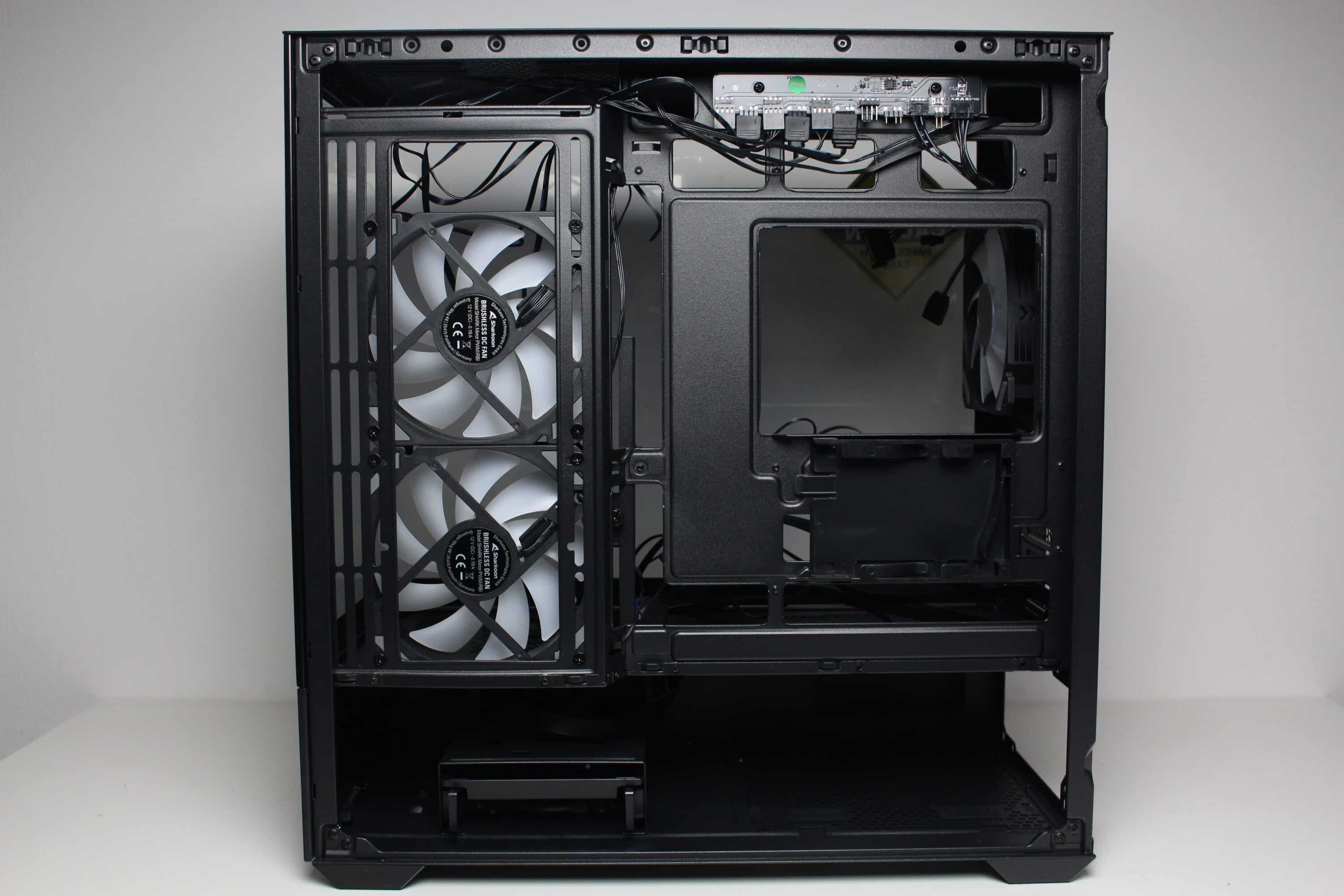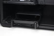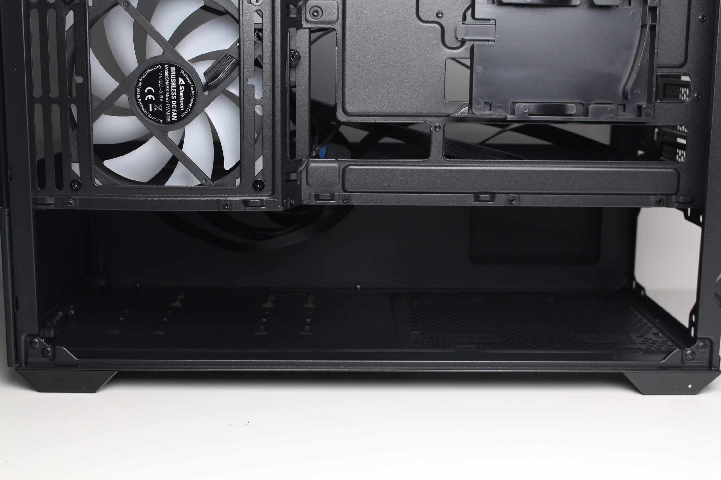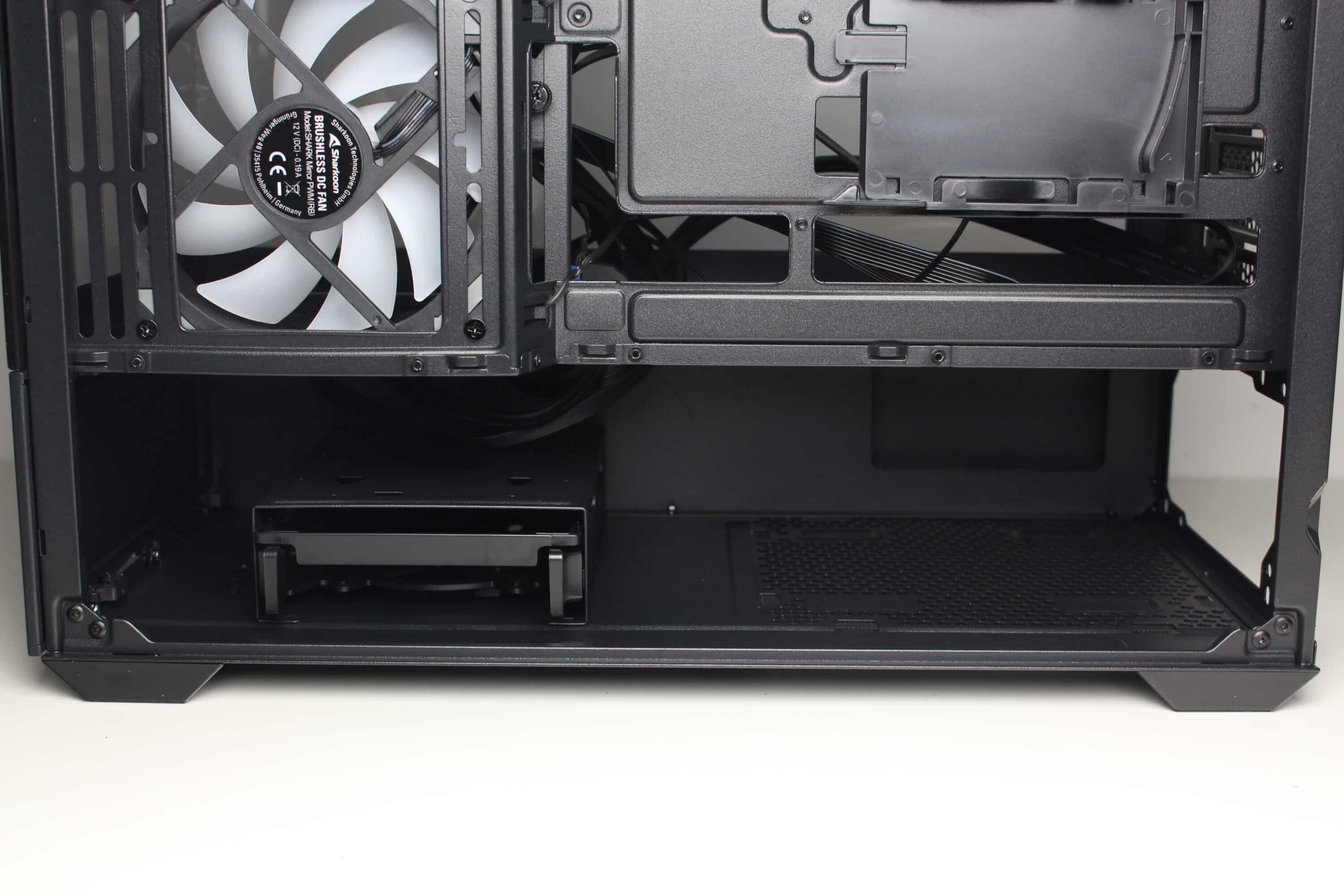 At the rear of the motherboard tray, there is around 20 millimeters of space for cables and numerous attachment points or eyelets for cable ties. The power supply compartment offers space for a normal ATX power supply, which is attached to the rear. Sharkoon has completely dispensed with decoupled mounting. The manufacturer mounts a modular HDD cage in front of the power supply unit, which can be installed in two different positions.