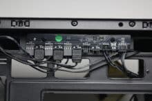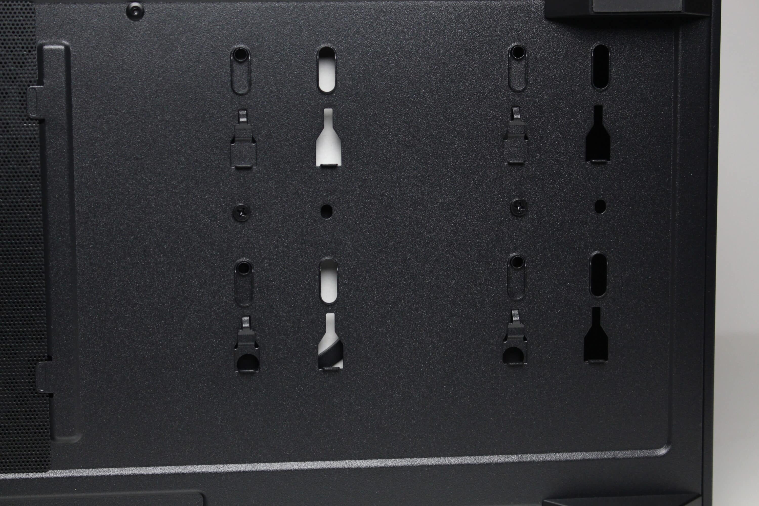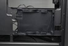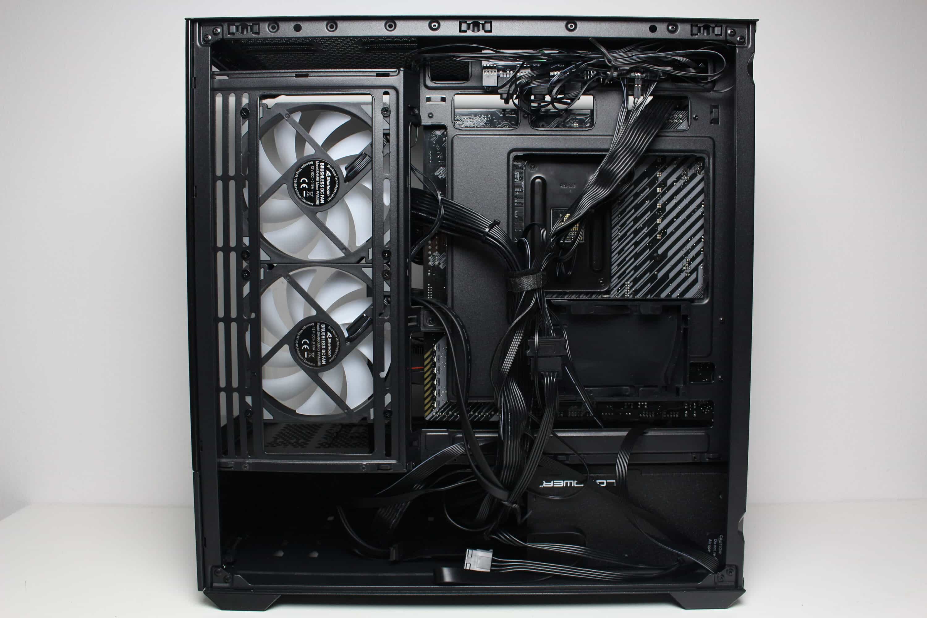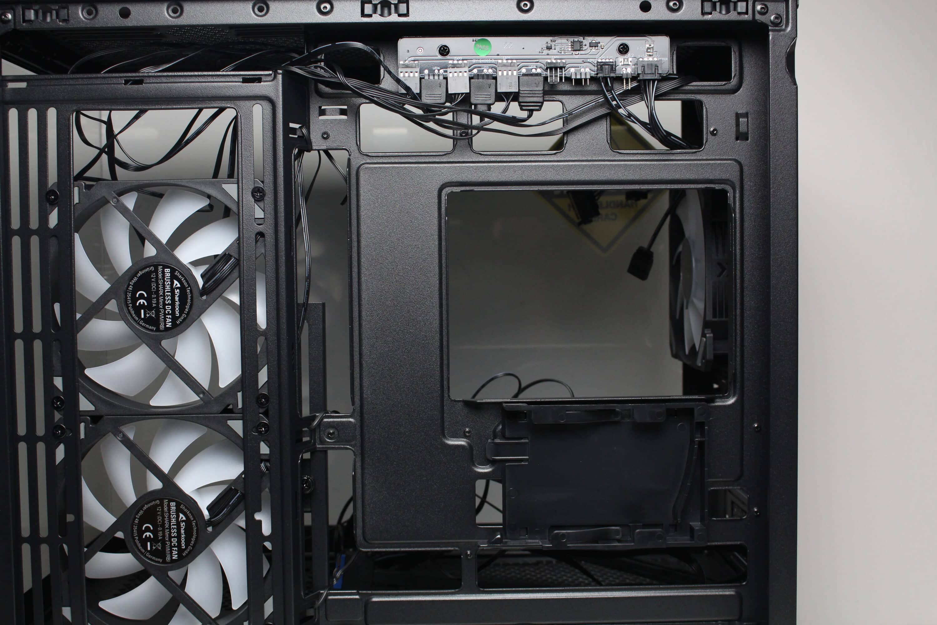 At the rear of the motherboard tray, there is around 20 millimeters of space for cables and numerous attachment points or eyelets for cable ties. The power supply compartment offers space for a normal ATX power supply, which is attached to the rear. Sharkoon has completely dispensed with decoupled mounting. The manufacturer mounts a modular HDD cage in front of the power supply unit, which can be installed in two different positions.