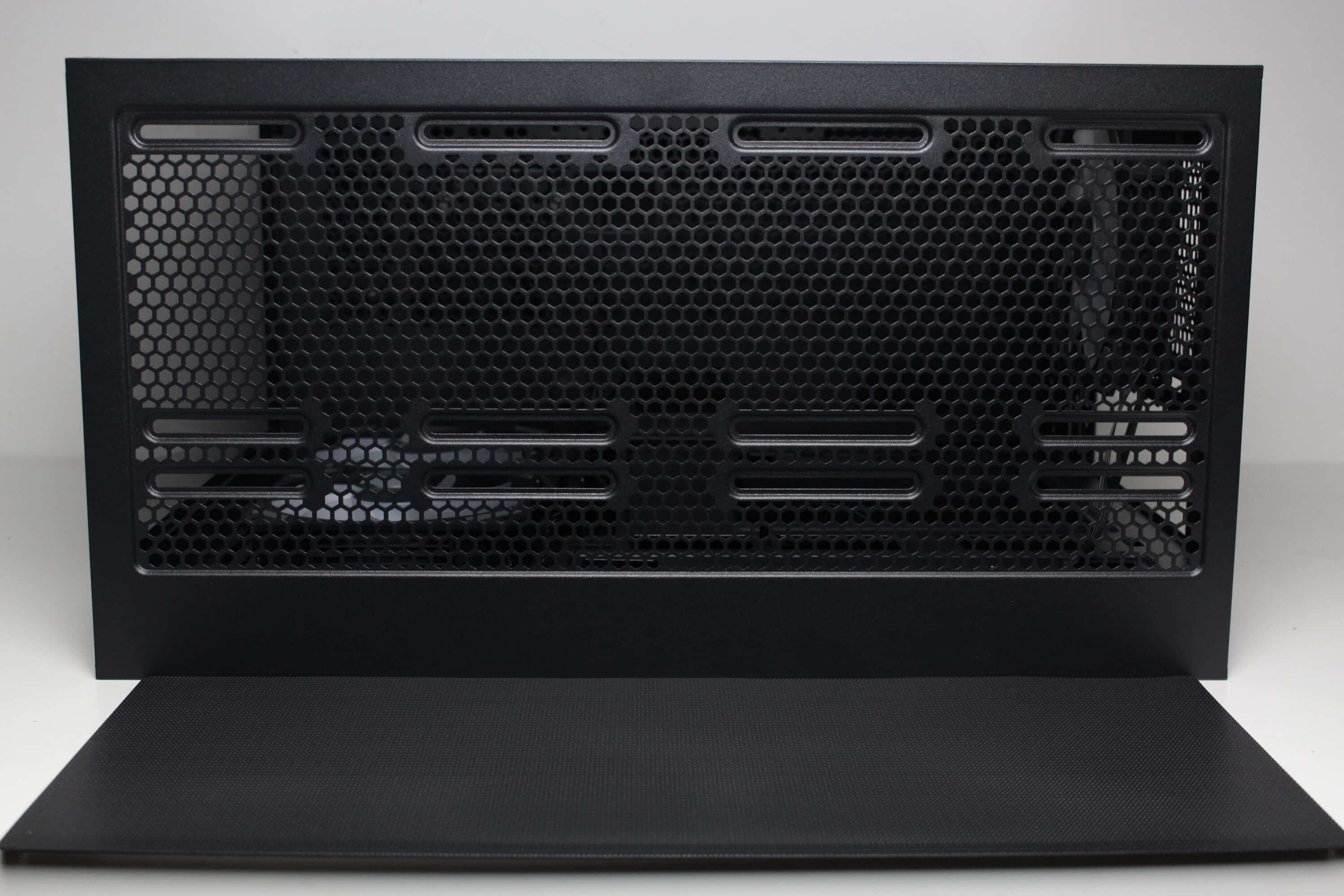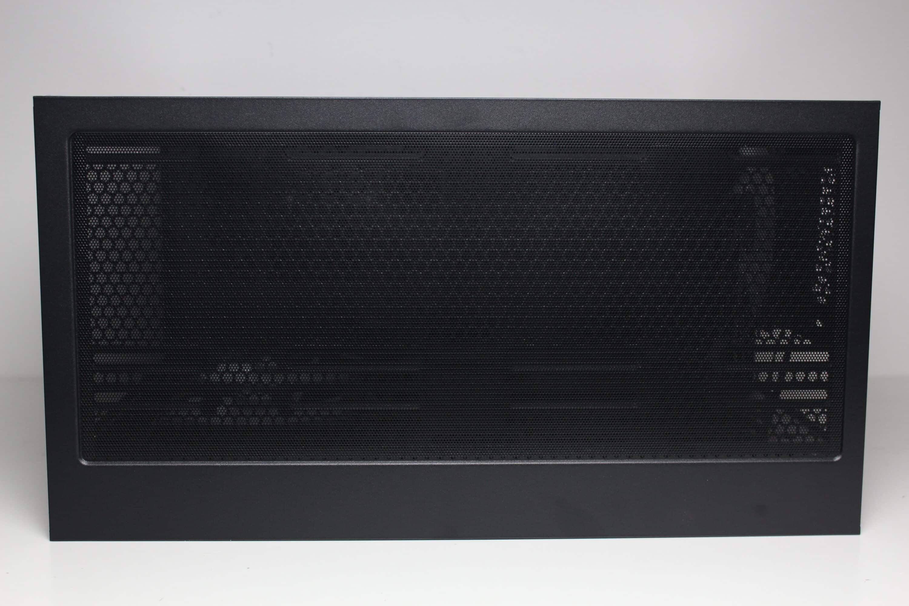 The design of the lid has been designed to achieve a high airflow. It has a large fan grille with outwardly offset mounting rails for up to three 120 mm or two 140 mm fans or correspondingly large radiators. Sharkoon has also placed a magnetic mesh dust filter mat above the grille to protect against dust and improve the appearance.
