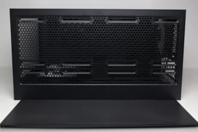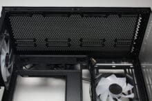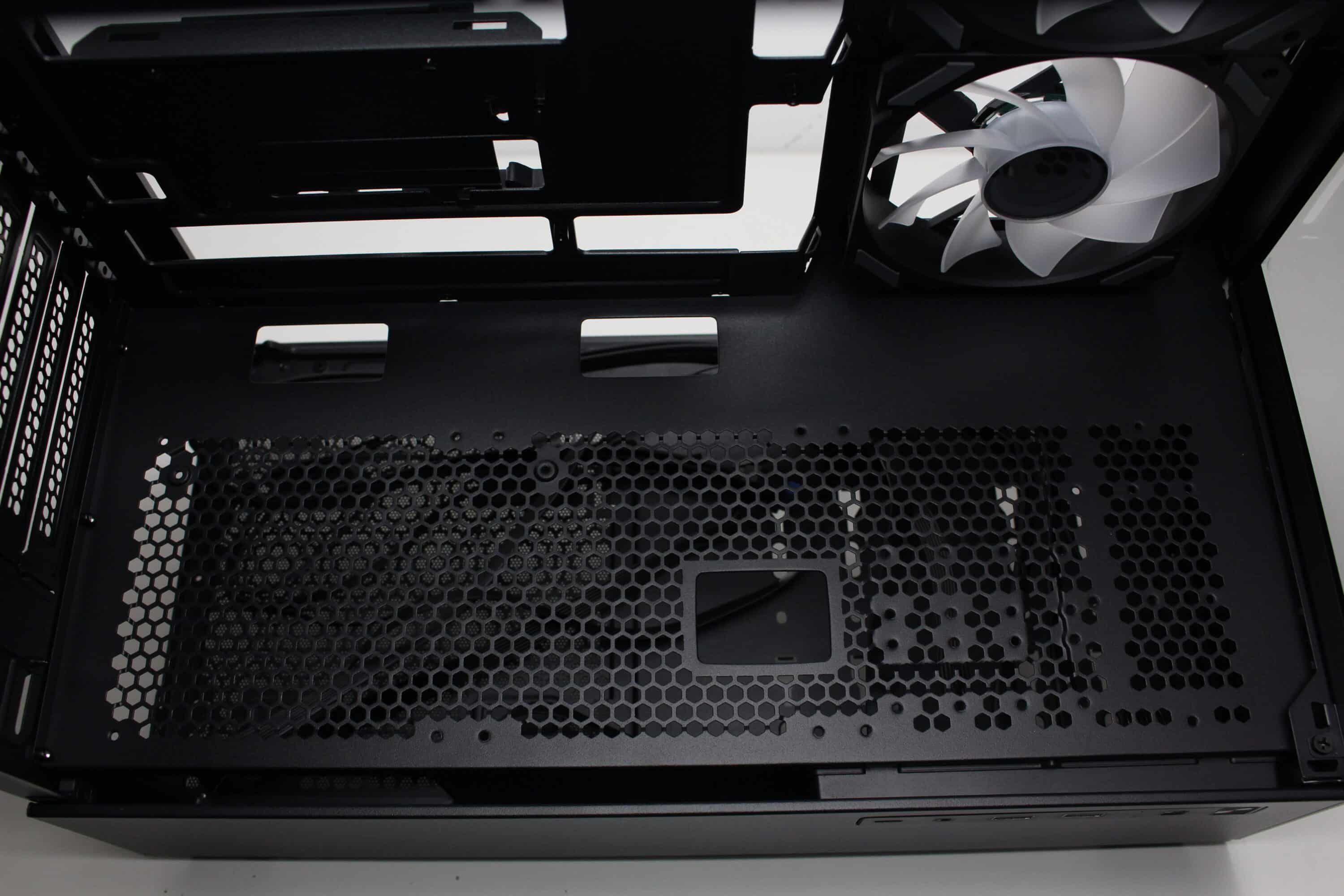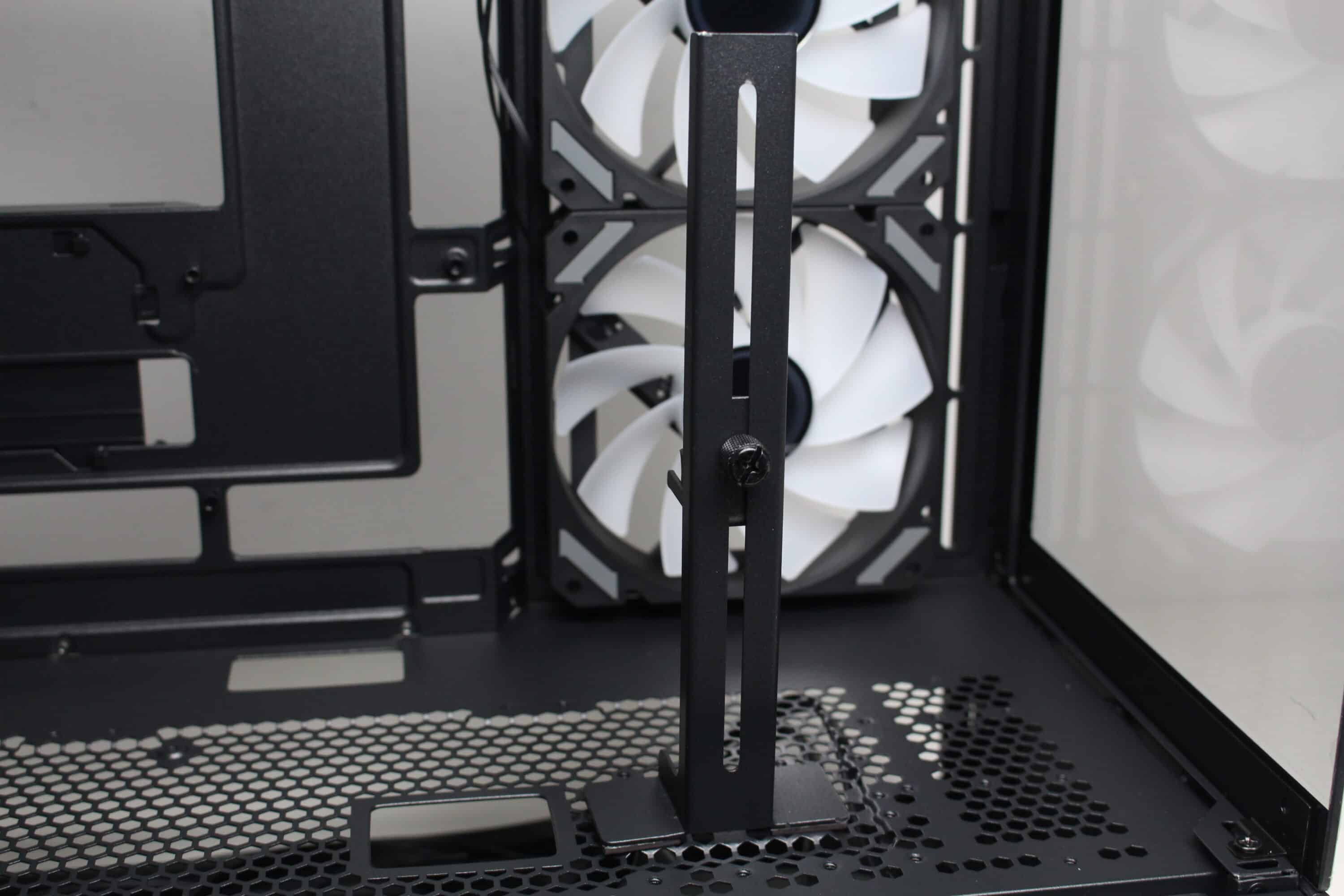 If you lower your gaze, you can see the perforated power supply cover. The manufacturer has equipped this with three cable grommets and numerous other holes that can be used to mount up to two 120 mm fans. Corresponding screws are included in the scope of delivery. The only question is where the air should come from, as the only grille in the base of the case is occupied by the power supply unit. The scope of delivery also includes a magnetic GPU holder that can be flexibly positioned on the power supply cover.