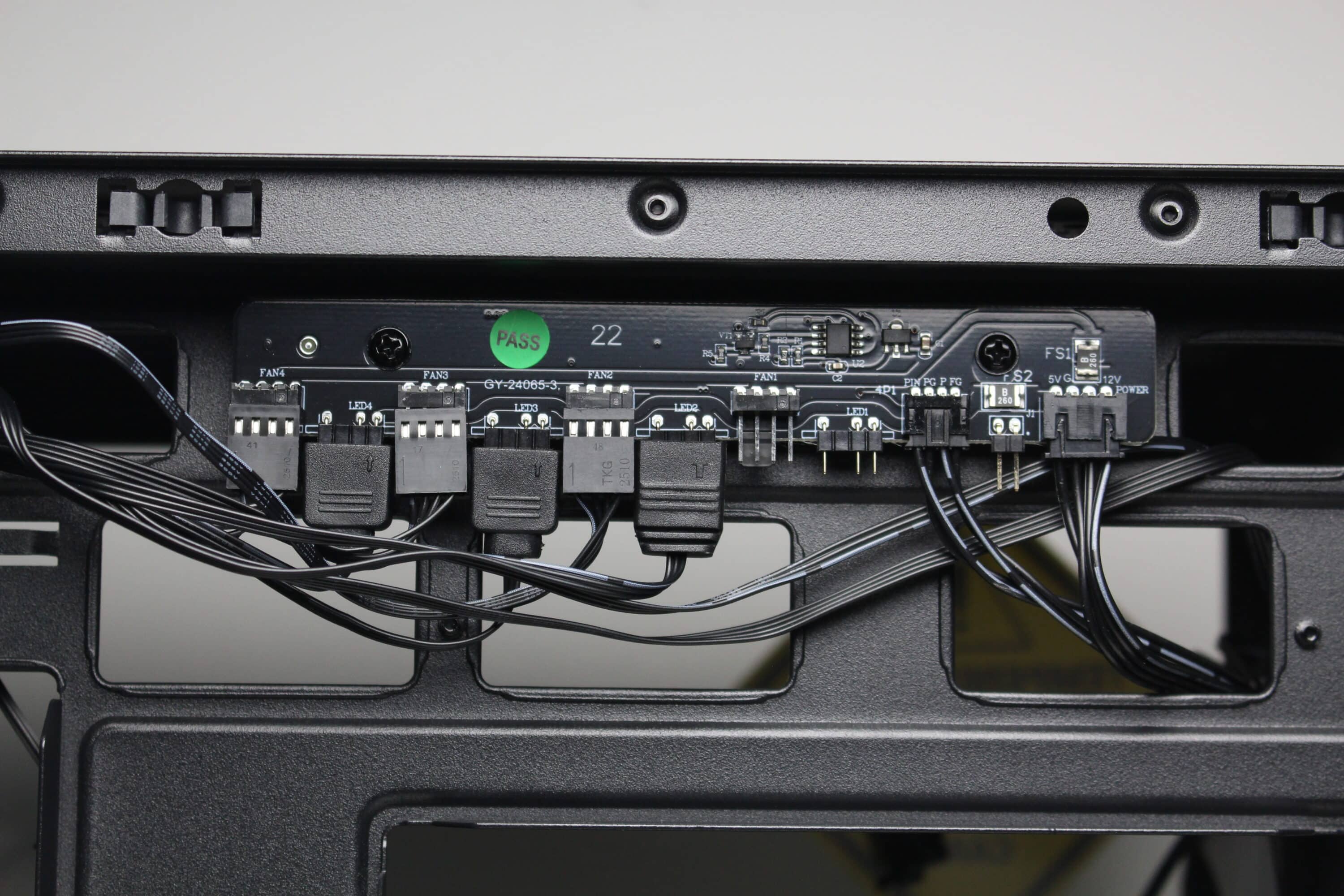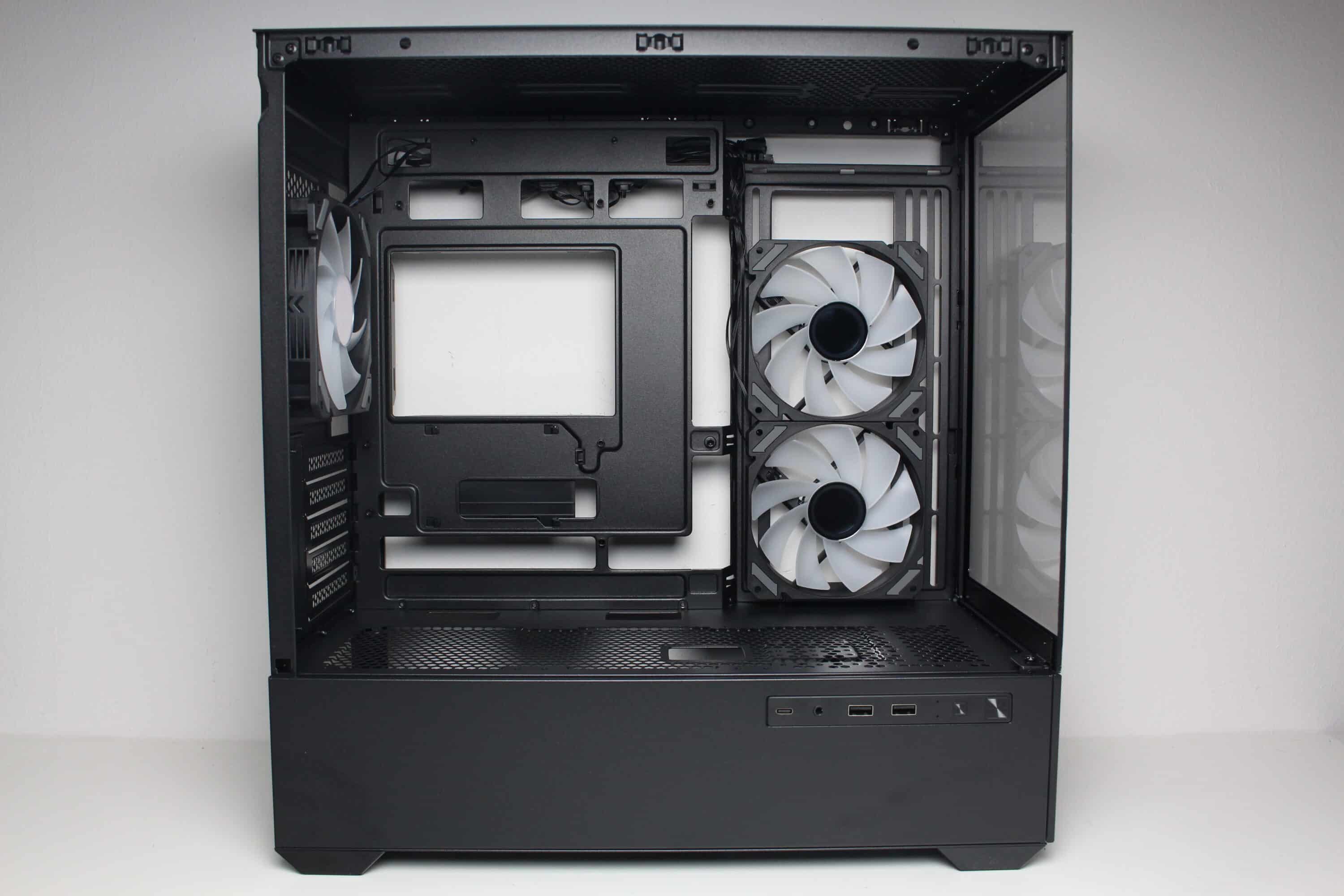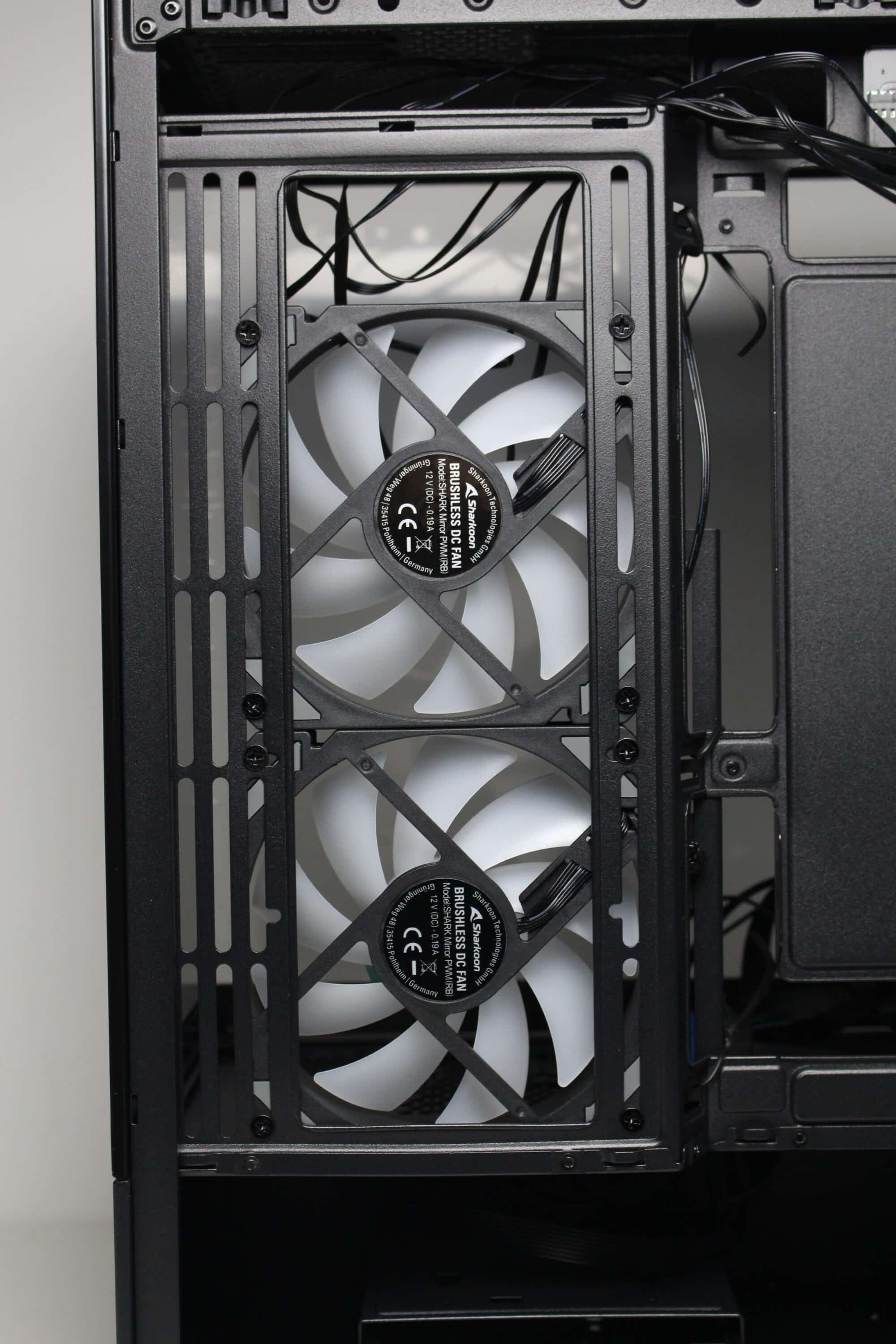 As the front of the MK6 RGB is made of glass, the fresh air has to find another way inside. For this purpose, Sharkoon equips the side mounting positions with two inverted ARGB fans, which can transport the cold air into the interior unhindered. A third fan at the rear then ensures that the heated air finds its way out again.