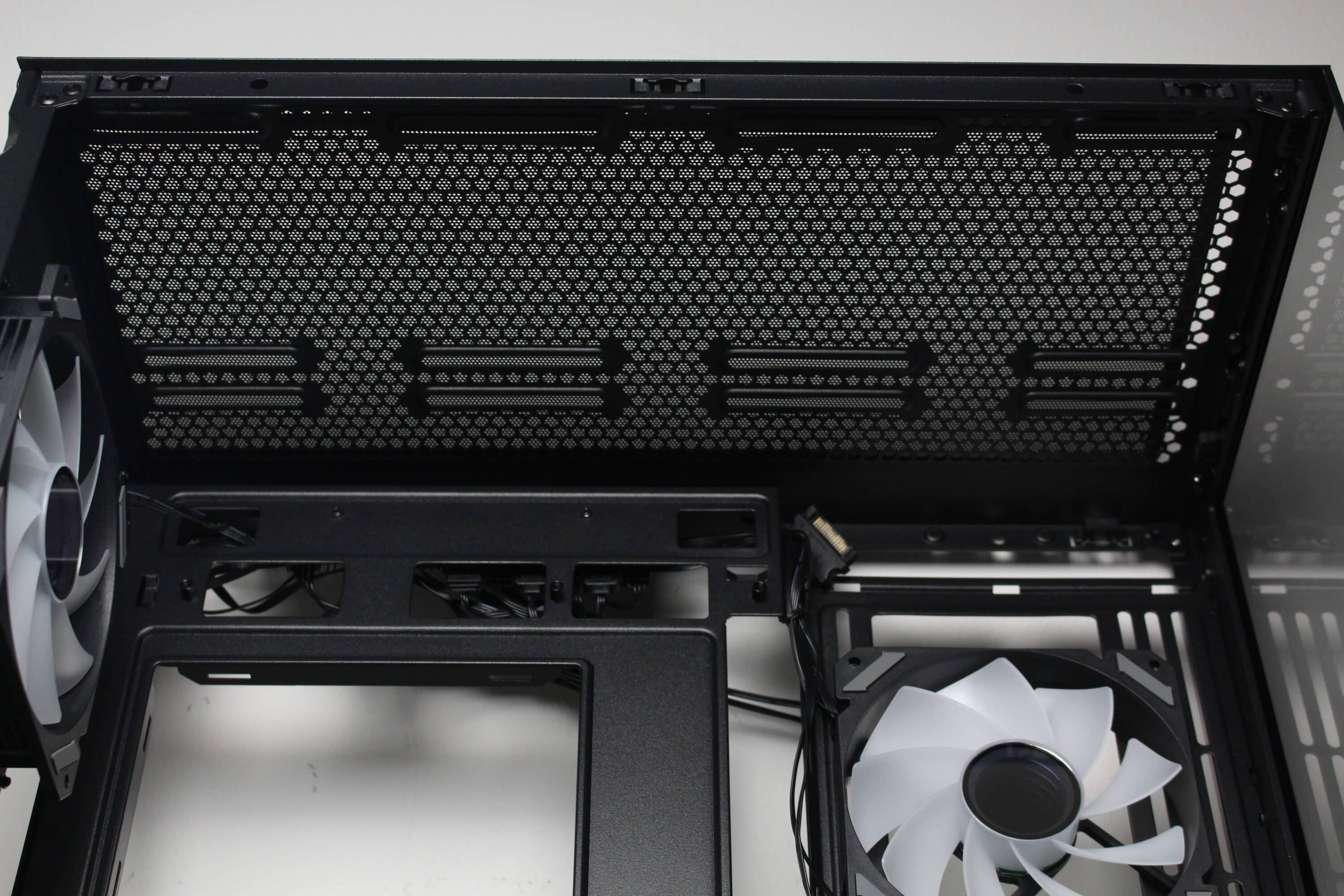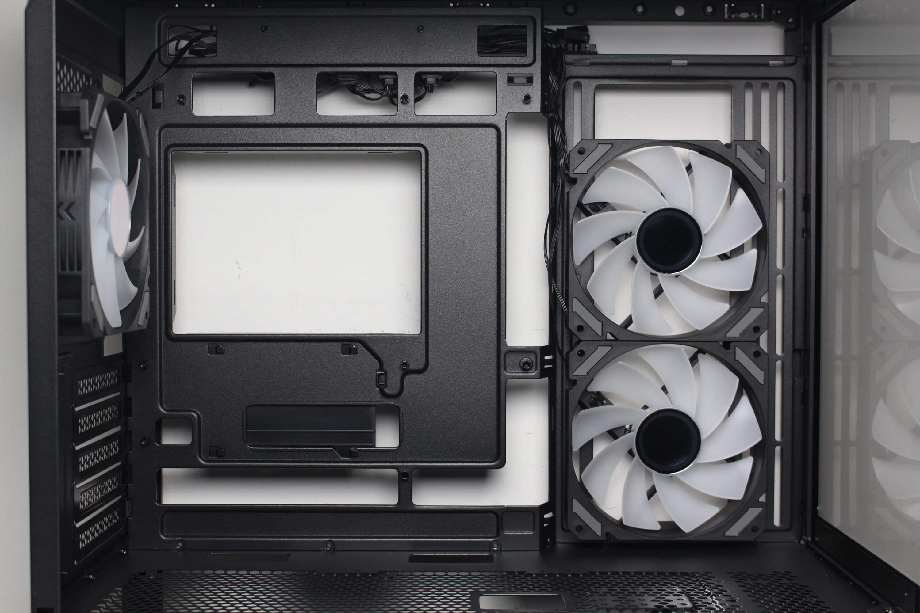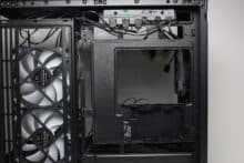 Sharkoon divides the interior into two overlapping compartments. The large main chamber offers space for an ATX mainboard, a long graphics card, a large CPU cooler or a water cooling system. The mainboard tray has a flat design and is interrupted on the right-hand side by mounting rails for two 120 mm fans. The tray also has various cable feed-throughs and openings for mainboards with rear connections. Of course, the MK6 RGB also has the obligatory cut-out for changing the backplate of a CPU cooler. There is sufficient space above the mainboard for a 360 mm radiator up to 60 millimetres deep.
