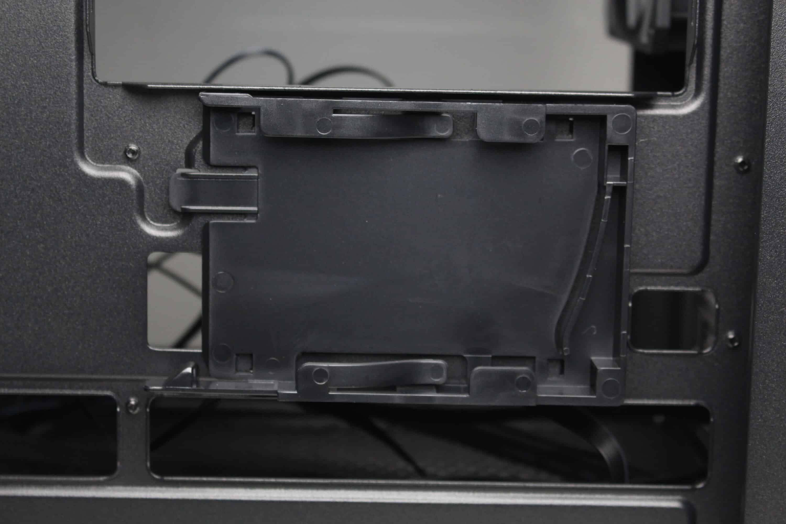 The Sharkoon MK6 RGB offers a total of three mounting points for data carriers. The modular HDD cage in the power supply compartment has a plastic frame for a 3.5″ or 2.5″ HDD and offers additional space above for another 3.5″ or 2.5″ HDD. The last 2.5″ SSD can be mounted behind the mainboard tray in a special plastic frame. Alternatively, this frame can also be attached to the HDD cage. The manufacturer does not generally implement decoupling for the data carriers.