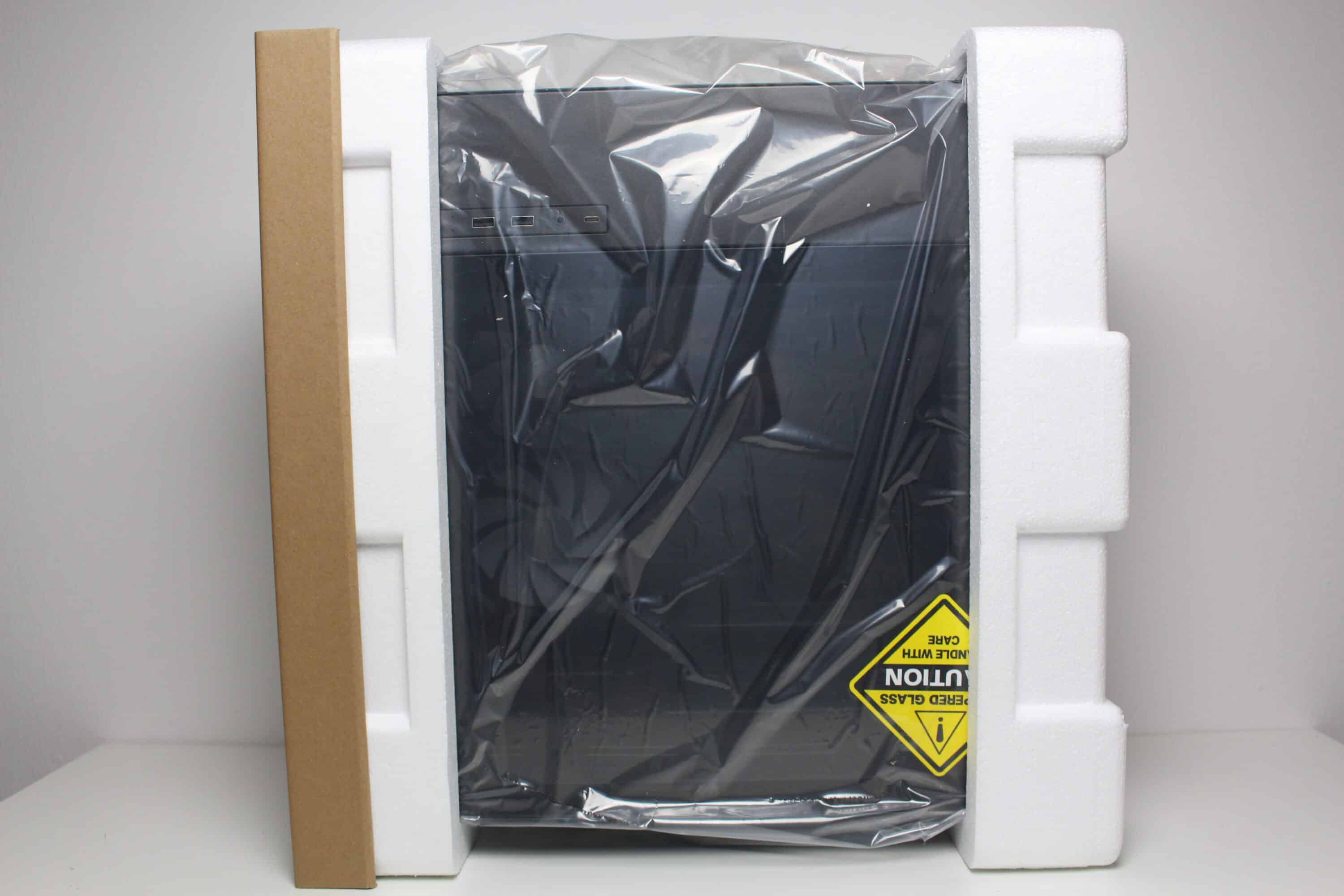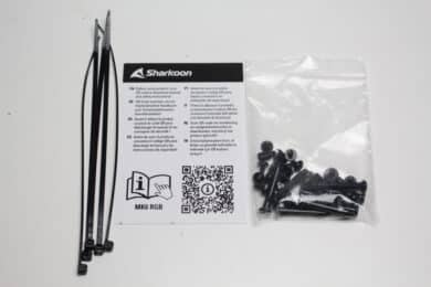 Inside, the manufacturer wraps the mini tower in a plastic film or two blocks of conventional polystyrene. In addition, a sturdy cardboard bracket has been positioned at the corner where the two glass panes meet. All glass elements were also covered with a protective film. Sharkoon places the accessories inside the MK6 RGB in a small white box. This box has been stowed in the HDD cage and contains all the necessary mounting screws, a nut for screwing in the spacers, some cable ties and a QR code for accessing the operating instructions.