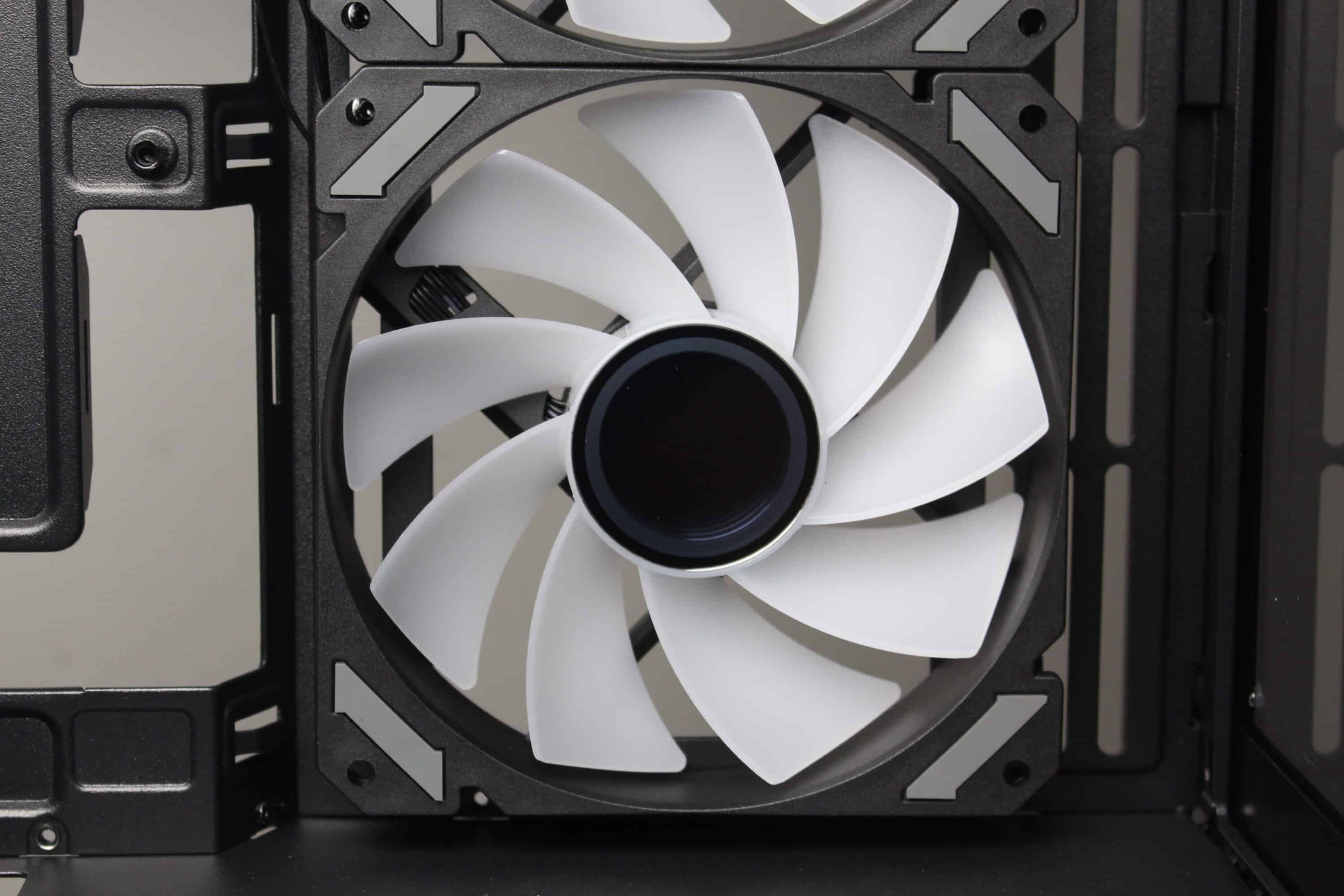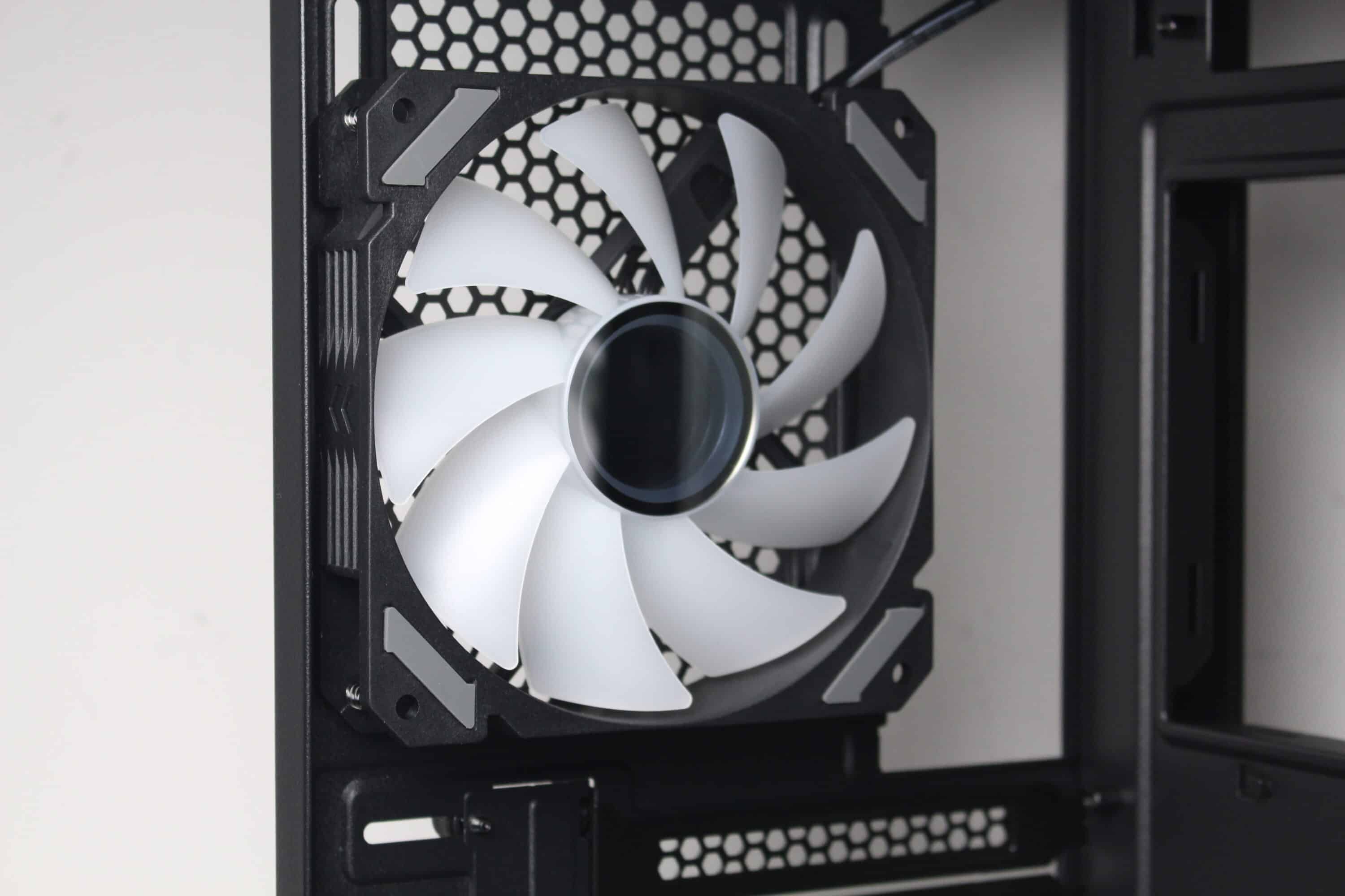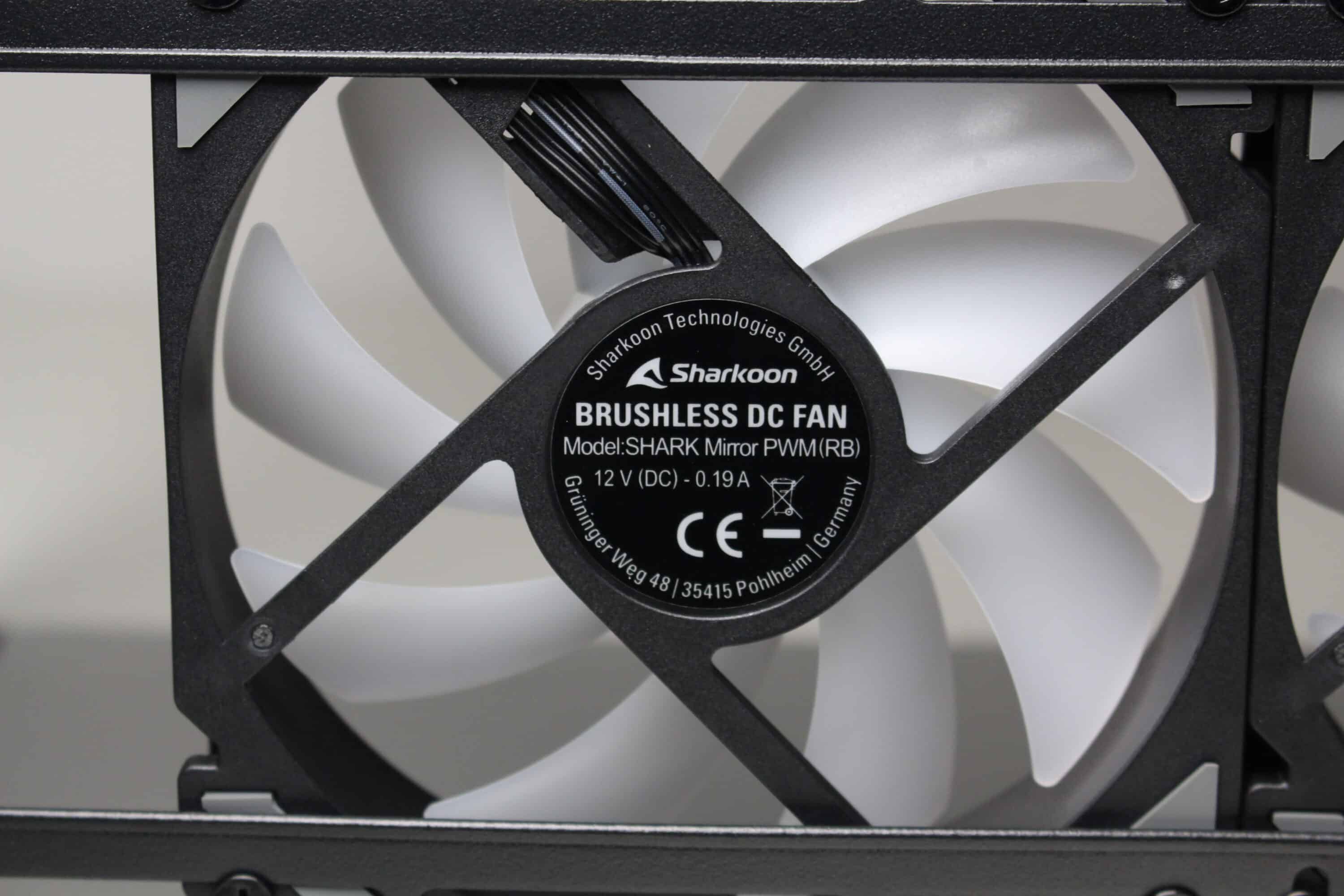 Sharkoon equips the MK6 RGB with three ARGB fans ex works. The manufacturer places a normal 120 mm fan in the rear and two inverted 120 mm fans to the right of the mainboard tray. All fans each have a 4-pin PWM or a 3-pin 5V ARGB connection. Sharkoon has opted for a black frame and milky white rotors with nine fan blades for the fans. The speed range is between 500 and 1800 revolutions per minute.