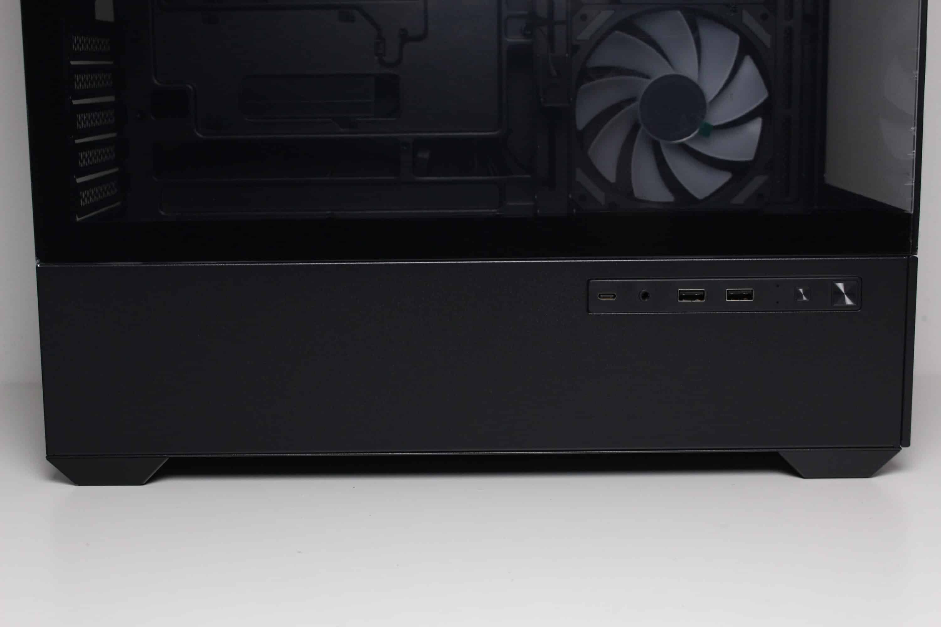 Sharkoon has placed the modern I/O panel on the left side of the case. It consists of a USB-C 3.2 Gen 2 and two USB-A 3.0 ports, an HD audio combo port, two indicator LEDs and two buttons for power and reset or to control the RGB lighting.