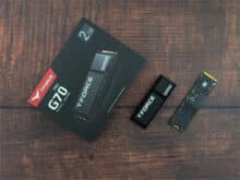 The TeamGroup T-Force G70 Pro uses PCIe 4.0. The transfer rates are up to 7,400 MB/s read and 6,800 MB/s write for the 2 TB model, the transfer rates of the other models vary. TeamGroup relies on InnoGrit’s IG5236 controller, 1 GB DRAM cache per TB of flash memory (up to 2 GB) and different TLC flash memories. The T-Force G70 Pro differs from the T-Force G50 not only in its higher transfer rates, but also in its DRAM cache. The SSD is available with either an aluminum heat sink (link to the manufacturer) or a graphene heat sink (link to the manufacturer), only one of the heat sinks is included in the scope of delivery.