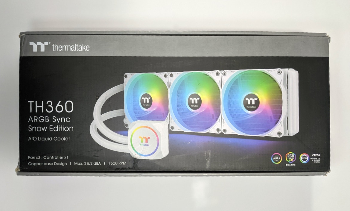 The TH360 ARGB Sync comes well packed in an ideally sized cardboard box. On the front, we see a picture of the snow-white AiO along with the Rainbow lighting turned on, a few technical details, and a portion of the motherboard manufacturer’s supported RGB programs or icons. On the back, the features and data are listed in more detail.