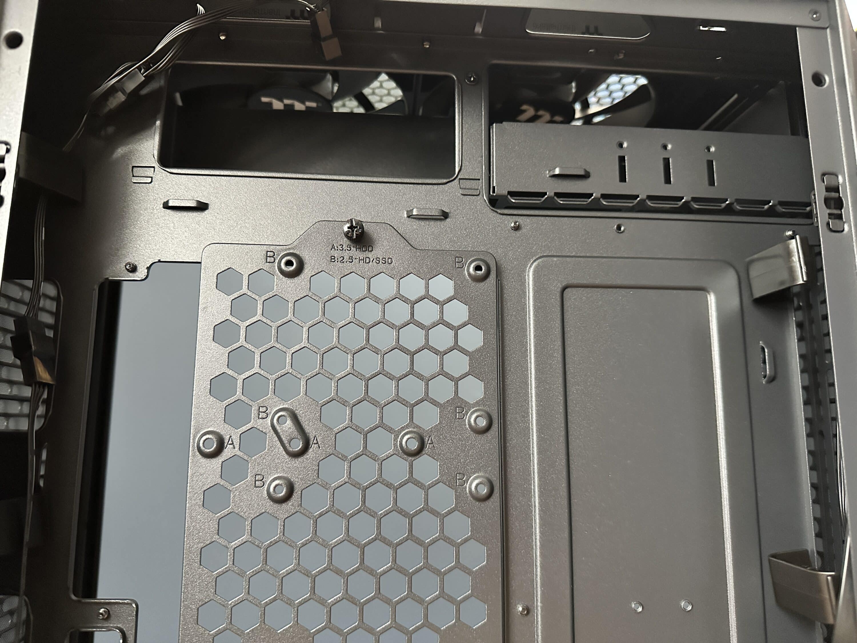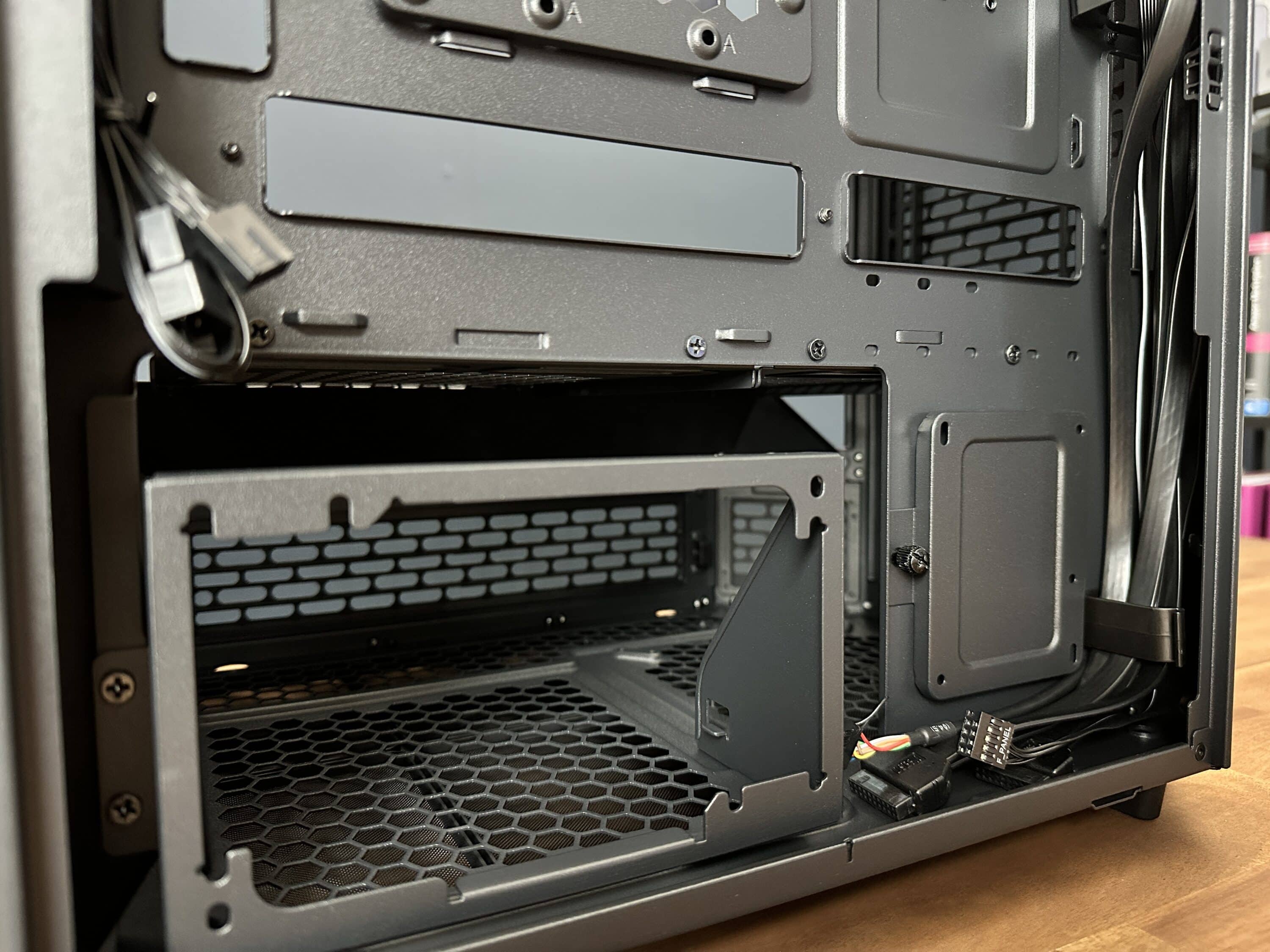 There is a drive bay at the rear that offers space for an HDD or up to three SSDs. A removable mounting frame is provided in the lower area for the power supply unit, which makes installation easier and offers sufficient space and a large opening for ventilation of the power supply unit.