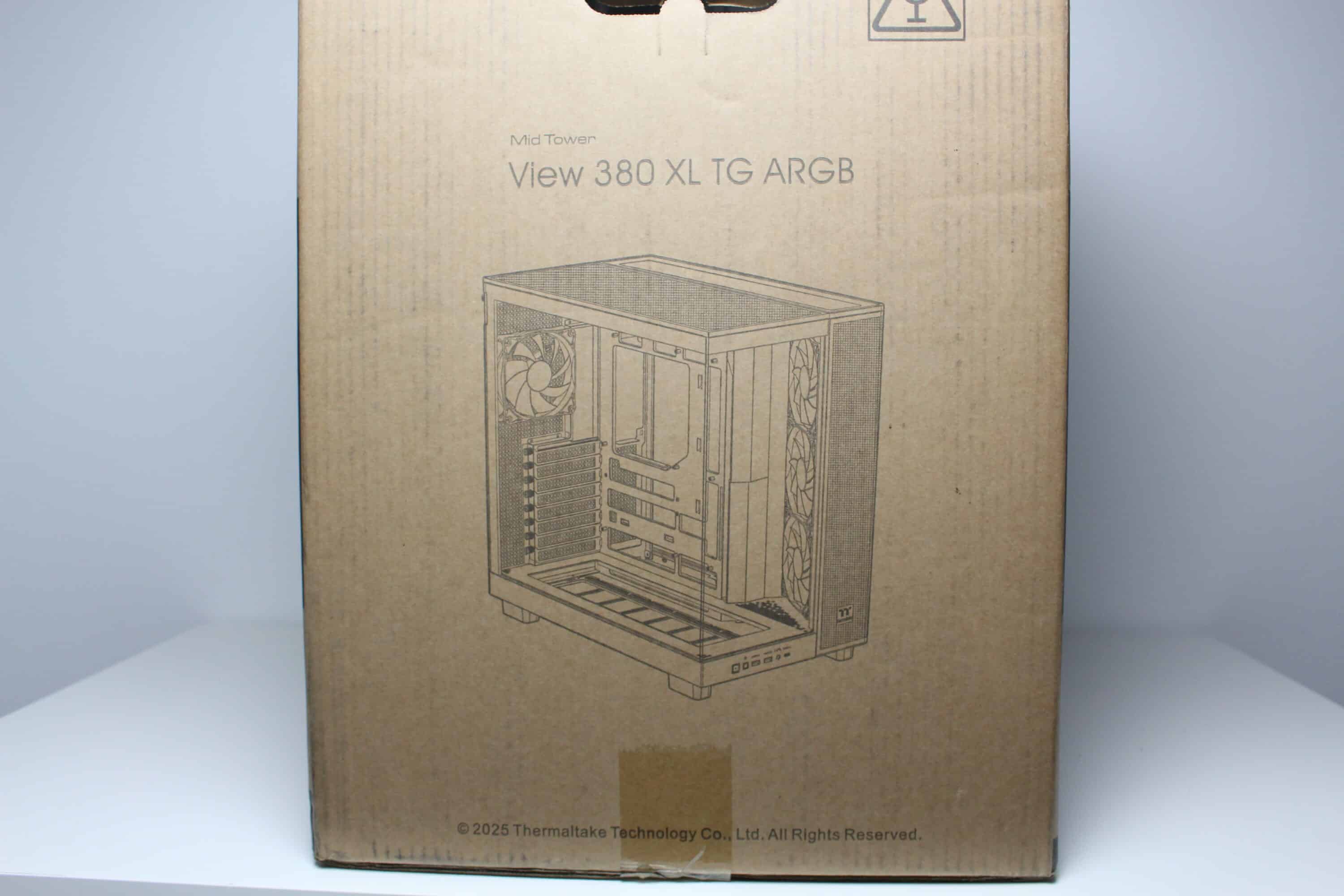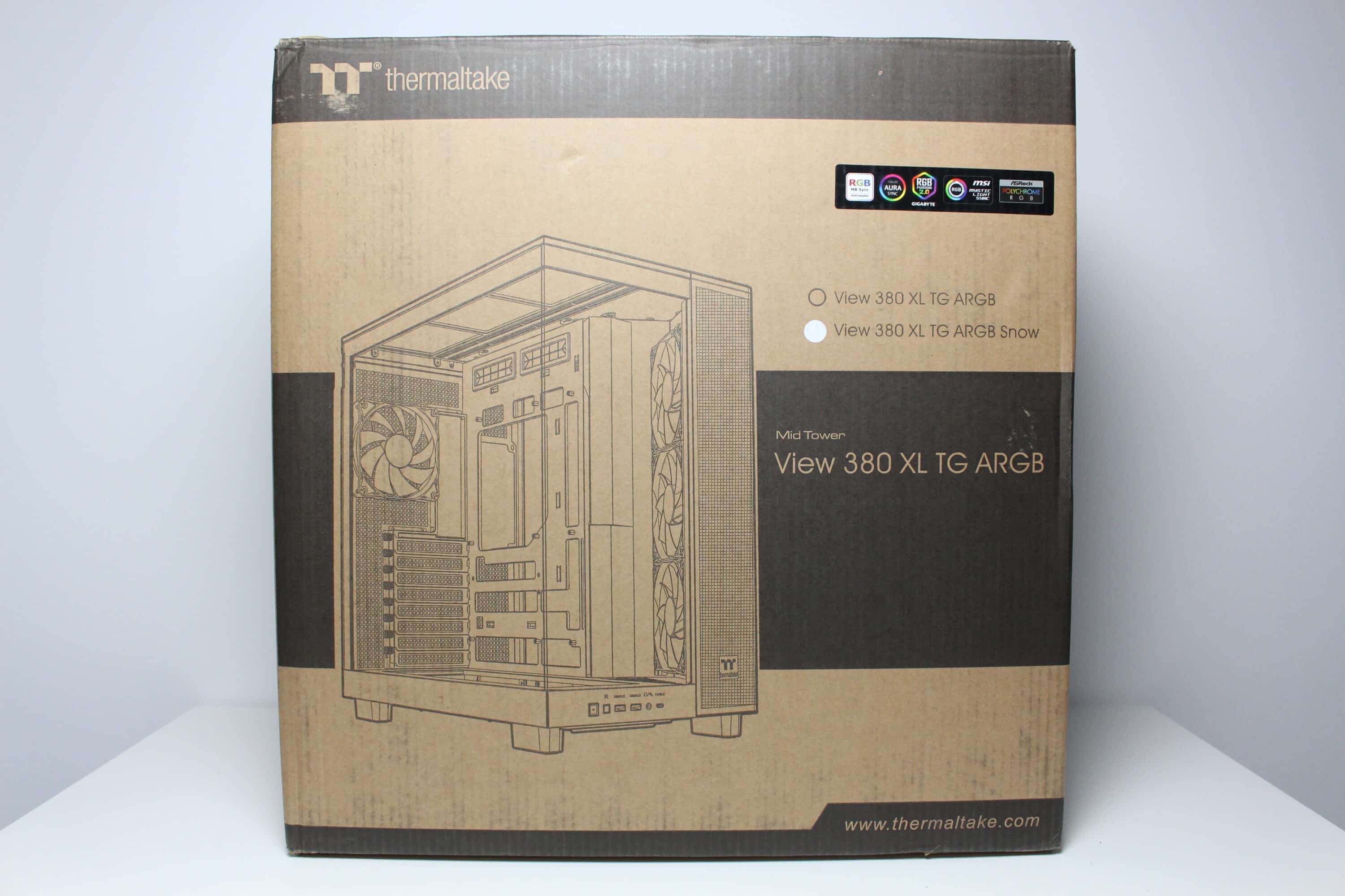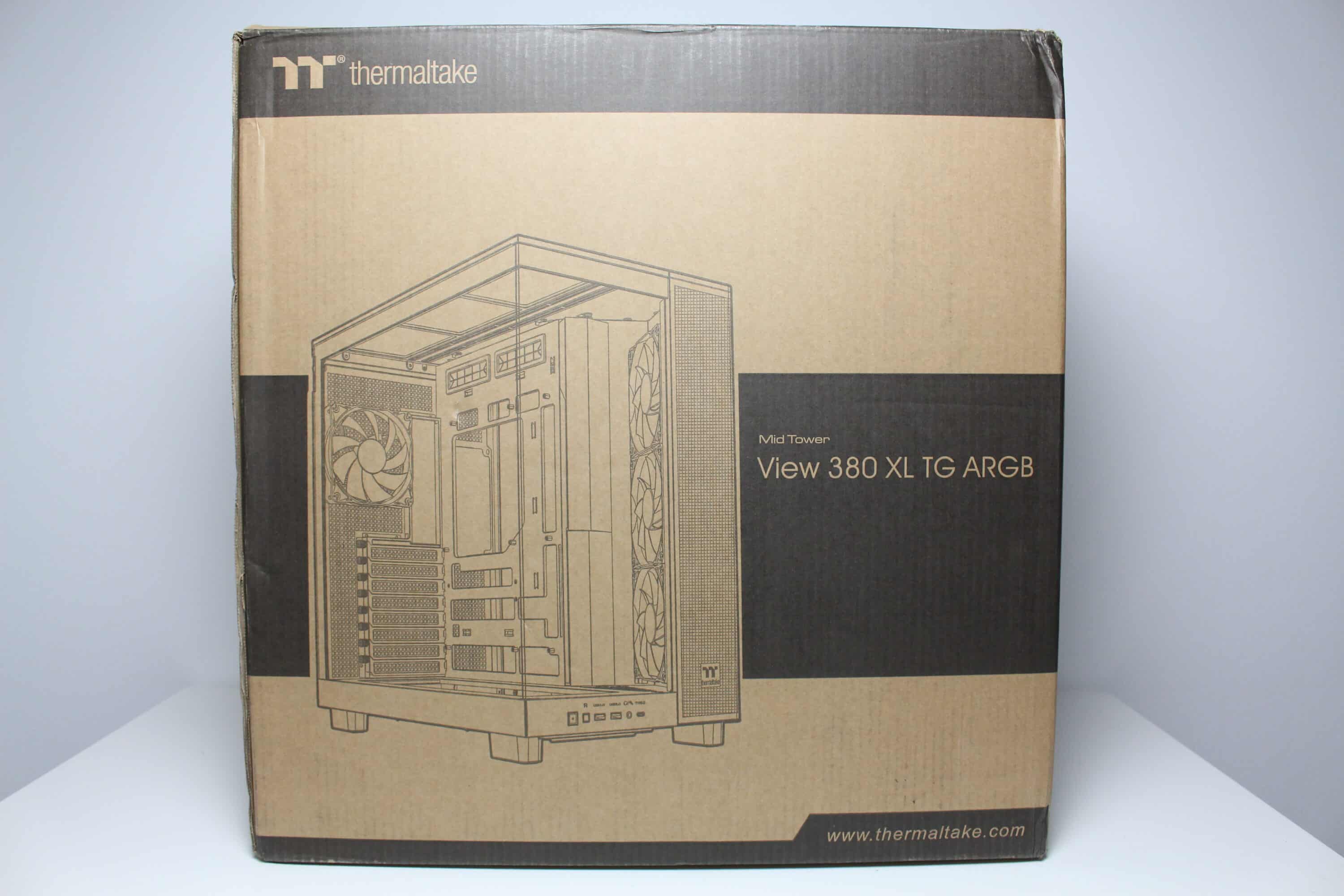 Thermaltake packs the View 380 XL TG ARGB in a simple brown cardboard box. On three sides of the packaging, the manufacturer places a picture of the case, which hopefully can be found inside. On the front, Thermaltake then sticks a small piece of information about ARGB support and a sticker that gives an indication of the color of the midi tower. Finally, of course, the table with all the technical information should not be missing.