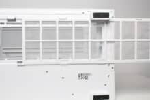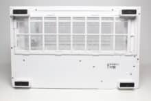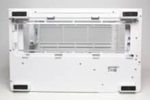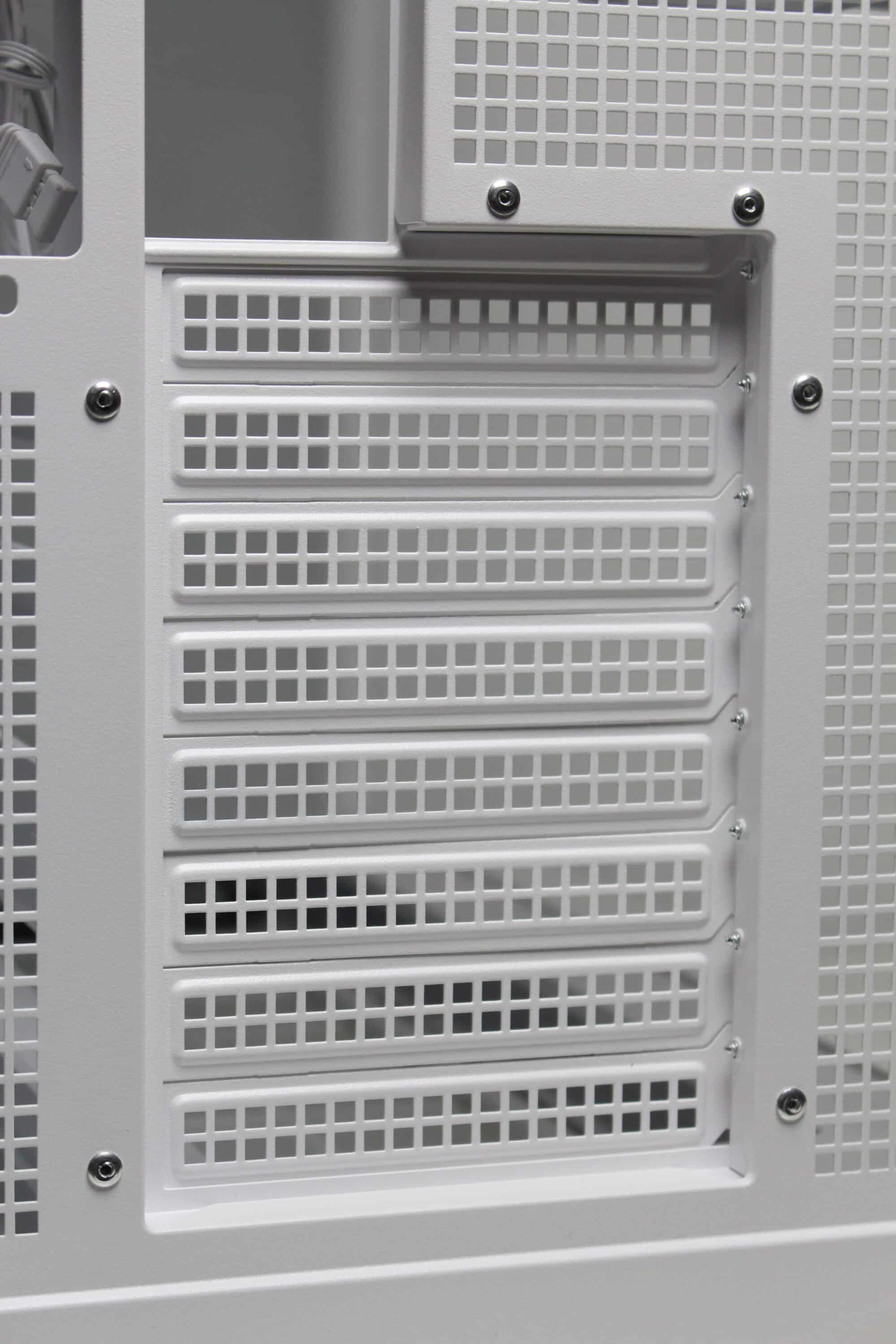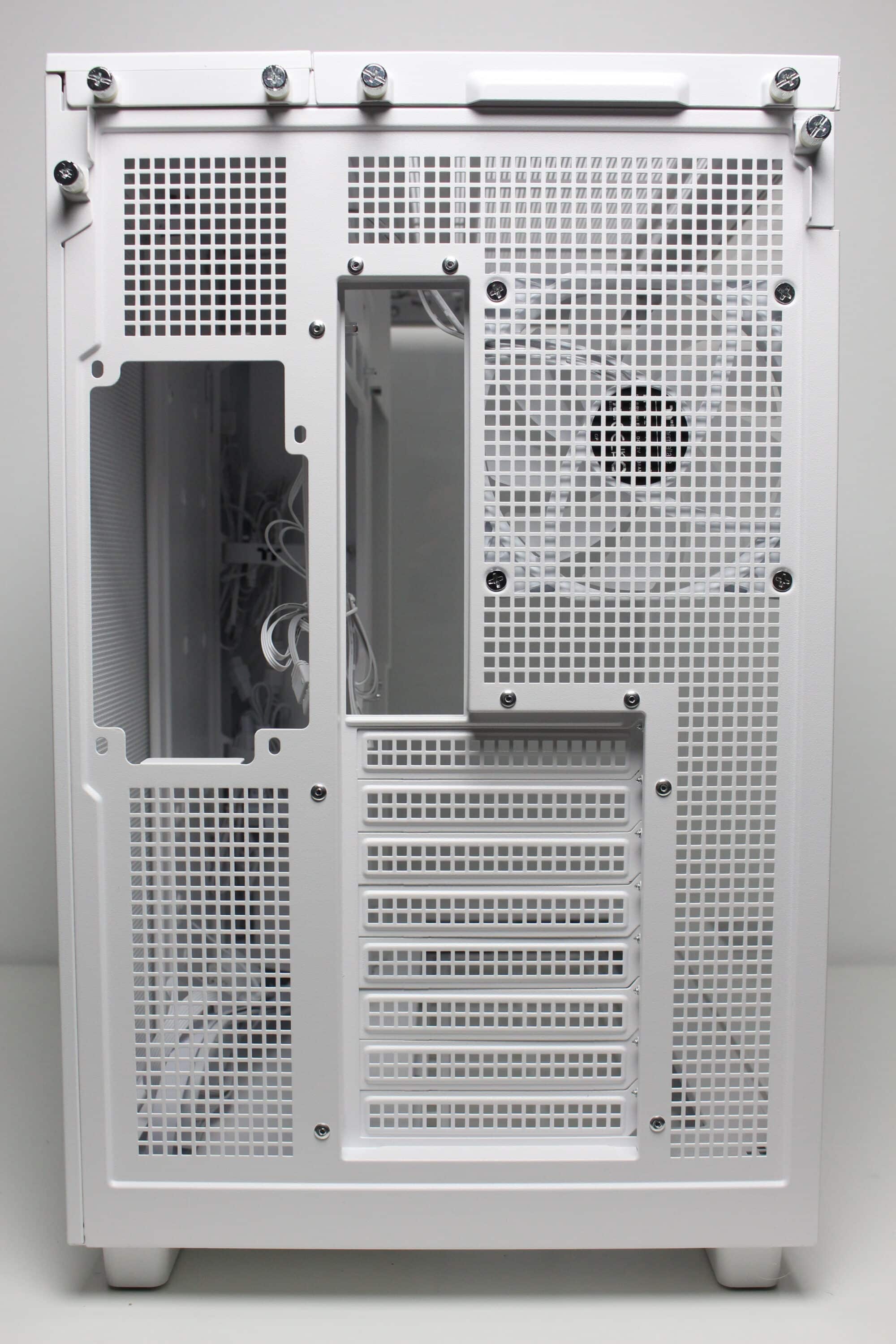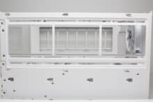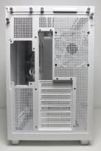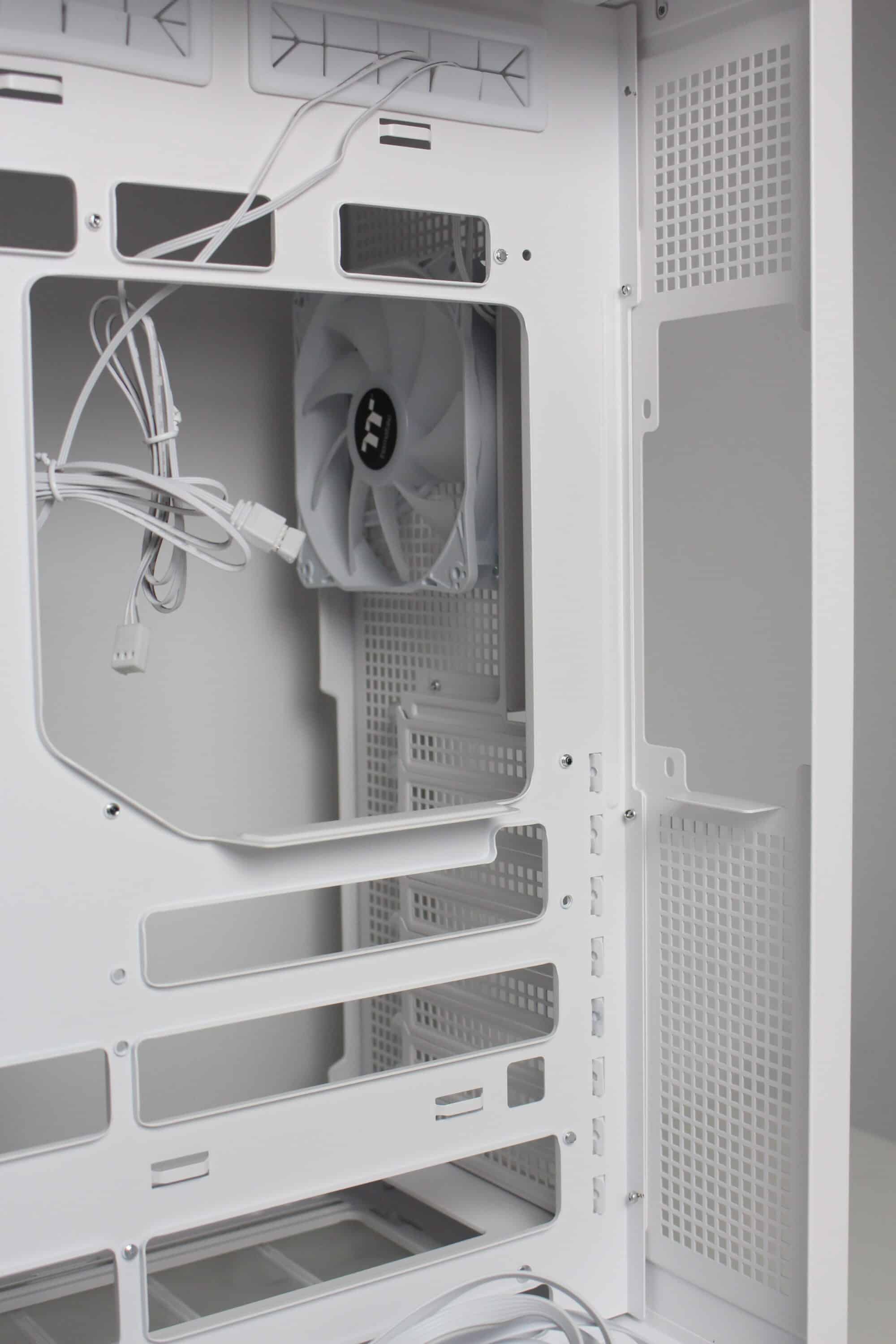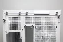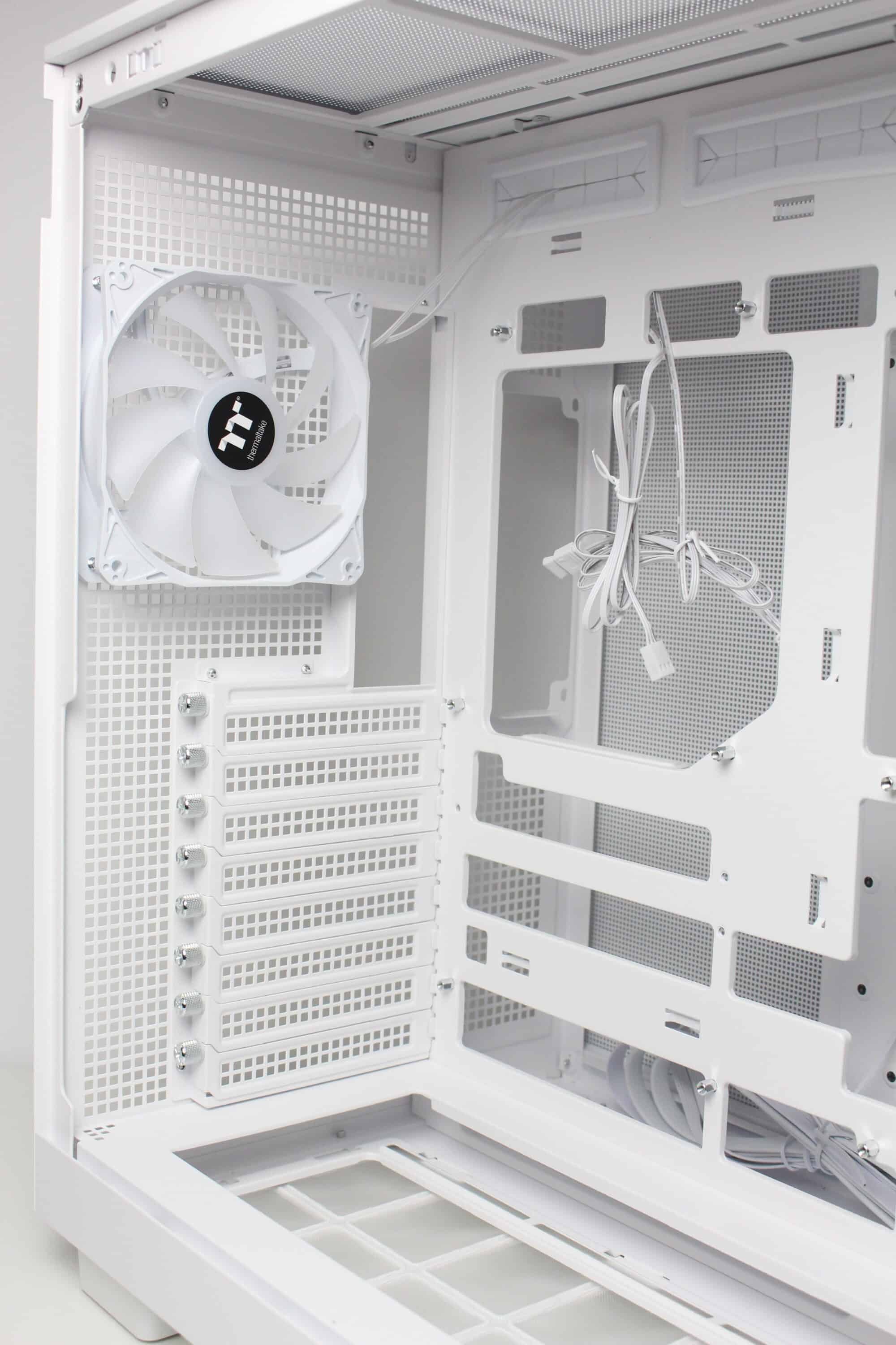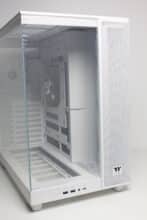 The design at the back looks familiar and is similar to that of many other “aquarium” cases, which have two vertical chambers. Numerous ventilation openings and the mounting position for the vertically oriented power supply unit can be seen on the left-hand side. On the right-hand side, Thermaltake has installed the fourth pre-installed case fan and eight slots for expansion cards, which are perforated and screwed into place with knurled screws. Thermaltake has also implemented additional ventilation openings above the fan and on the side.