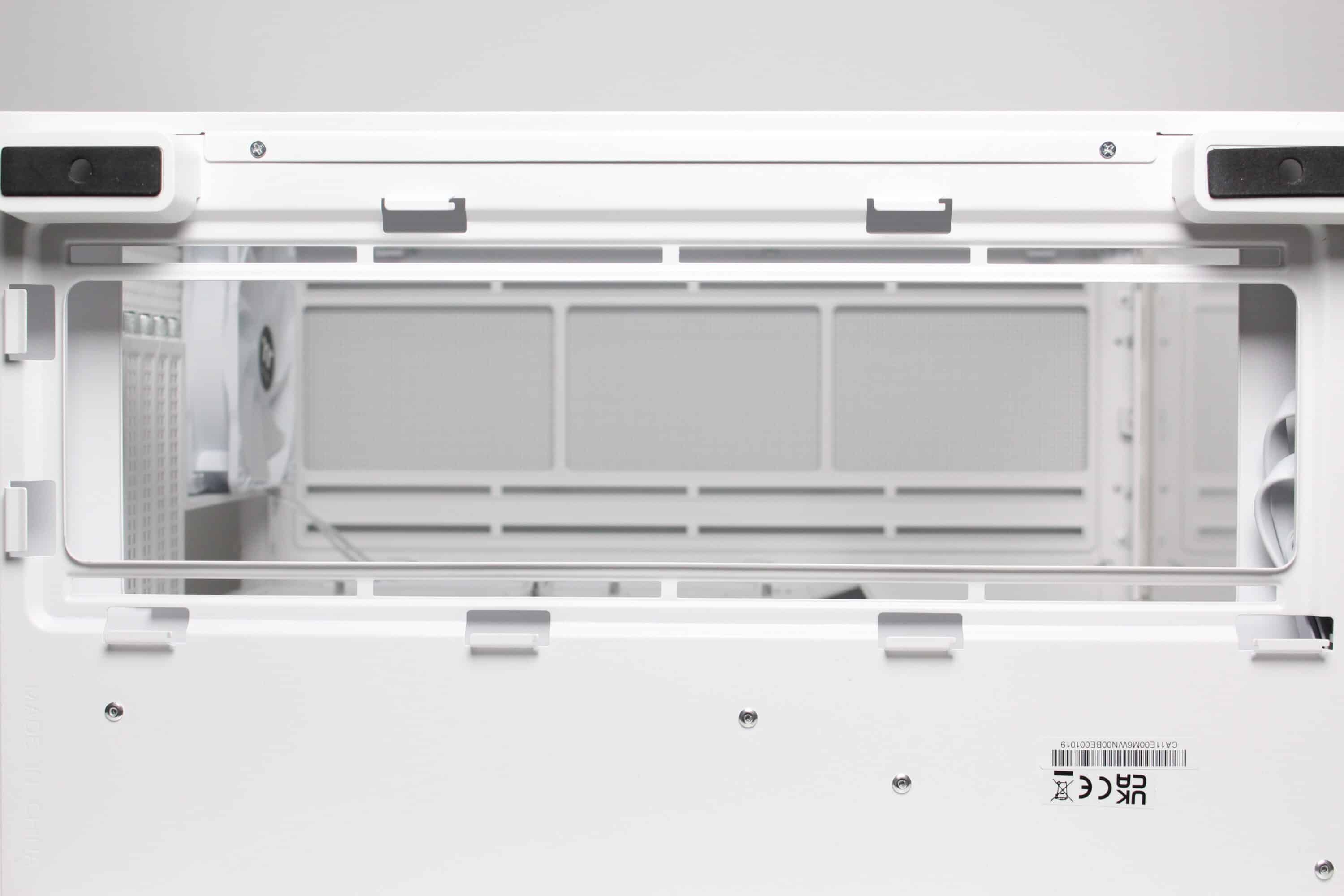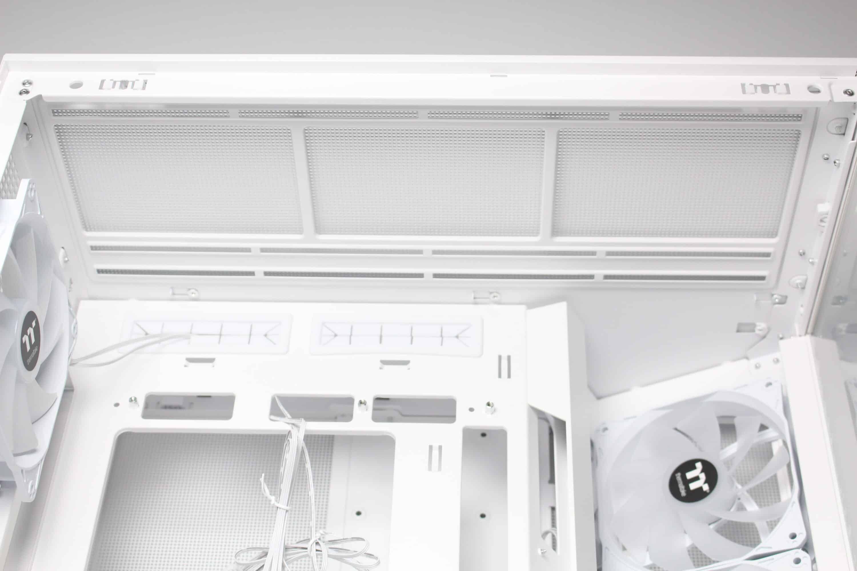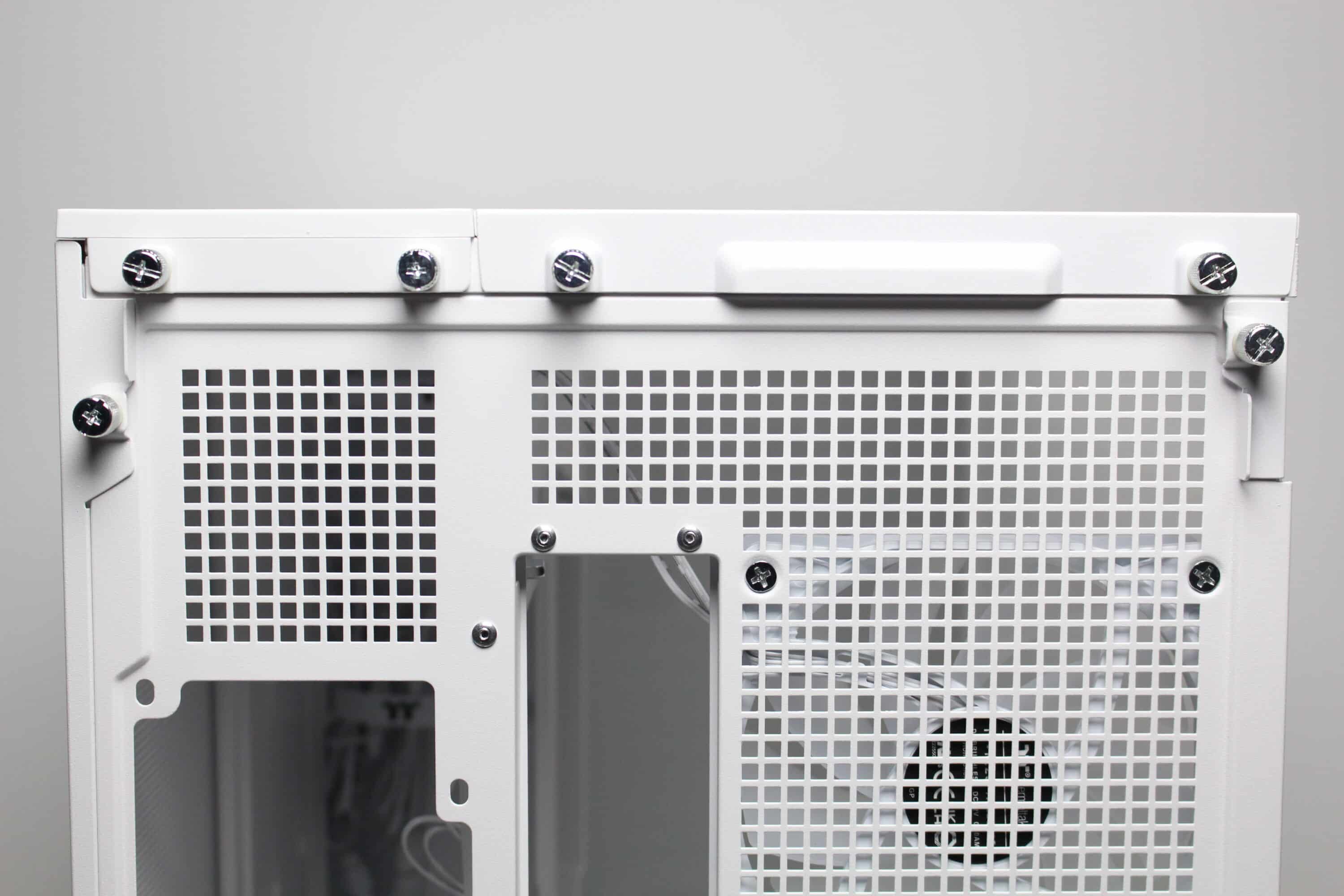 The top of the View 380 XL TG ARGB has a very airy design. A large fan grille can be seen here, which can be removed together with the second cover element without tools using knurled screws. The fan grille is made of steel, whereas the second element is only used as a cover and is made of plastic. There is a further mounting frame under the fan frame, which offers space for three 120 mm or two 140 mm fans. Alternatively, a correspondingly large radiator can of course also be installed here.