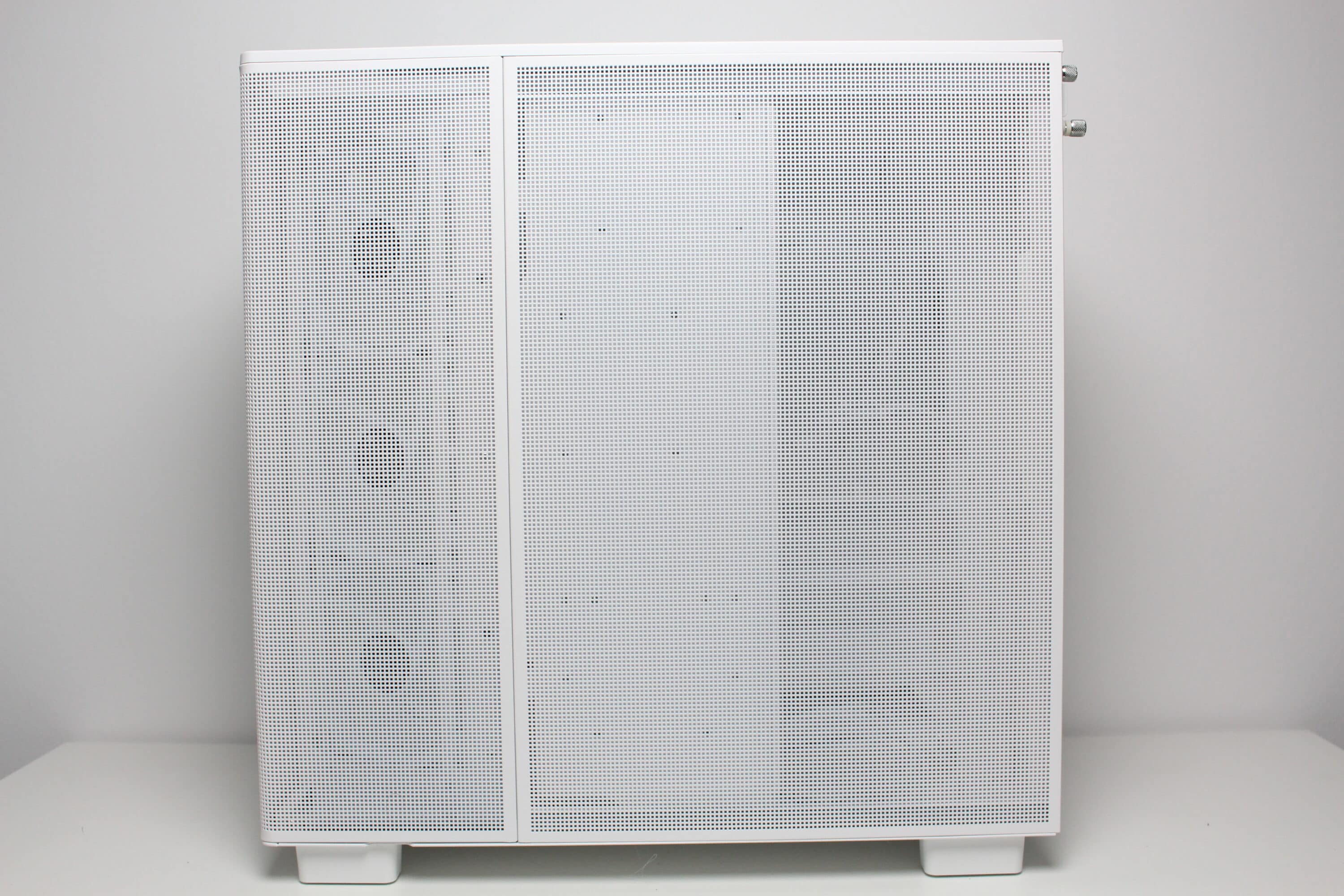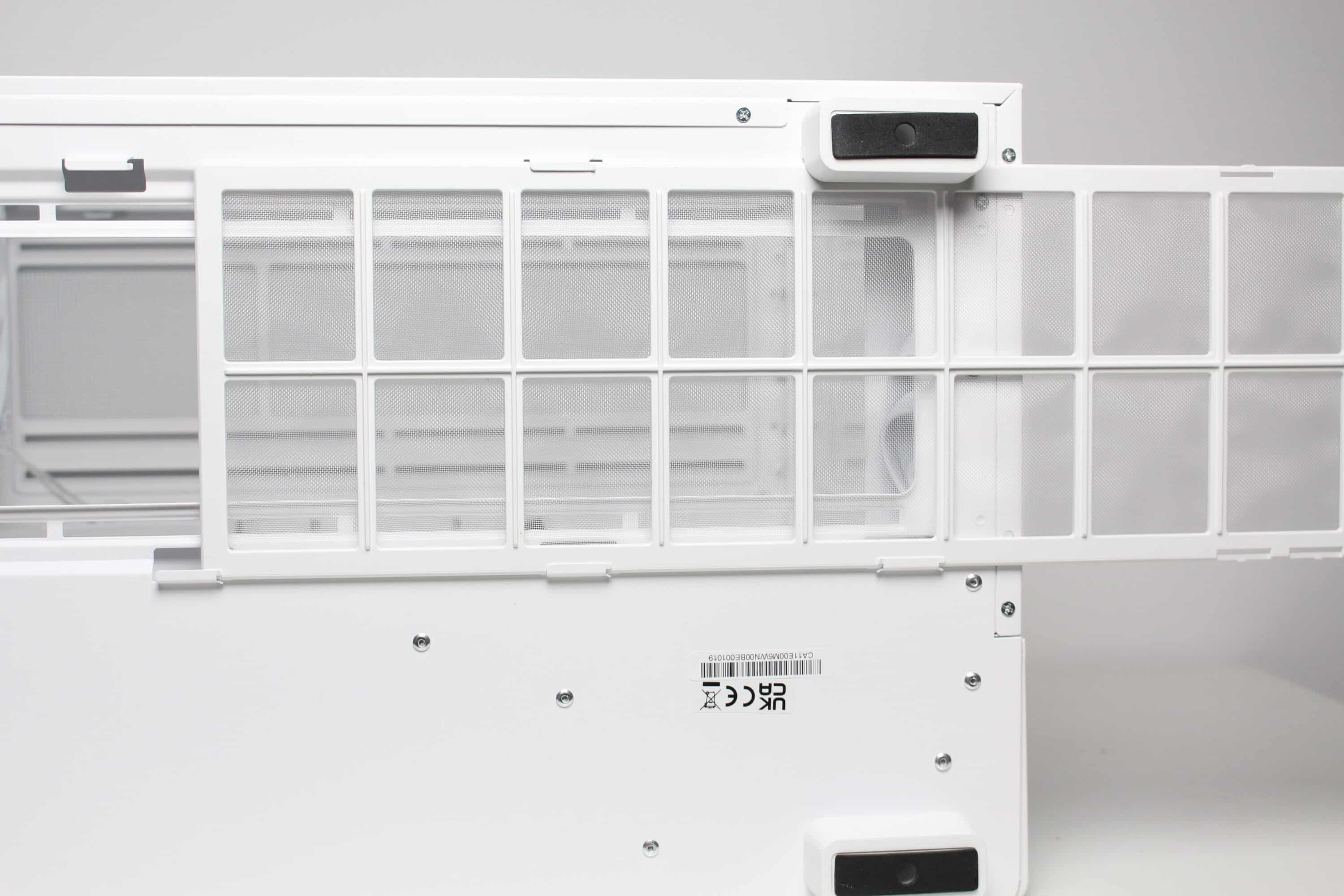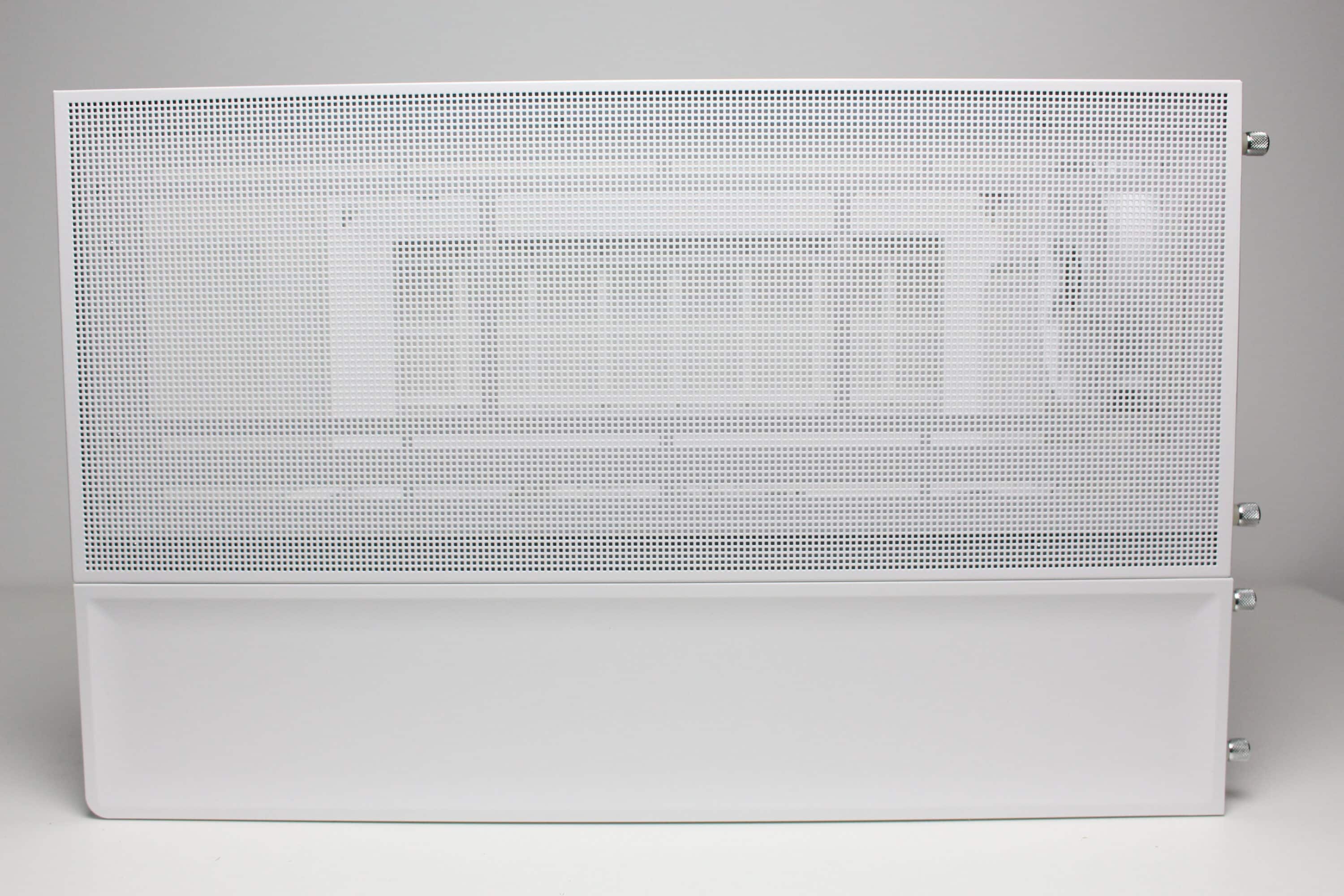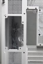 Like the front, the left side of the View 380 XL TG ARGB is made of tempered glass and is glued to a steel frame. It is mounted on the body using push pins. The same applies to the right-hand side panel, which is made of steel and is a huge ventilation grille. It also has the same look and structure as the grille in the lid and the curved element between the front and side panel. Both side panels each have a knurled screw at the rear as an additional fastening for transportation.