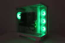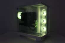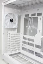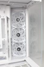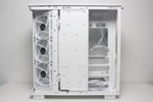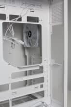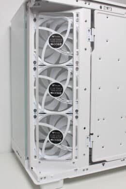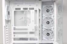 Due to their orientation, the three side fans transport cold air into the interior and also accentuate the lighting. The airflow is easily directed past the mainboard via a cable duct and hits the graphics card precisely. Apart from the modular GPU bracket in the lower area, there are no disruptive elements in the airflow. The fourth pre-installed 120 mm fan in the rear removes the heated air.