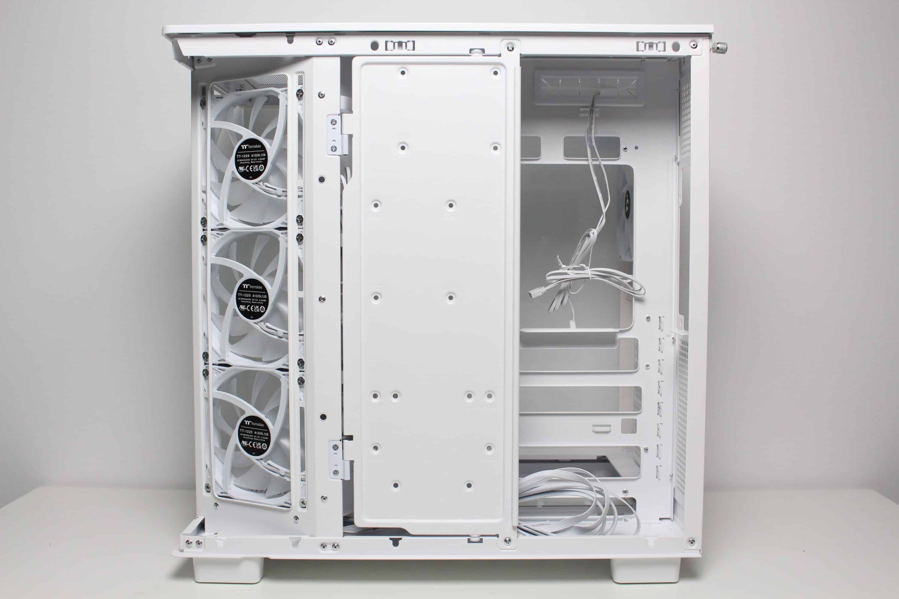 As already mentioned, Thermaltake divides the interior of the View 380 XL TG ARGB into two vertically separated chambers. The large main chamber offers space for up to ten fans, two radiators, an ATX mainboard, a long graphics card and a large CPU cooler. The mainboard tray has numerous cable feed-throughs, a cut-out for the backplate of a CPU cooler and openings for mainboards with rear connections. There is plenty of room to work above and below the mainboard tray.