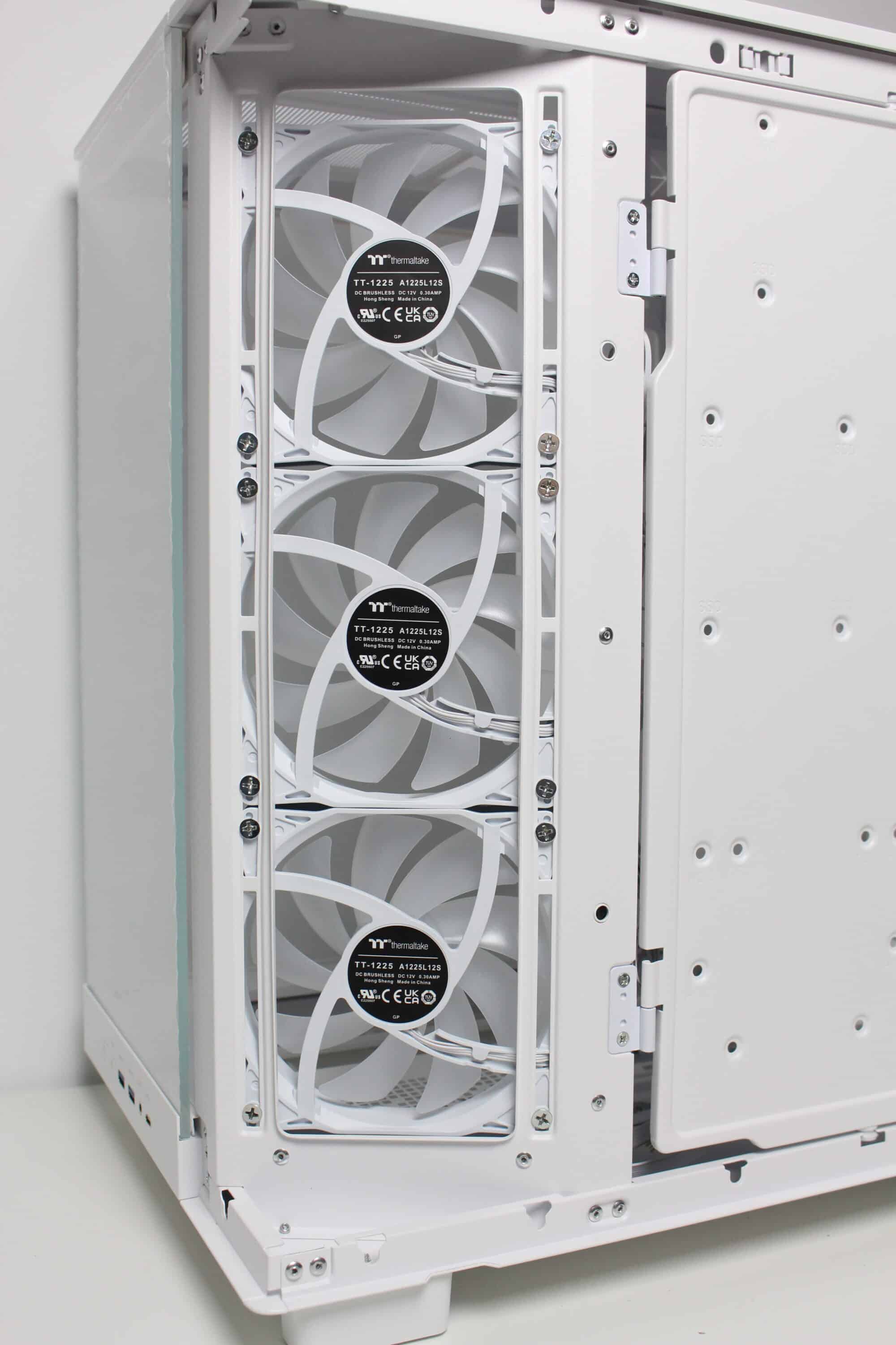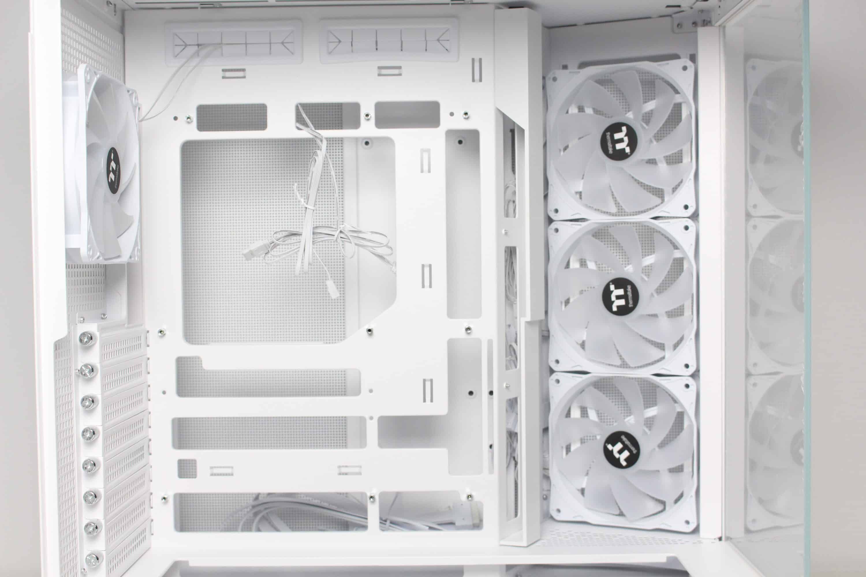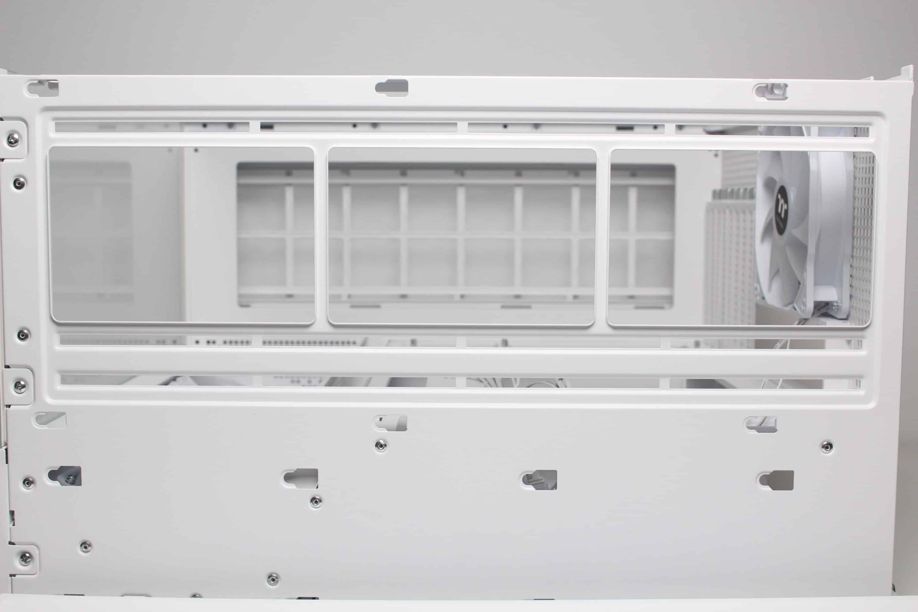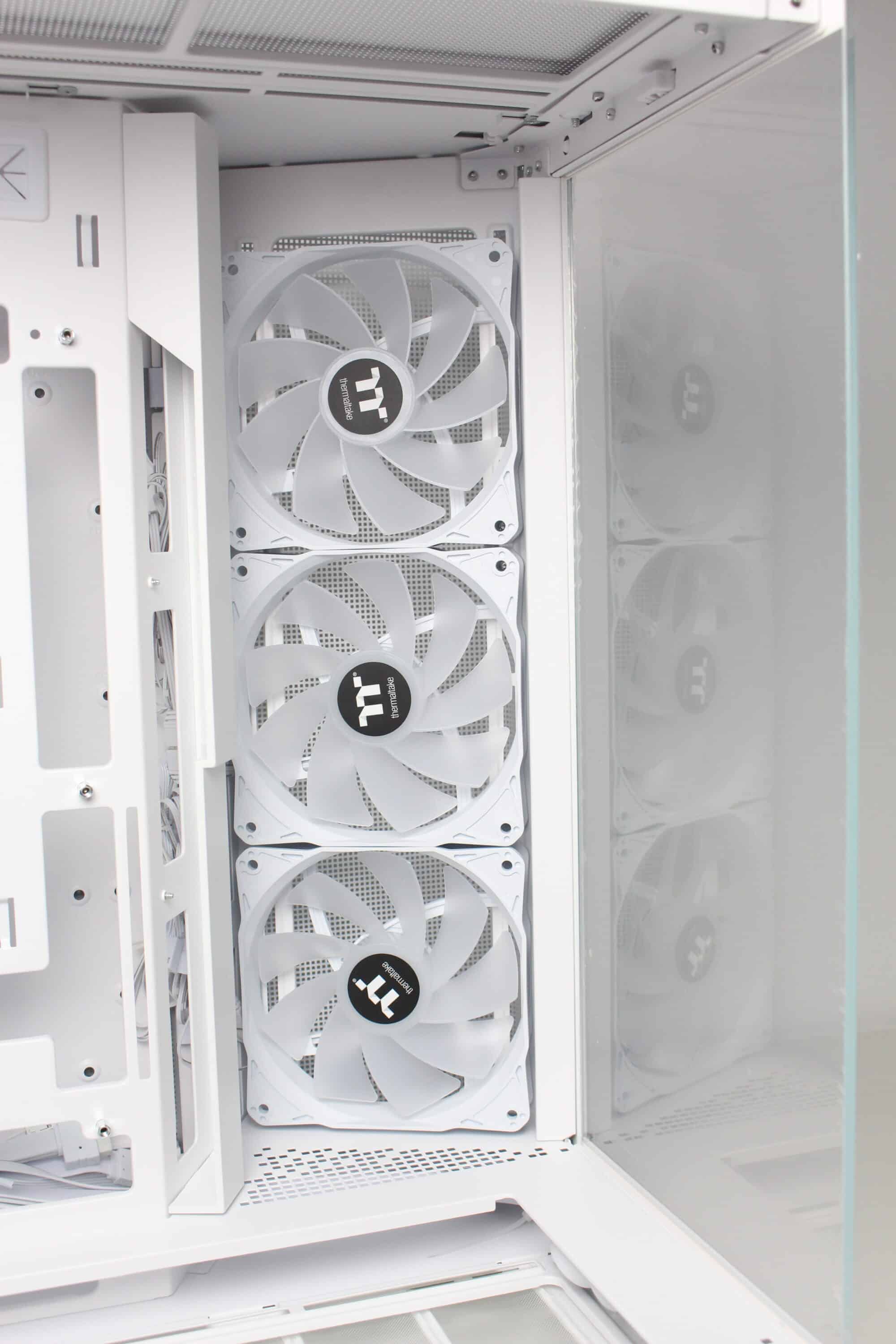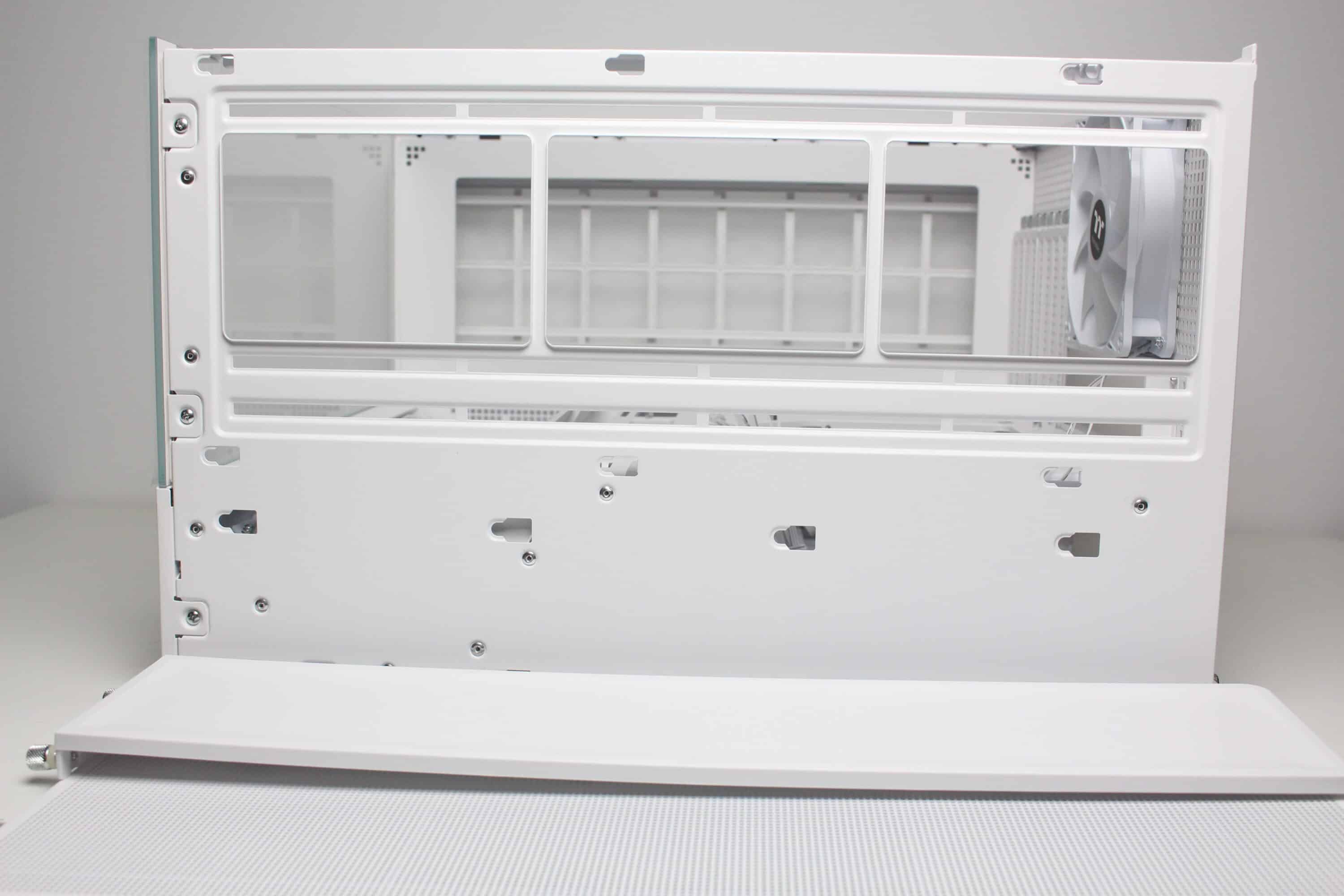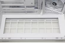 To ensure that sufficient air can be transported into the interior despite the glass front, Thermaltake installs a mounting frame for three 120 mm fans between the front and the right side and also equips all slots ex works. The angle of the frame is intended to ensure that the cold air reaches the components directly and does not first hit the other side of the case and is deflected by 90 degrees. A fan grille has been placed in front of the fans, which can be removed using screws, but has not been fitted with an additional dust filter.