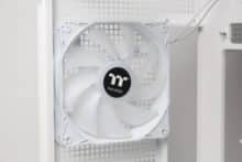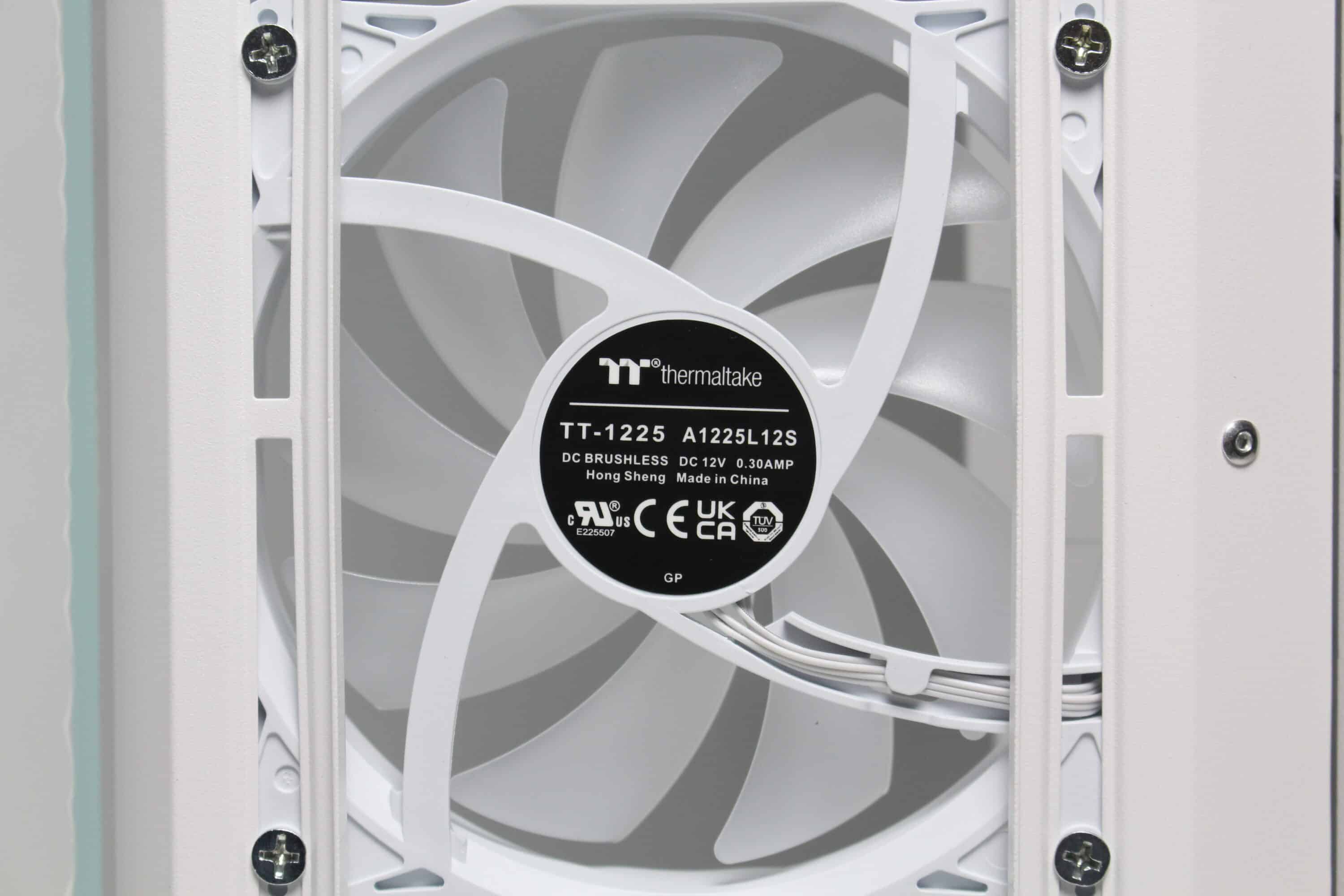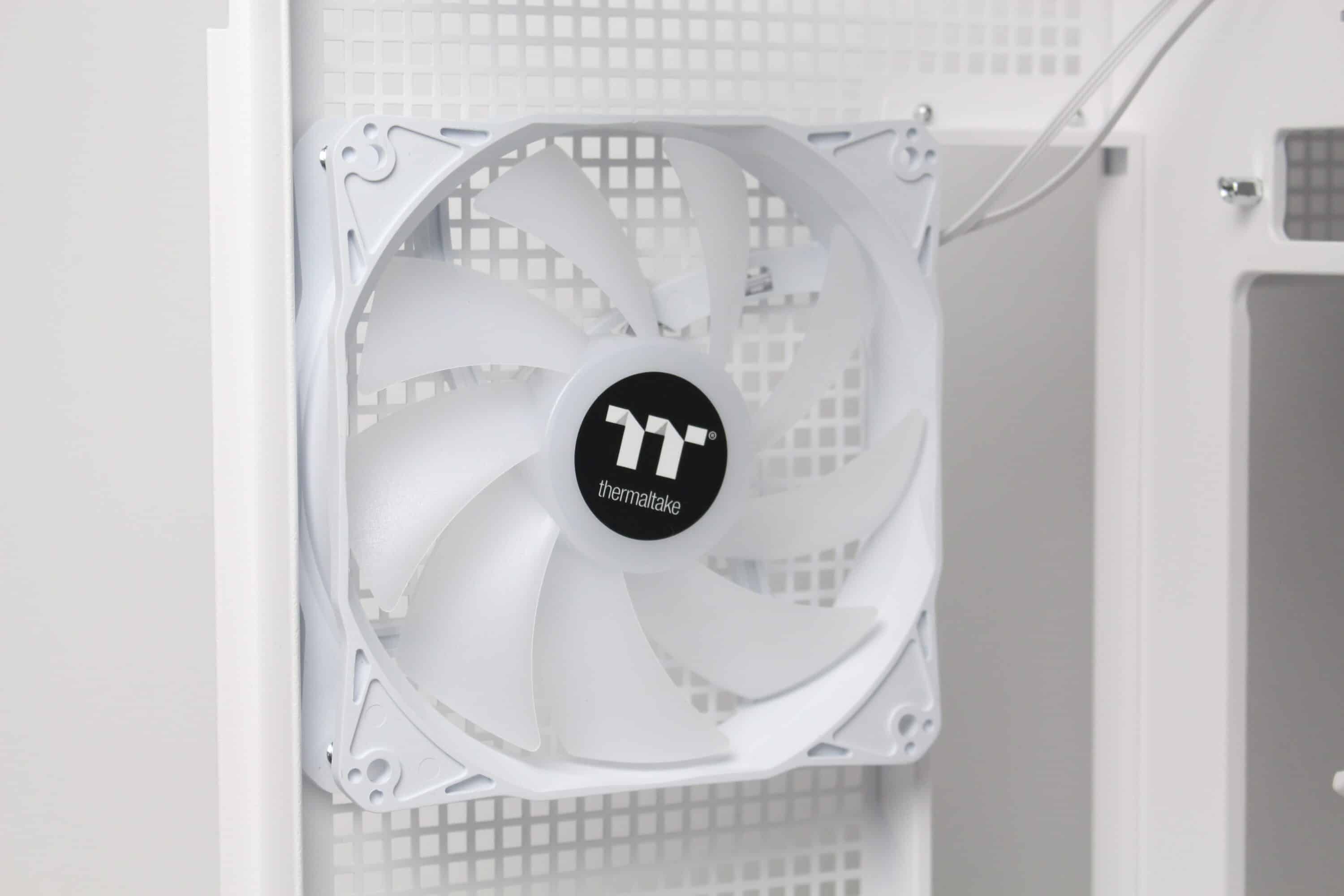 Thermaltake installs four fans in the View 380 XL TG ARGB ex works. These include three 120 mm fans with ARGB lighting on the side front, which have so-called “reverse blades”, as well as another 120 mm ARGB fan on the rear of the midi tower. Visually, all four fans are similar. The milky white rotor is surrounded by a white frame and each fan has a 3-pin 12V connection for the power supply and a 3-pin 5V connection for addressing the LEDs. The speed range in our test was between 390 and 930 revolutions per minute. There is no decoupling of the frame, e.g. via rubberized corners.