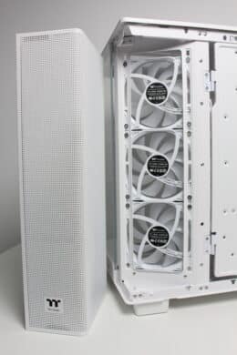 However, the Thermaltake View 380 XL TG ARGB is not without its negative aspects. In terms of its size and layout, it only offers space for a few data carriers. Added to this are the rather thin ventilation grilles in the lid and on the right side panel. We would also have liked to see the use of PWM with the pre-installed fans and the cooling of the GPU could be significantly better, at least in the factory settings.