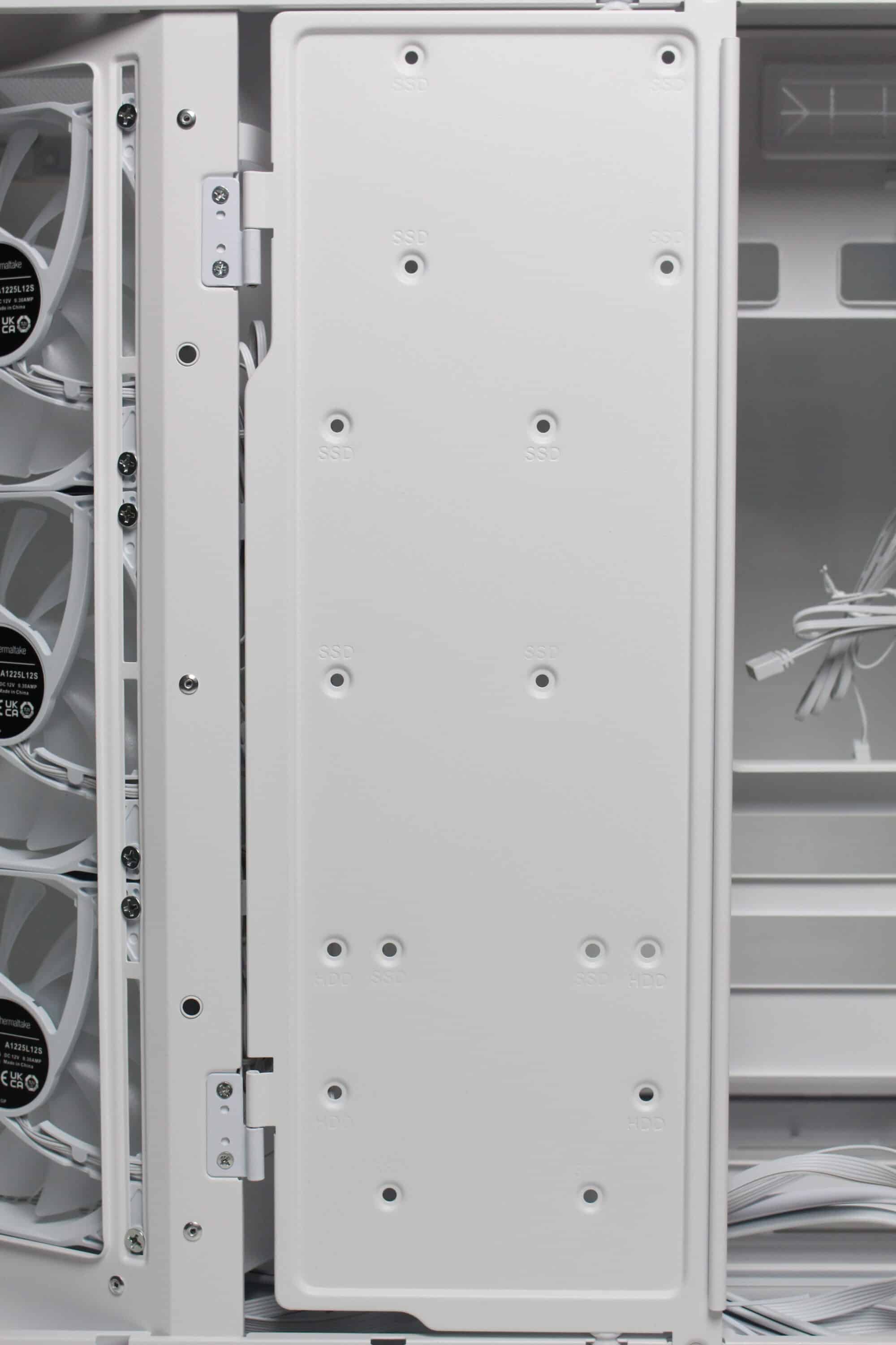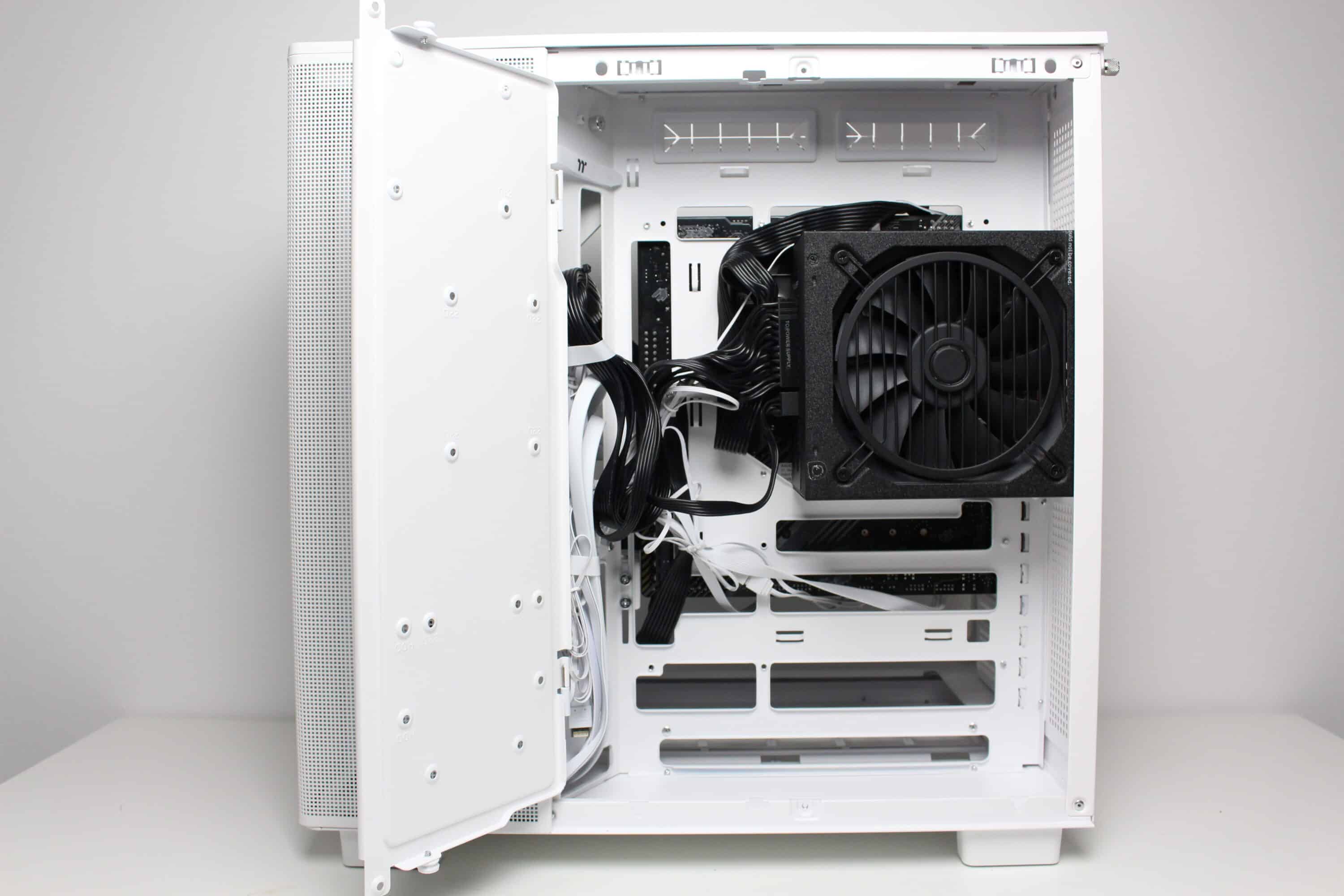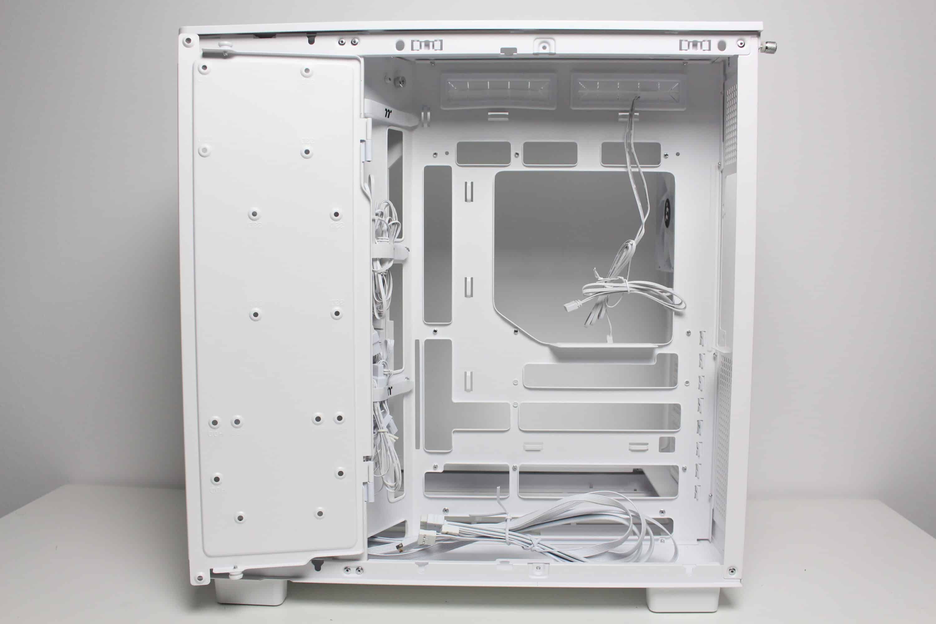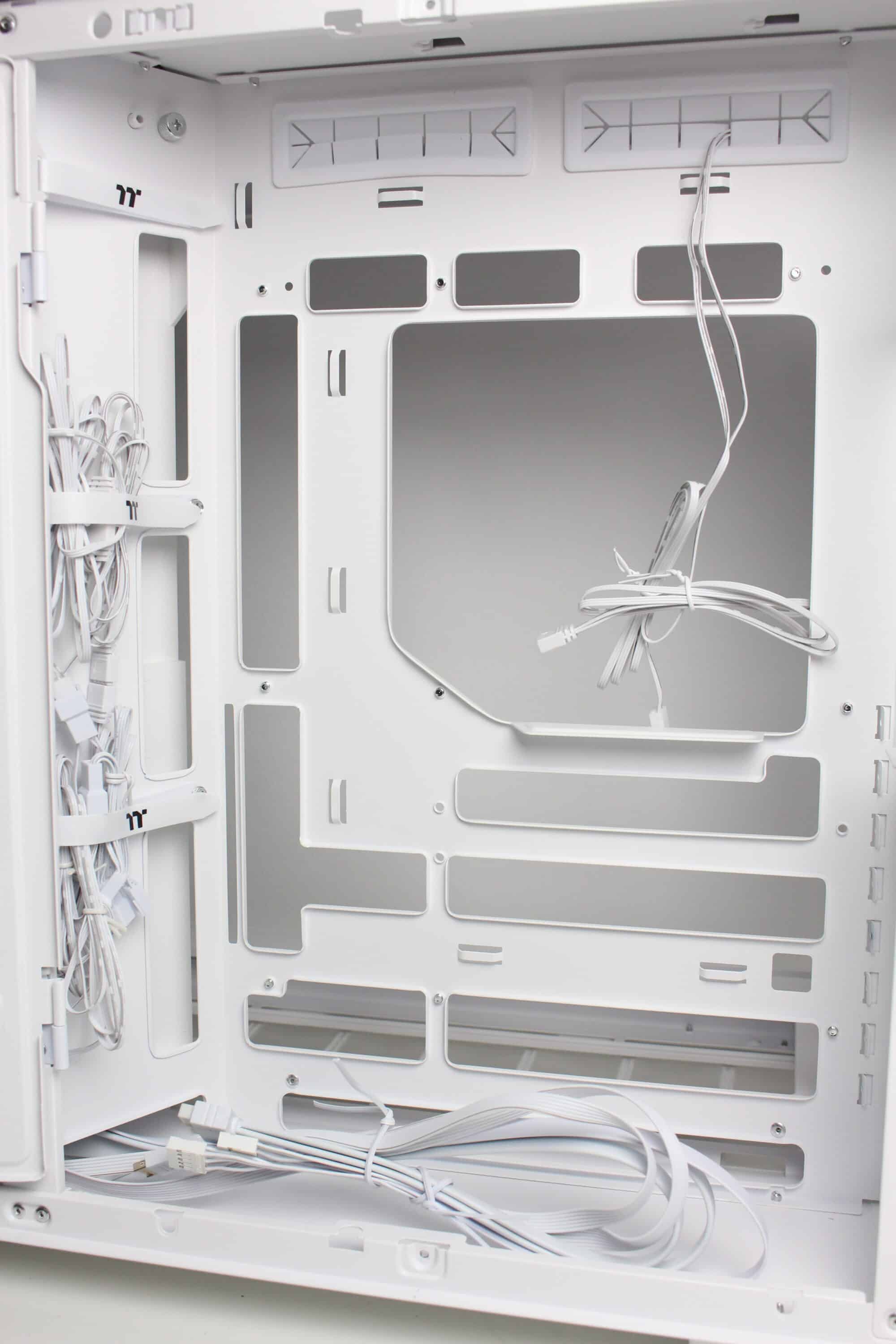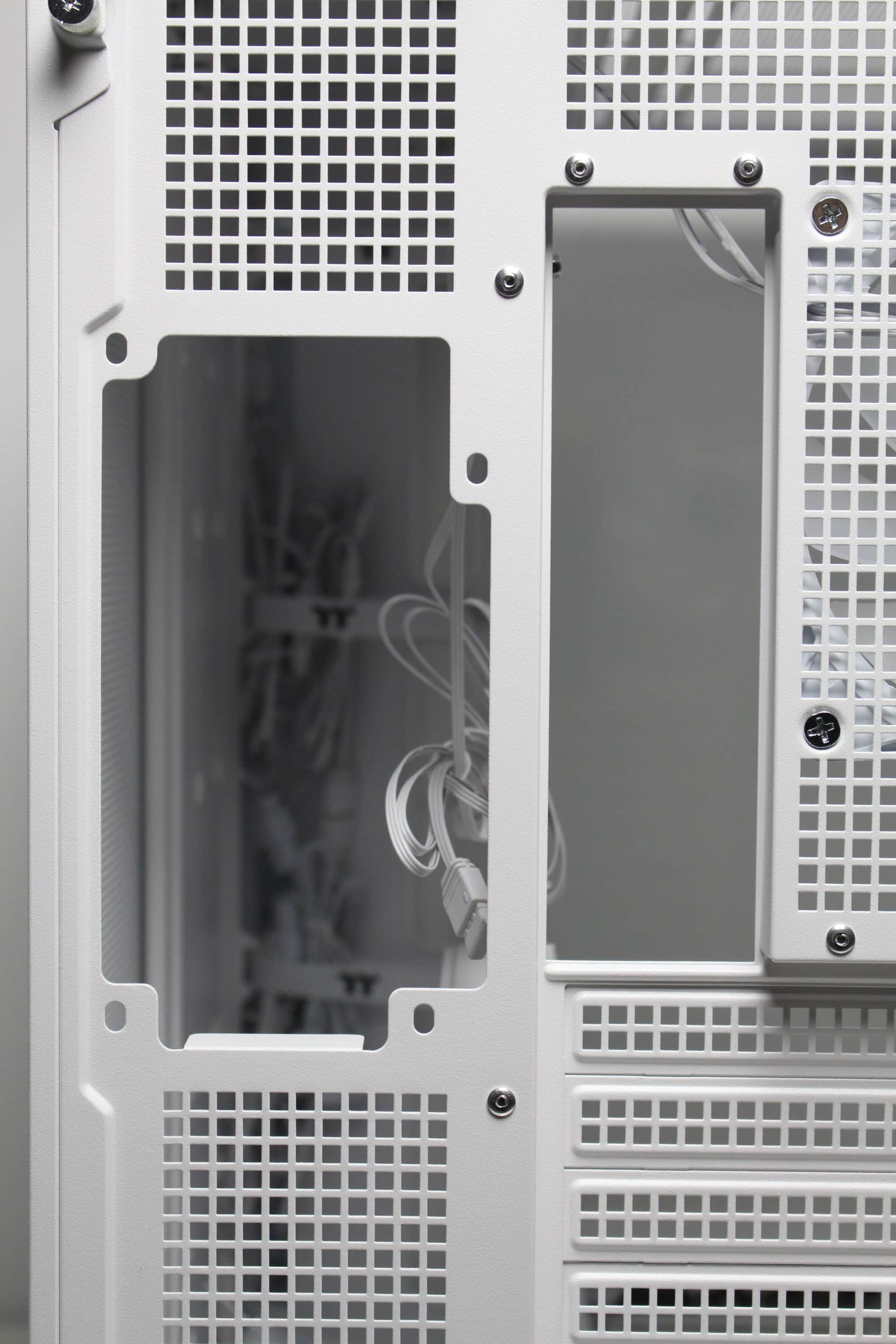 After we removed the right-hand side panel, the first thing we noticed was a large white surface that covers about half of the second chambers. The surface serves as a mounting point for several data carriers and can simply be opened after loosening two screws. The very spacious power supply compartment is then revealed behind it. In addition to the space for the power supply unit, Thermaltake has also equipped the rear with numerous eyelets for cable ties and three reusable Velcro strips. So there should be no cable management problems in the View 380 XL TG ARGB.