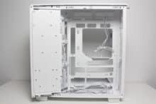 The installation and cabling of our test system was completed quickly and went off without a hitch. The basic space conditions are very generous and there is enough room to work everywhere. In addition, the pre-installed spacers, the knurled screws and the push-pin assembly of the side panels saved a considerable amount of time. Finally, the cable management system is also well thought out and there are useful cable feed-throughs and attachment points for cable ties everywhere. The overall result looks neat, but without radiators and a particularly long graphics card, there is a lot of yawning emptiness in the interior.
