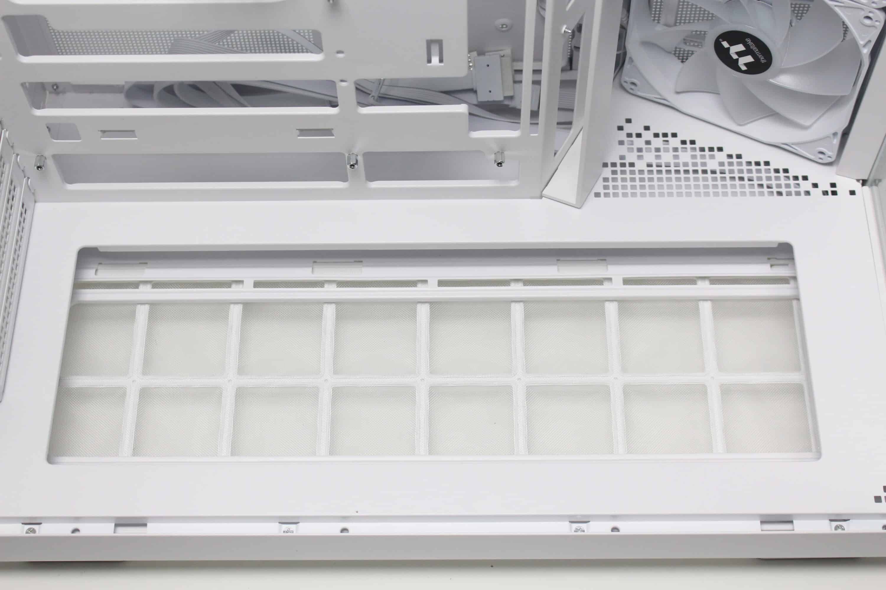 The Thermaltake View 380 XL TG ARGB has four stable plastic feet that have been covered with a layer of rubber to minimize vibrations and protect the surface. The manufacturer has also had a less restrictive ventilation opening with mounting points for up to three 120 mm fans cut into the underside. A fine-mesh dust filter has been placed above this, which can be easily removed to the front for cleaning.