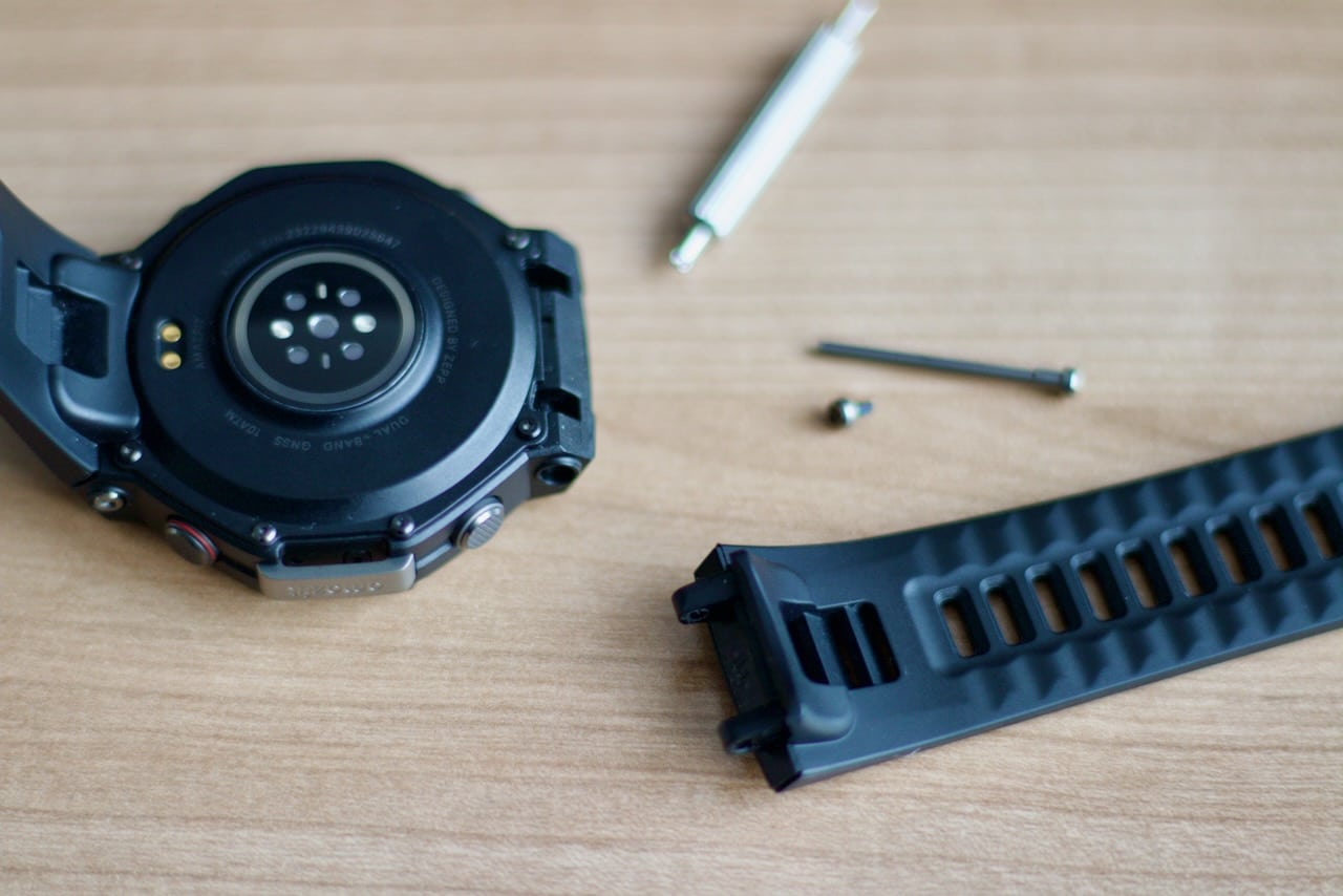 The watch strap is interchangeable, but requires a special screwdriver, which is included in the scope of delivery. The wristband supplied has two sturdy straps that do not slip thanks to special fixing elements. This ensures a secure fit, even during intensive movements or long periods of wear. Overall, the Amazfit T-Rex 3 combines a functional design with a robust and sophisticated finish that is both visually and practically impressive.