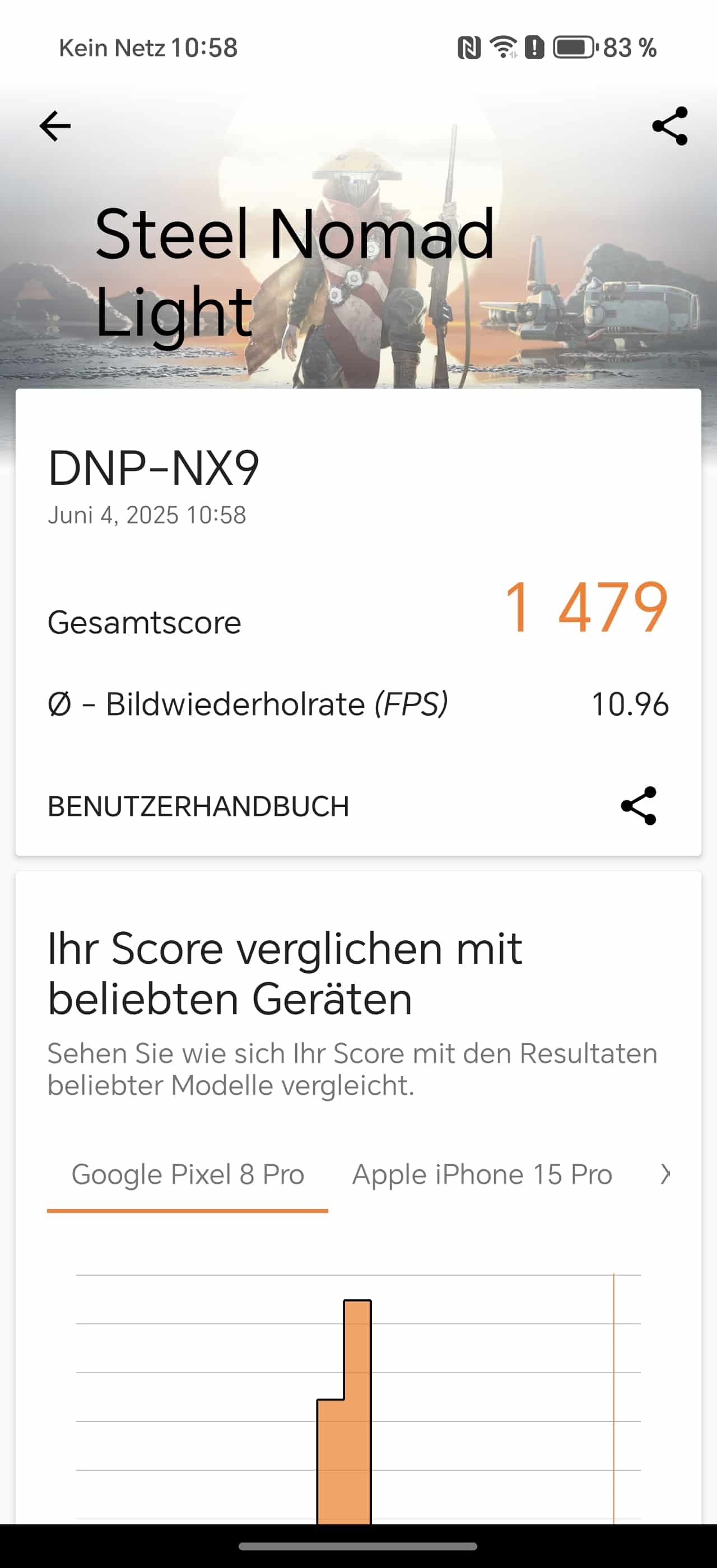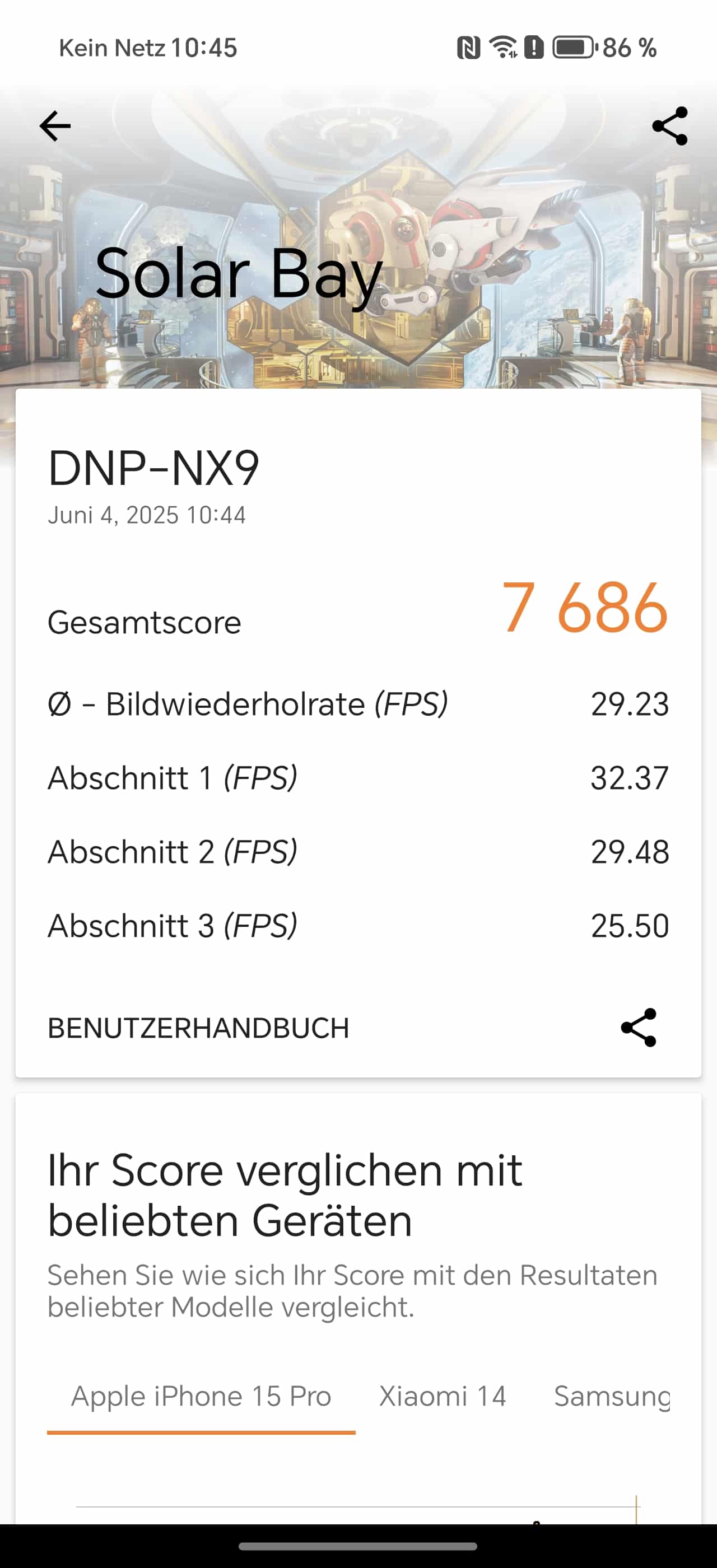 However, weaknesses are once again evident in the stress test, in which the 3DMark Steel Nomad Light benchmark is run 20 times in succession. Here, the HONOR 400 Pro “only” achieves around 76% – still significantly better than the HONOR 200 Pro (65%), but far from the top. The performance is therefore noticeably reduced after ten runs.