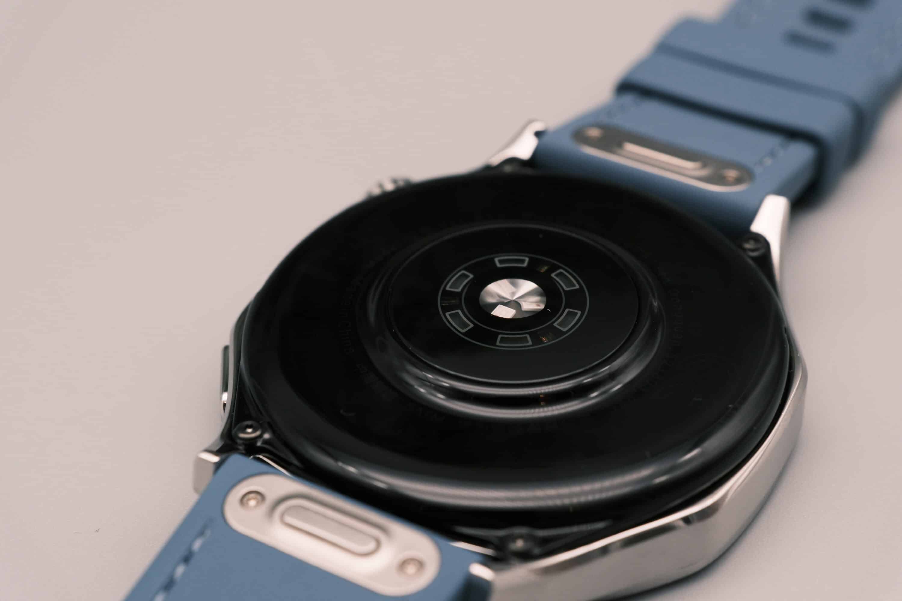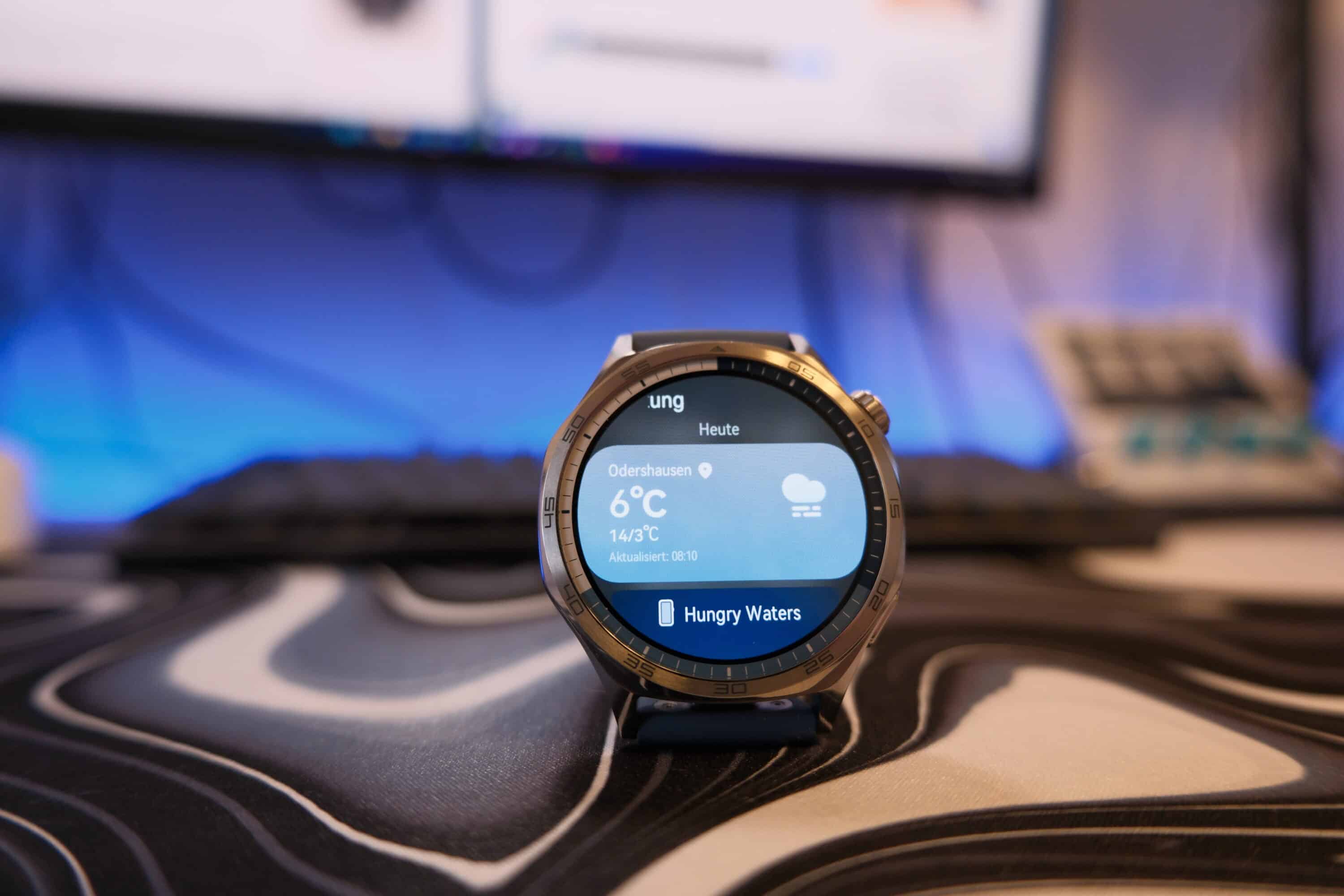 No matter which model you choose: The Huawei Watch GT5 looks absolutely classy and is excellently made. Our blue test model features a three-colored ring below the bezel, while all variants share the clickable and rotatable metal crown and the button underneath, which can be freely assigned in the companion app.