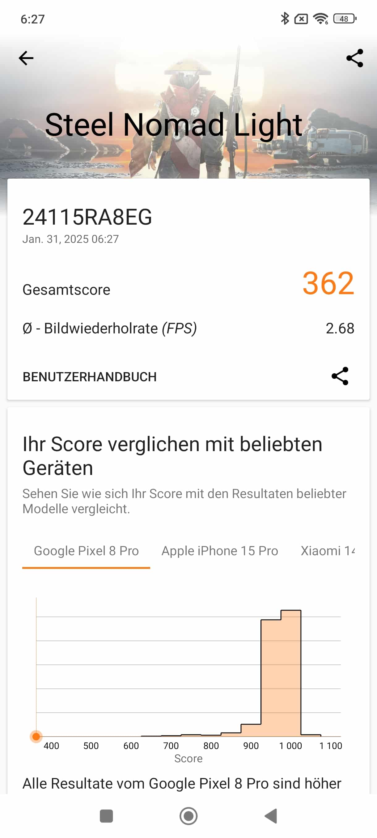 The 8-core CPU is based on three clusters. Four cores calculate at 1.8 GHz, three cores at 2.4 GHz and one at 2.5 GHz. Nevertheless, the device cannot stand out from its predecessor’s MediaTek Dimensity 7200 Ultra in terms of system performance, but delivers a very convincing single-core performance. It also comes with 8 or 12 GB of RAM and up to 512 GB of system memory.