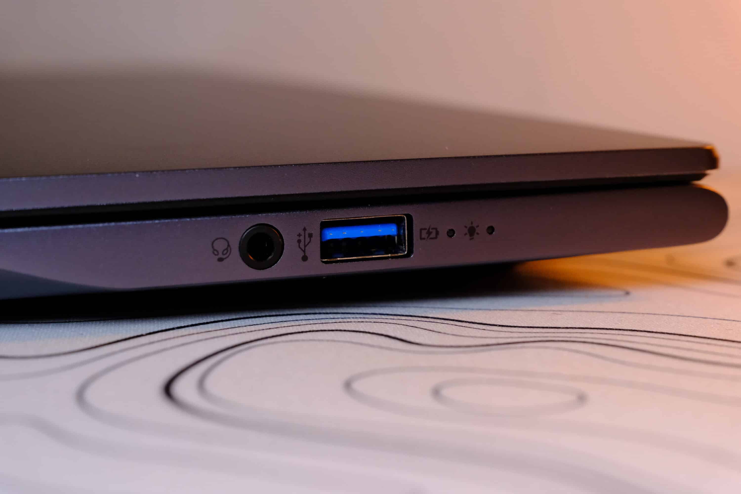 On the right-hand side there is another USB-A 3.2 port and a 3.5 mm jack connection. That’s it. Unfortunately, there is no card reader. If you need one, you’ll have to use a USB hub or a docking station.