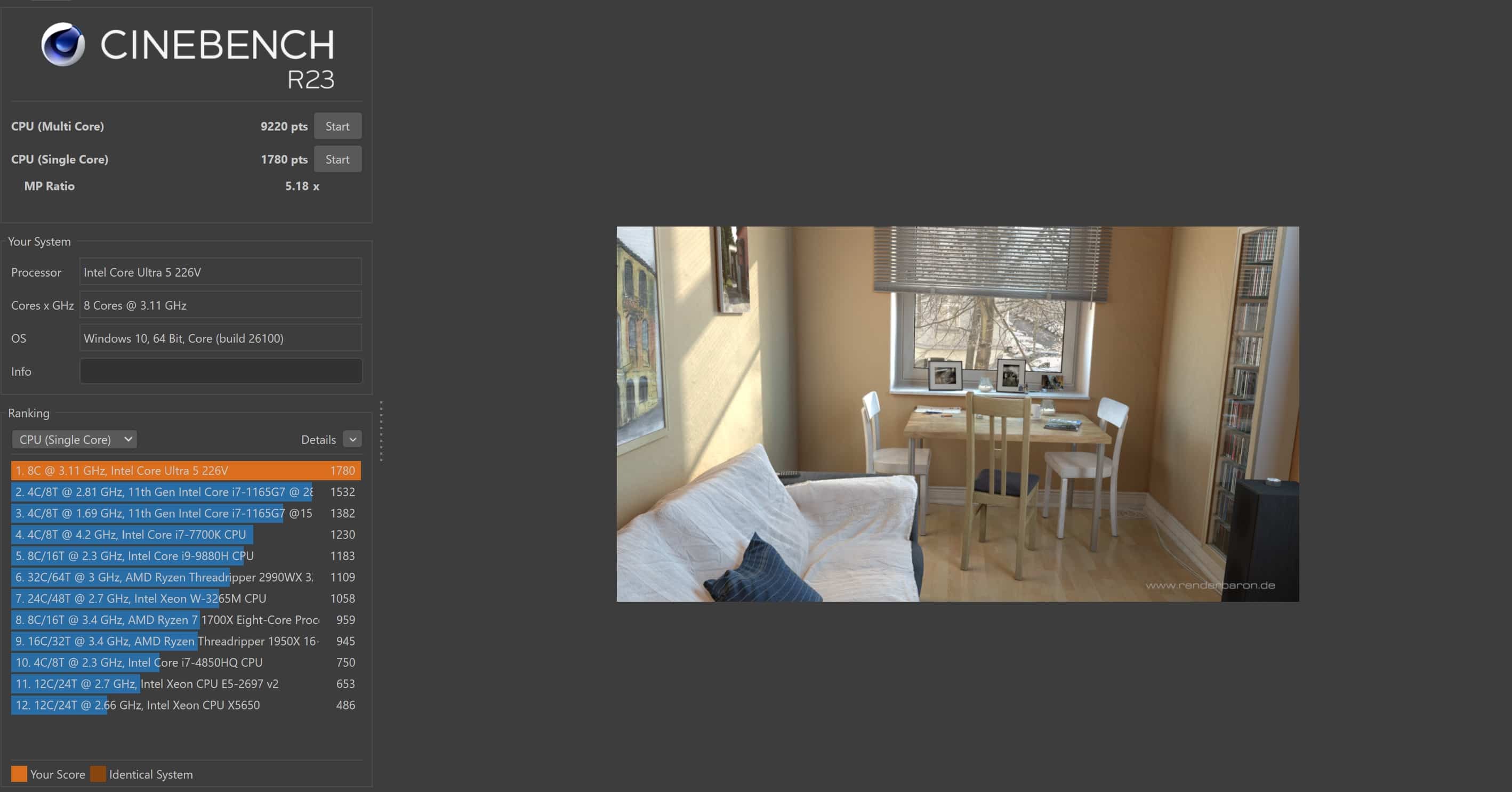Instead, the manufacturer equips the notebook with the latest mid-range processor from Intel, namely the Intel Core Ultra 5 226V. The Lunar Lake chip combines 8 cores with 8 threads and clock speeds of 2.1 GHz to 4.5 GHz. It also promises outstanding energy efficiency, not least thanks to 3 nm production.