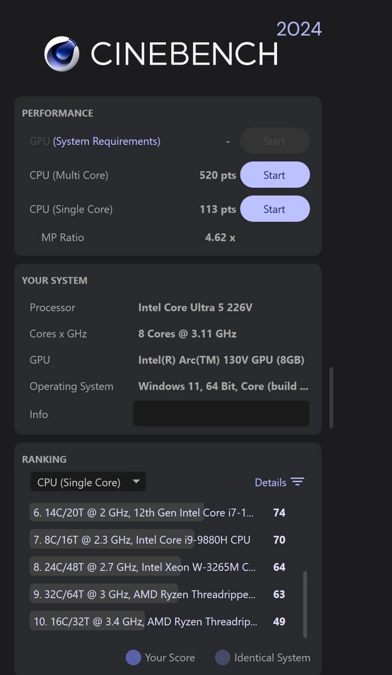When it comes to pure multi-core CPU performance in Geekbench or Cinebench, however, the Core Ultra 5 is at a disadvantage, sometimes significantly so. Of course, this is also due to the number of cores and the higher TDP. However, the notebook makes up for this deficit in the PCMark 10 test, while the single-core values are clearly ahead.