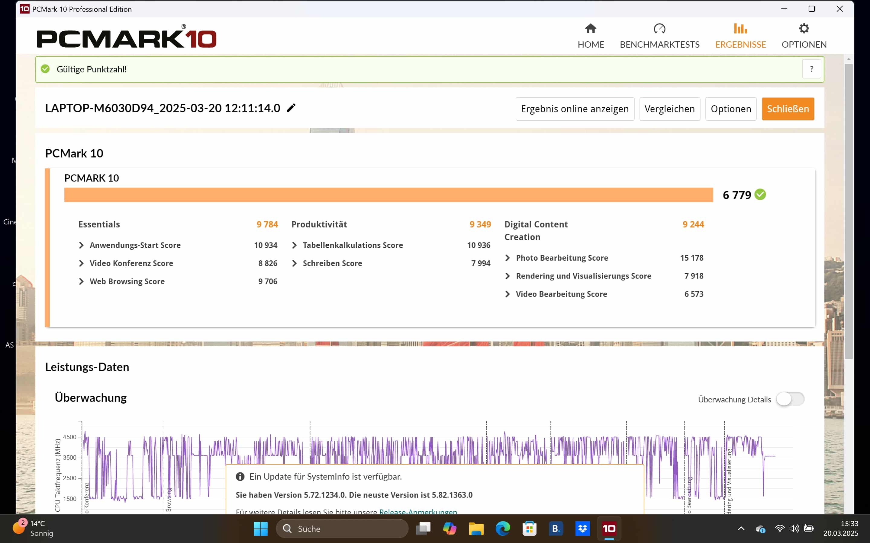 I measured the productivity and system performance with PCMark 10 and Cinebench R23. PCMark 10 simulates different workflows when running the benchmark, which include word processing, surfing the Internet and spreadsheets. Cinebench, on the other hand, measures the speed of the CPU cores individually and in multi-core mode.