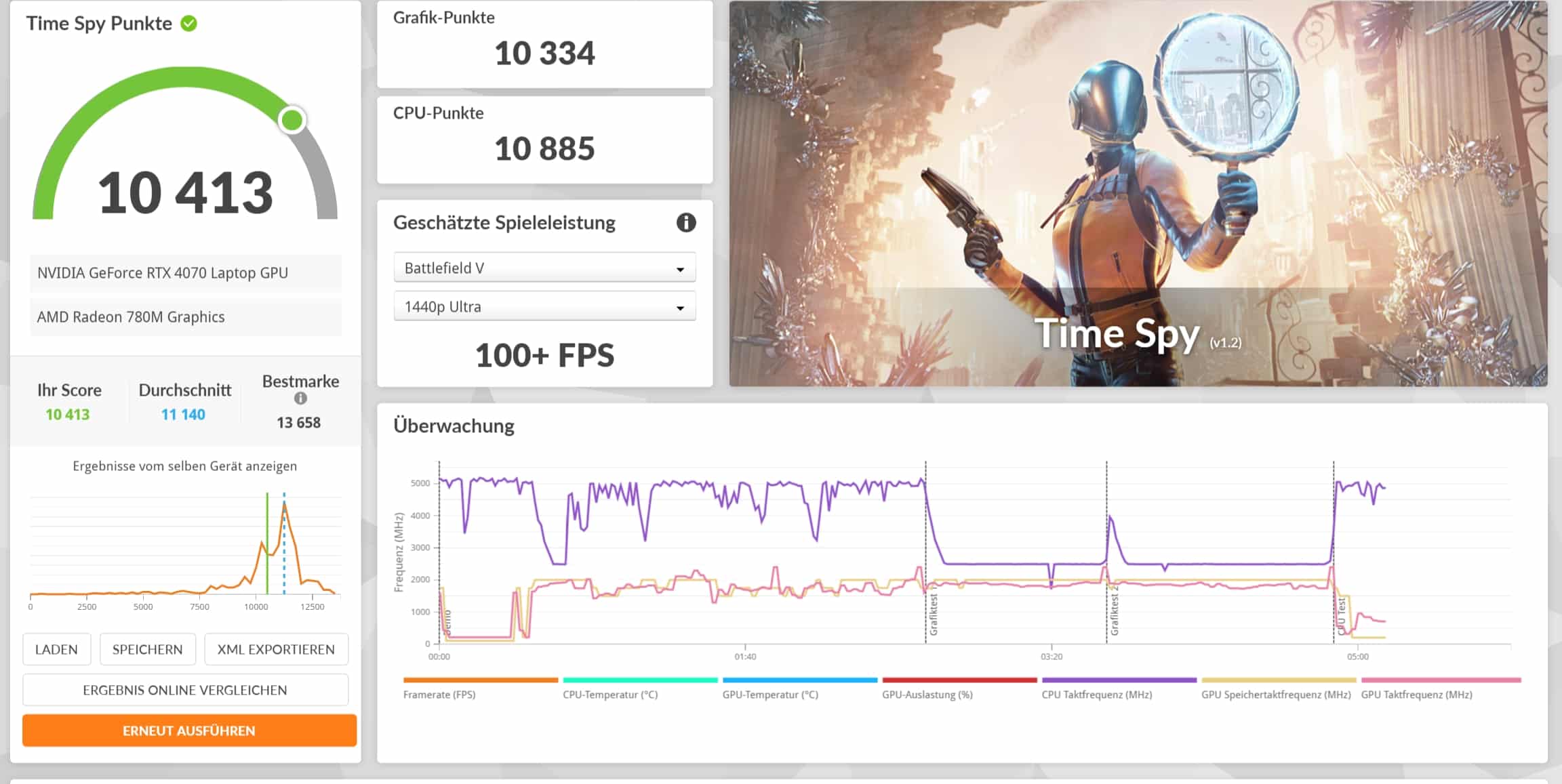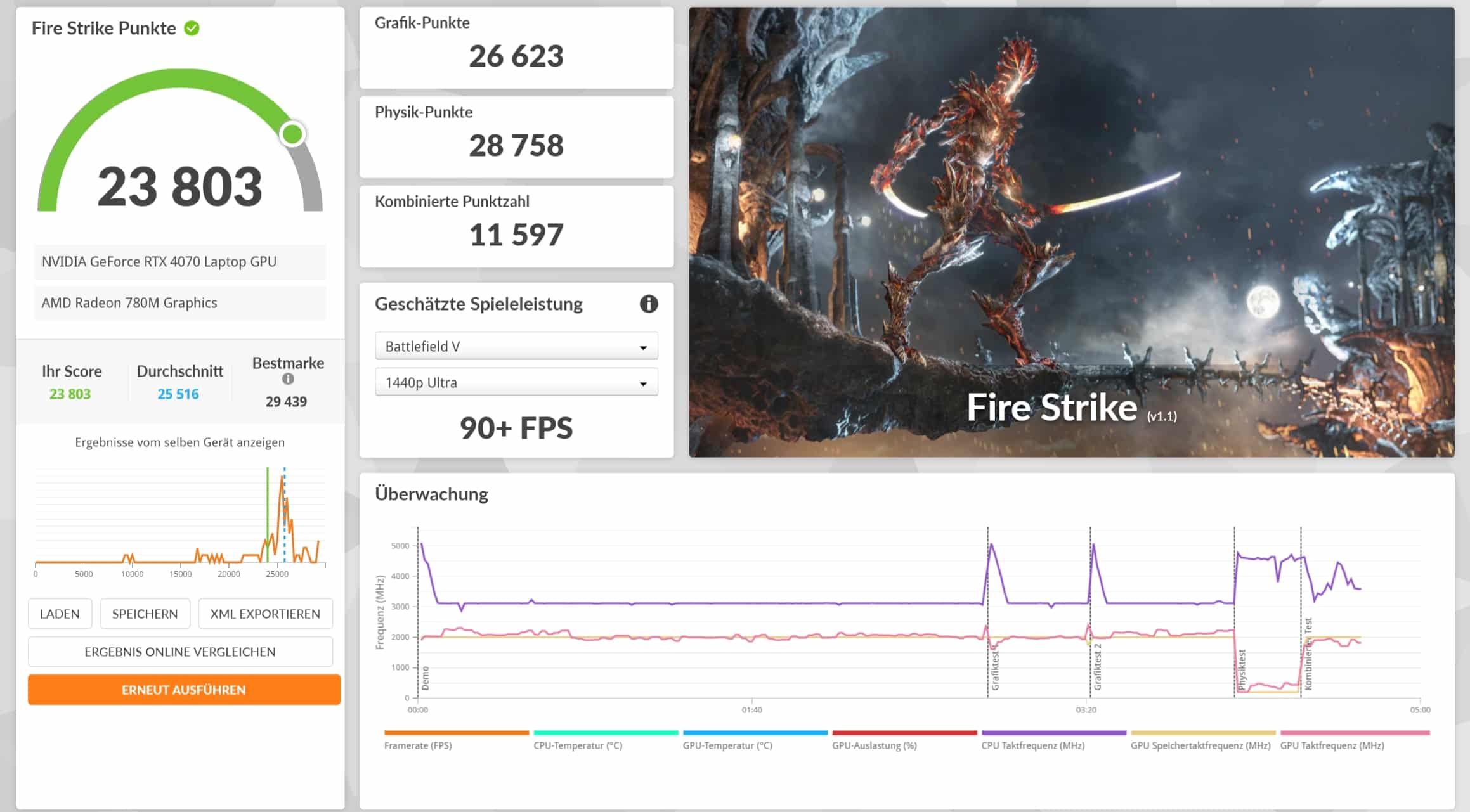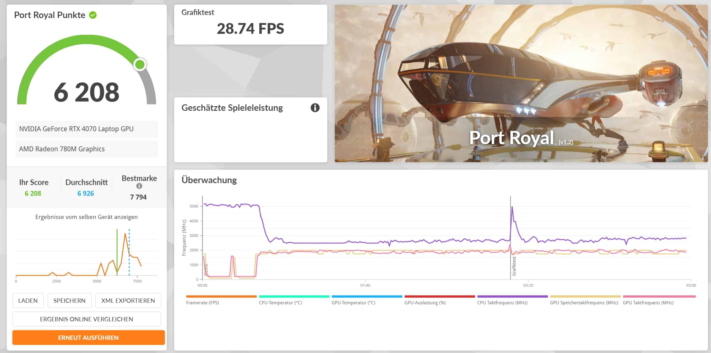 In general, the notebook offers enough reserves to also play current games in 3K or 1440p with maximum details. With a slight reduction in the level of detail, three-digit frame rates can be easily achieved. However, you should reduce the level of detail or the resolution a little for absolute graphics powerhouses with maximum ray tracing settings in order to achieve a smooth 60 fps.