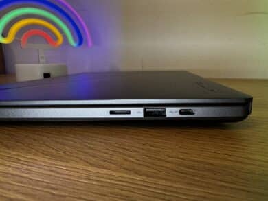 On the right, there is also space for a USB-A 3.2 Gen.2 (10 Gbit/s), USB-C 3.2 Gen.2 (10 GBit/s, DisplayPort Alt mode) and a microSD card reader. The card reader also scores with outstanding speeds.