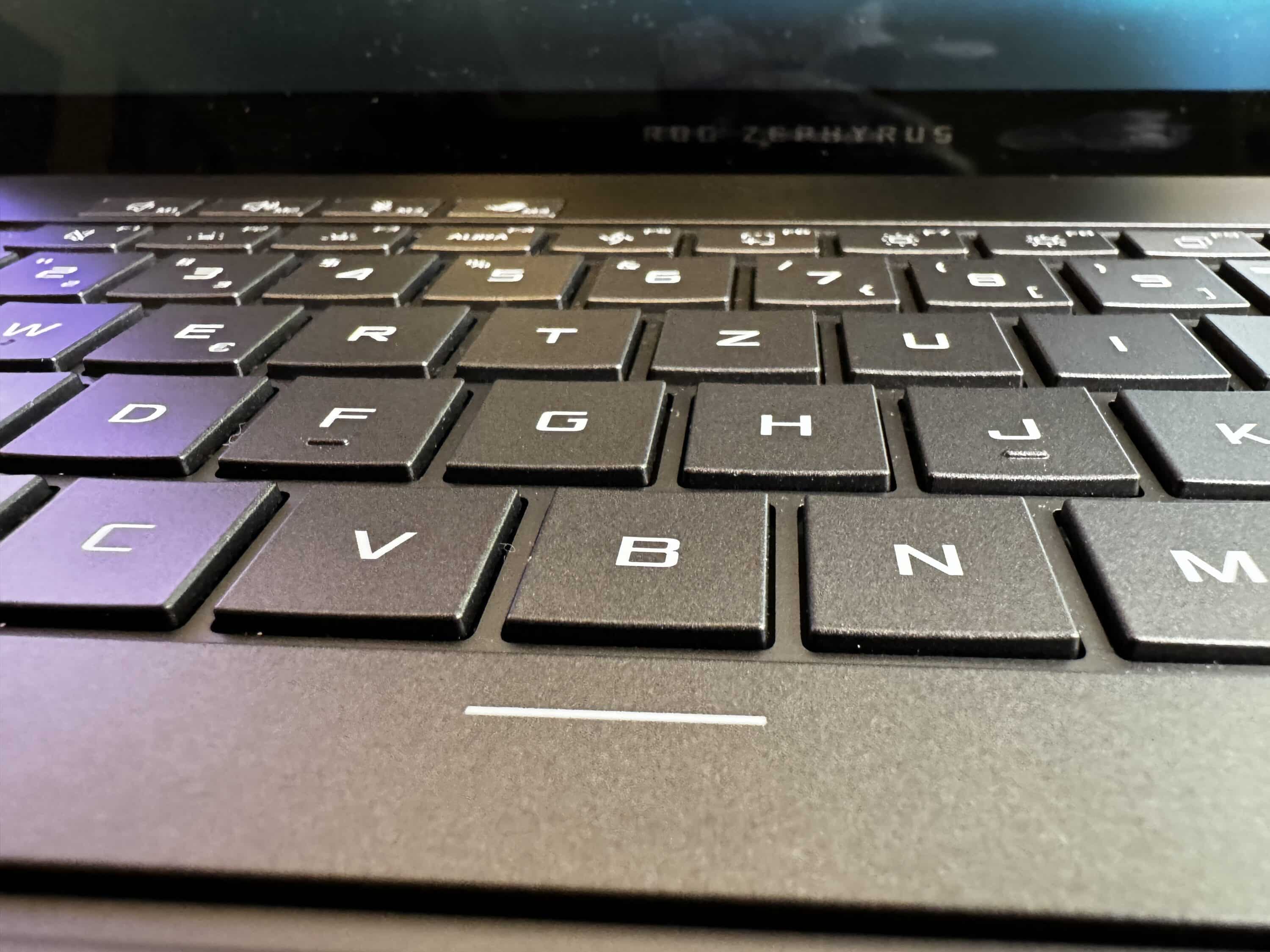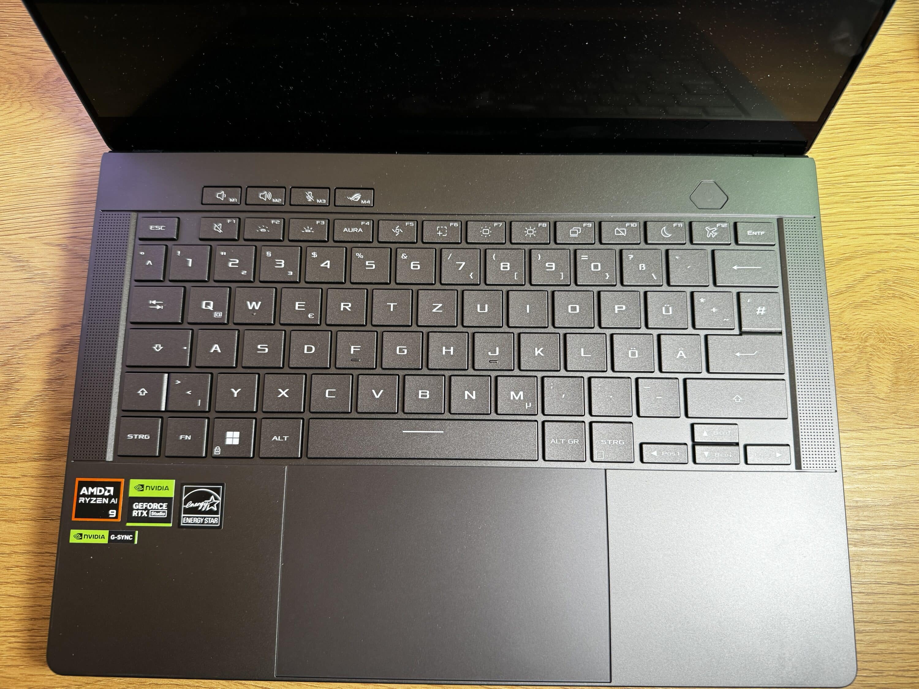In terms of input devices, the ASUS ROG Zephyrus G14 (2024) relies on a compact chiclet keyboard with customizable RGB lighting, which scores with an outstanding key travel of 1.7 mm and thus provides an excellent typing experience. The ASUS-typical font is of course a matter of taste. There is also a row of four programmable M-keys above the F1-F4 keys.