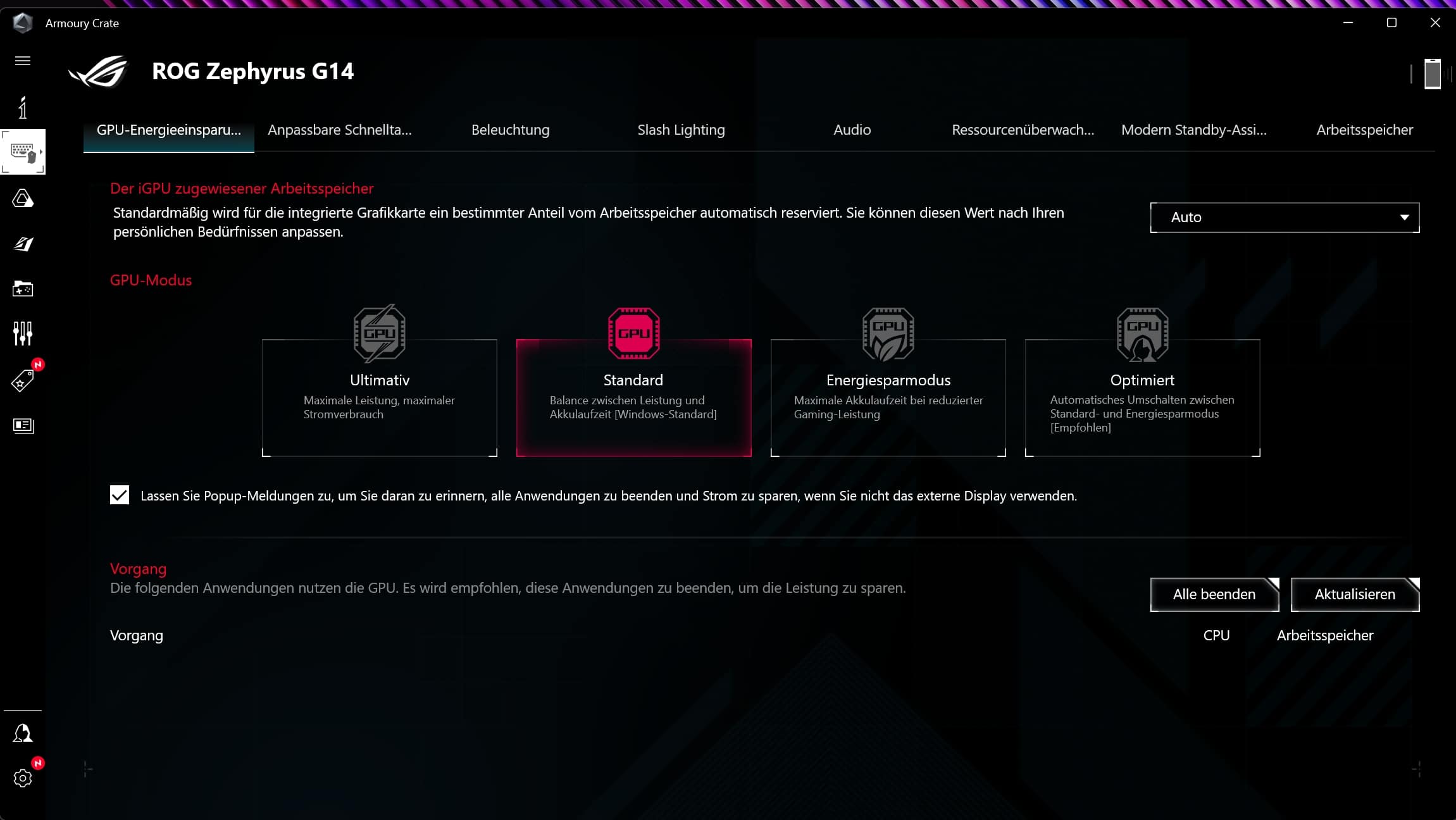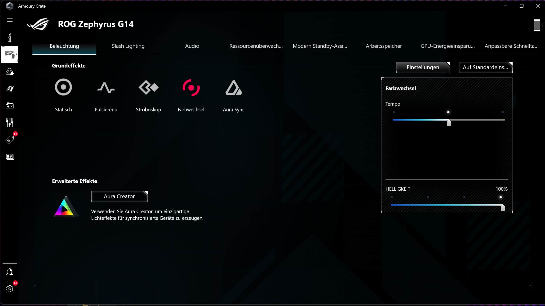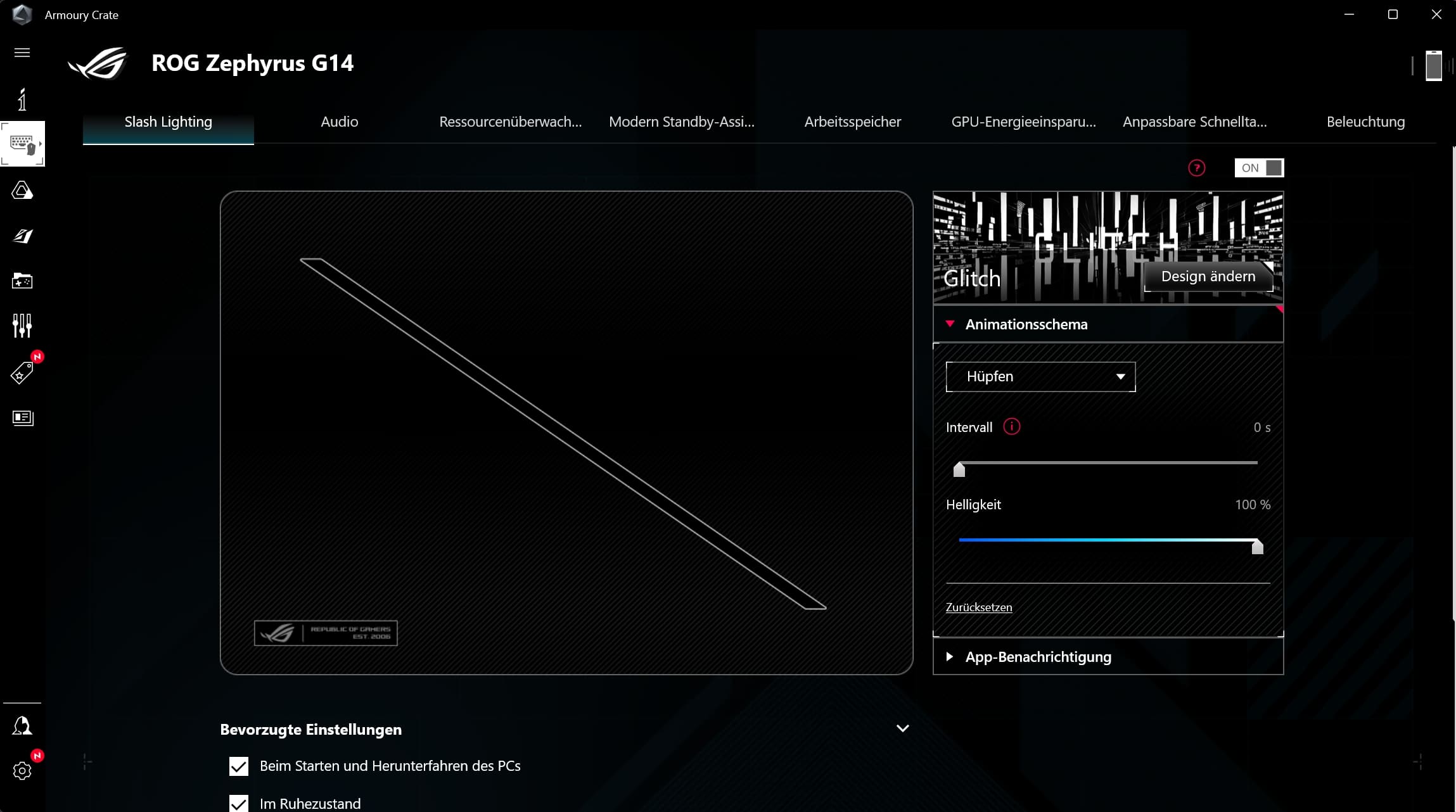The ASUS ROG Zephyrus G14 (2024) can be configured via the manufacturer’s Armory Crate software. Among other things, system parameters and temperature can be viewed here, the RGB lighting of the keyboard can be adjusted or the slash lighting can be set. There are 15 pre-programmed animations to choose from, which can also be further customized if desired.