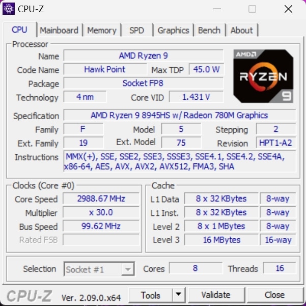 | Processor | AMD Ryzen 9 8945HS (8 cores, 4.0 – 5.2 GHz) |