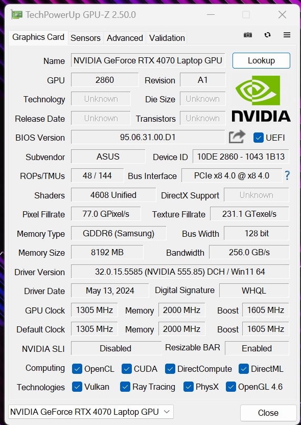 | Graphics performance | Nvidia GeForce RTX 4070 (8GB GDDR6 VRAM); 90 W TDP |
