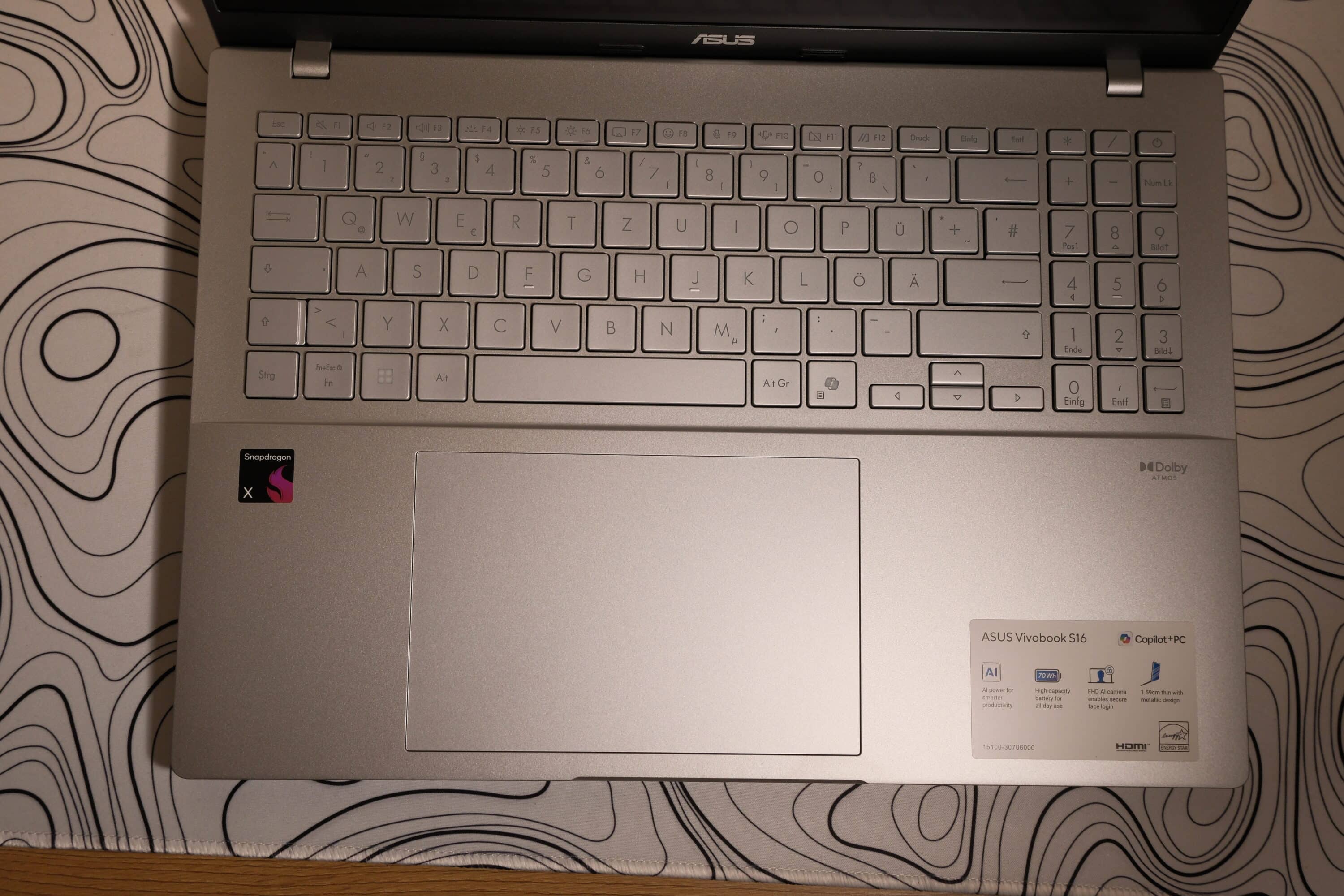 The ASUS Vivobook S 16 (S3607QA) deserves high praise for its keyboard, touchpad and display. The keyboard has a full-size layout including a numeric keypad and offers a very pleasant and comfortable typing experience thanks to a key travel of 1.7 mm. In addition, the keys are pleasantly large, which minimizes typing errors – with the exception of the arrow keys, however, which appear very small and squashed.