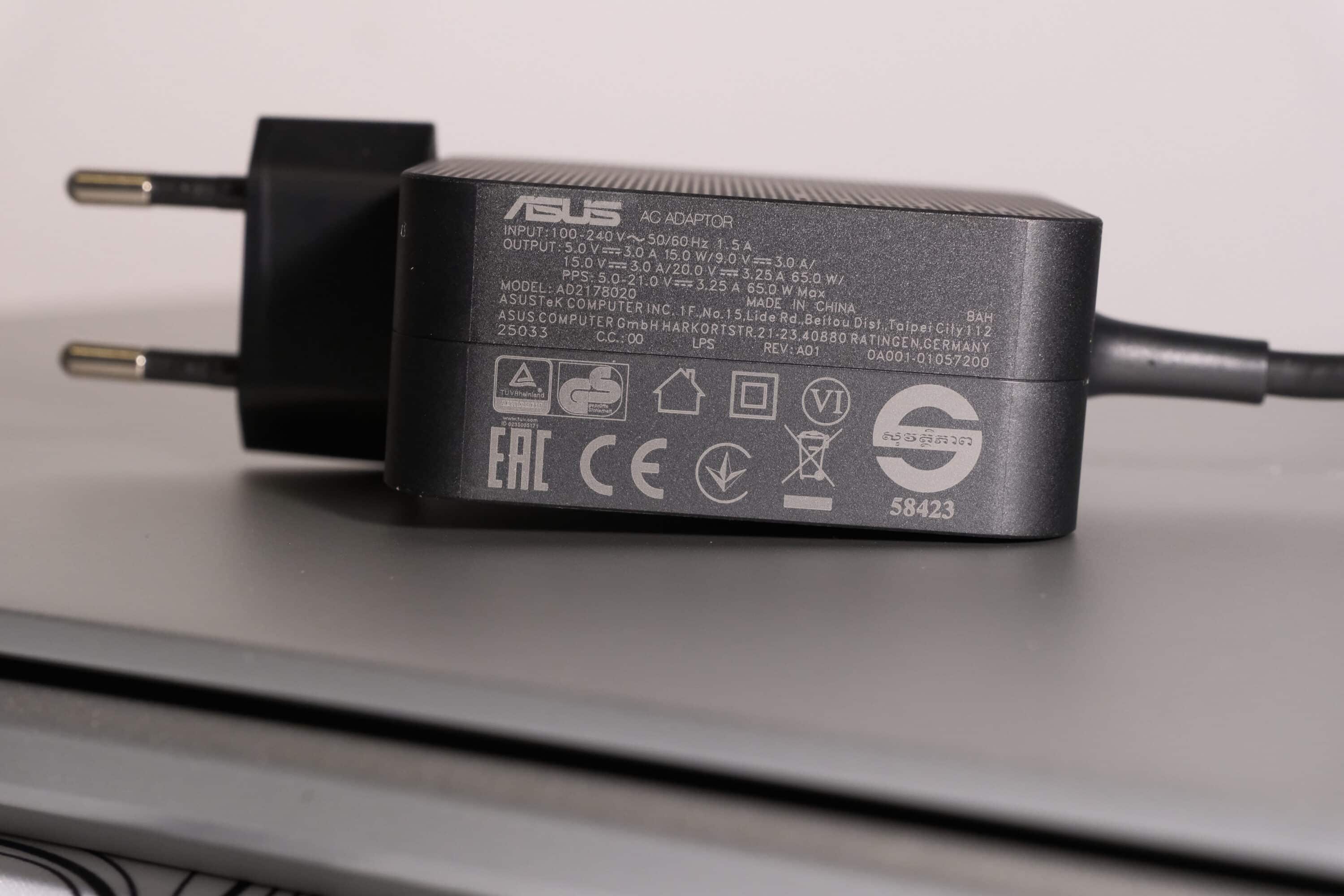 ASUS provides the laptop with a compact 65-watt power supply that fully charges the notebook in around one and a half hours. The only downside: The power supply uses USB-C and blocks the only available port when it is plugged in.
