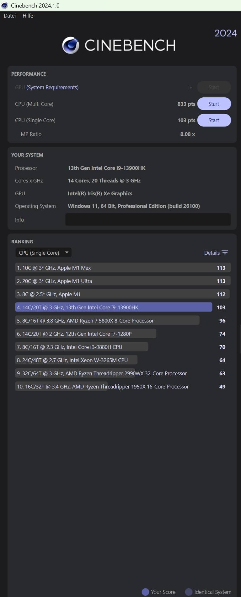 In terms of system performance, the installed Core i9-13900HK is at an expected level and ranks behind the AMD Ryzen 9 processors. Nevertheless, the performance is at a very good level and is absolutely sufficient for more demanding tasks.