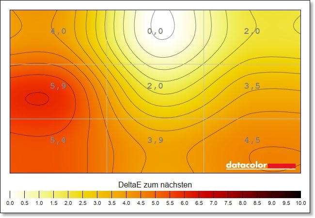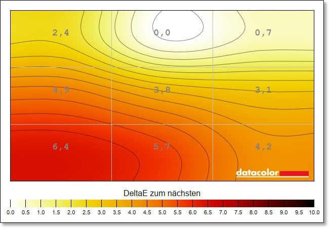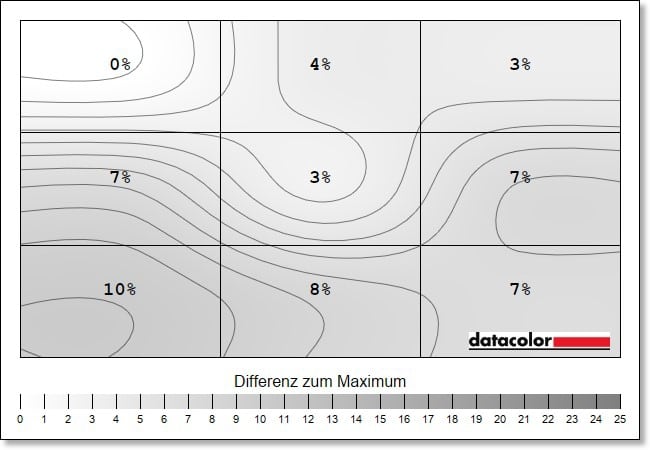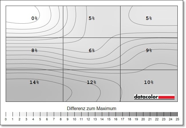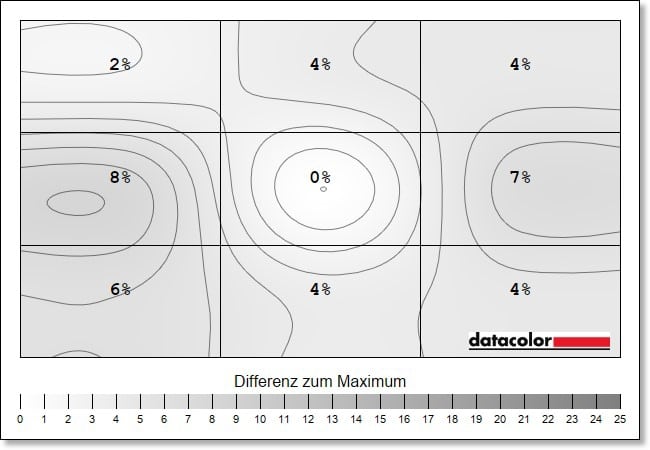 The AOC AGON Pro AG246FK performs quite well in terms of uniformity of illumination, i.e. luminance homogeneity. I measured a maximum deviation of 16 percent at a brightness value of 50 percent – again in the lower third – which decreases when you increase the brightness.